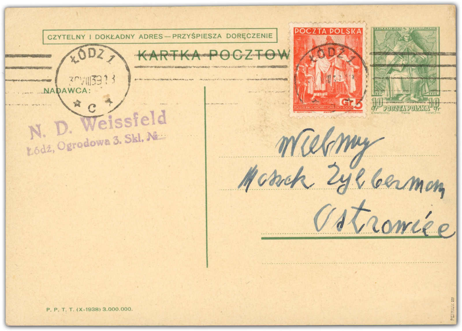 1938, 10 Gr. Ganzsachenpostkarte mit Zusatzfrankatur von 5 Gr. (Mi-Nr. 331), portogerecht als Inlandspostkarte verwendet, aufgegeben "LODZ 1 30.VIII. 39", adressiert nach Ostrowice, rückseitiger Text in Hebräisch, seltene Post, 36 Stunden