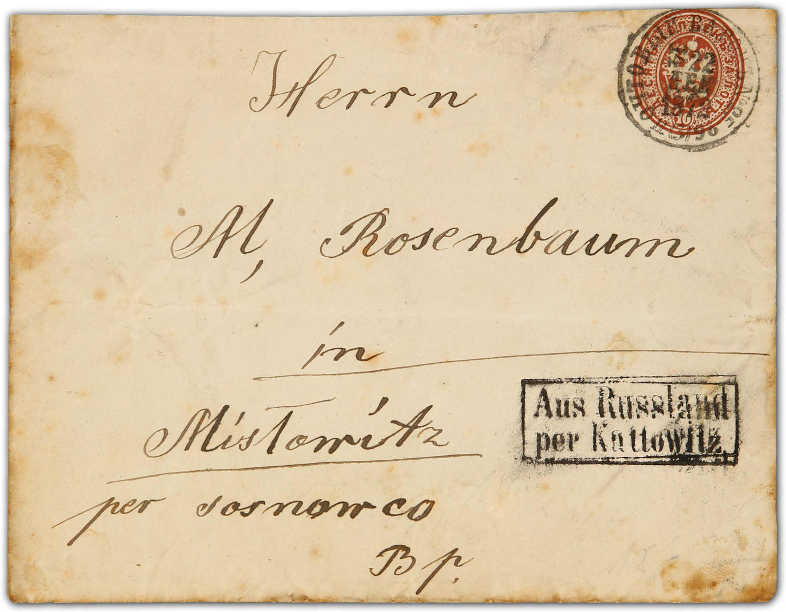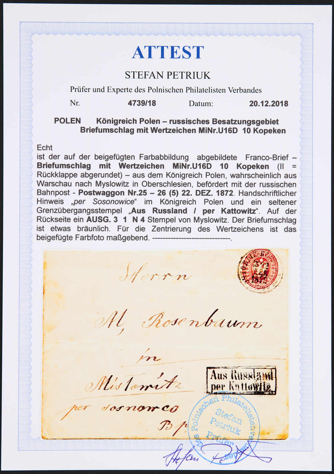 1872, Königreich Polen - russisches Besatzungsgebiet, 10 Kopeken Ganzsachenumschlag, befördert mit der russischen Bahnpost Postwaggon Nr. 25 - 26 (5) 22.Dez.1872, seltener Grenzübergangsstempel "Aus Russland / per Kattowitz", etwas