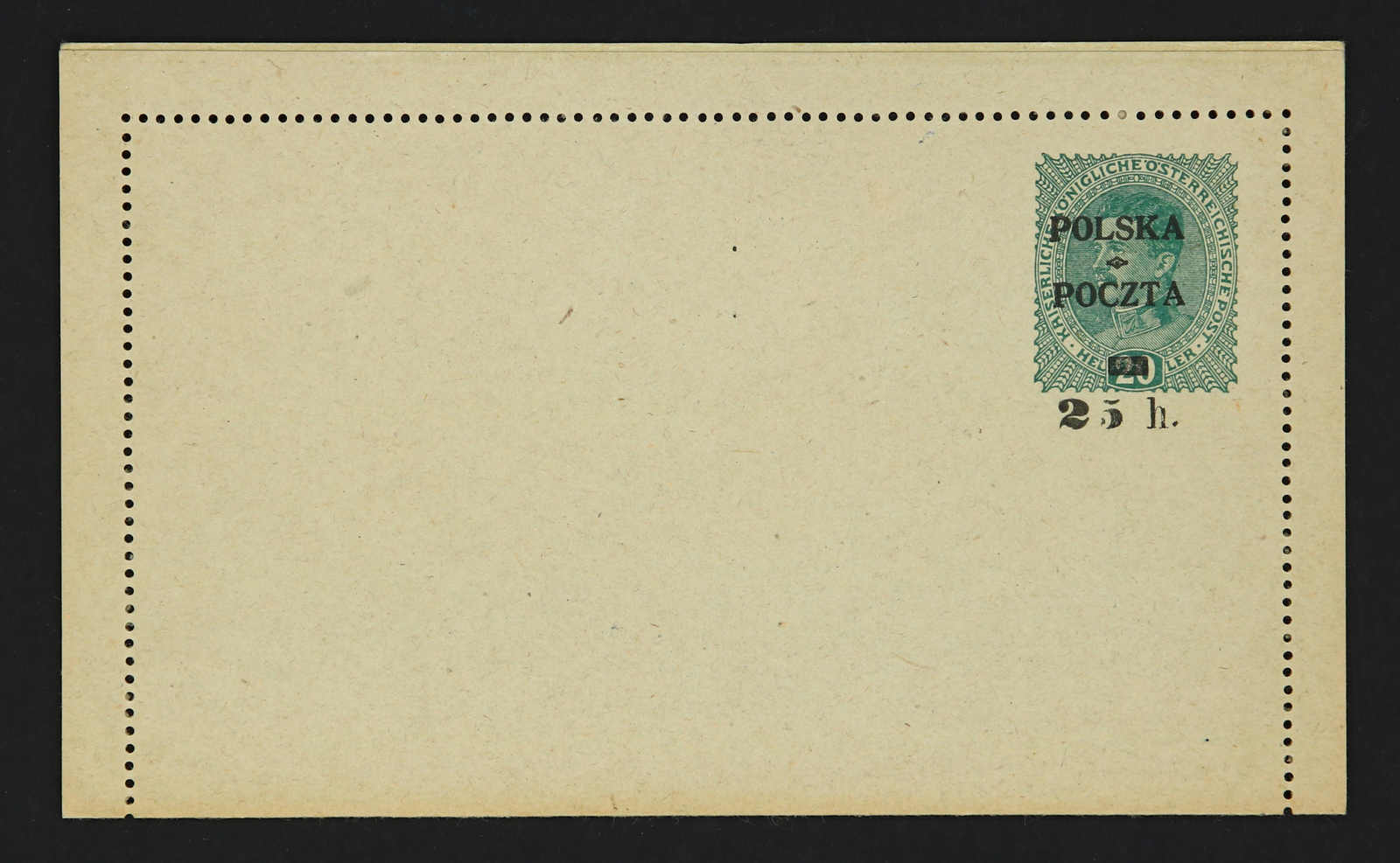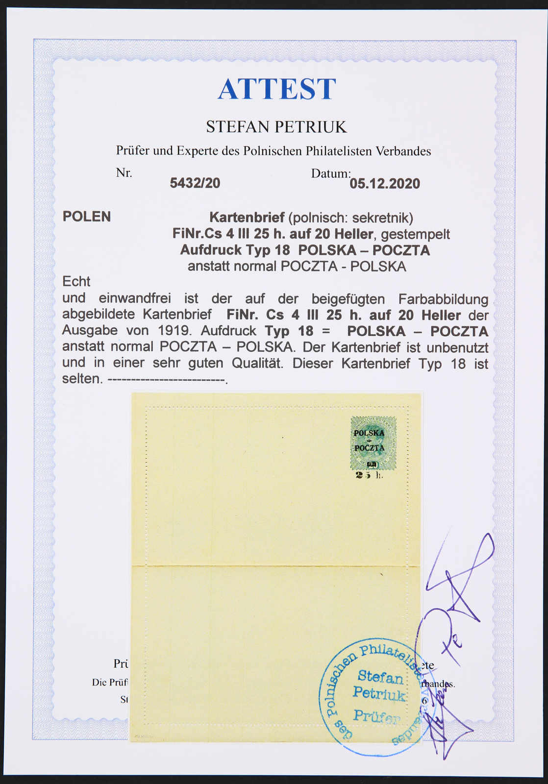 1919, 25 H. auf 20 Heller Kartenbrief, Aufdruck Typ 18 "POLSKA - POCZTA" anstatt "POCZTA - POLSKA", ungebraucht, einwandfrei, Fotoattest Petriuk PZF