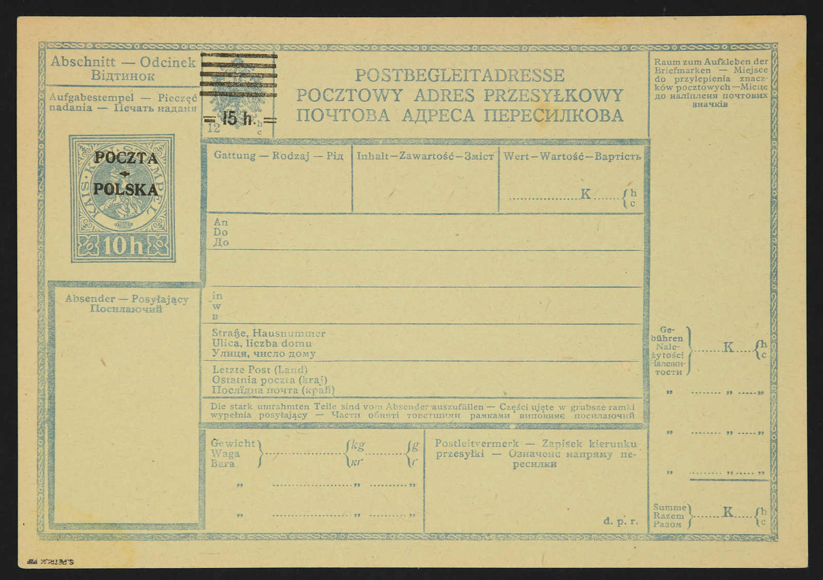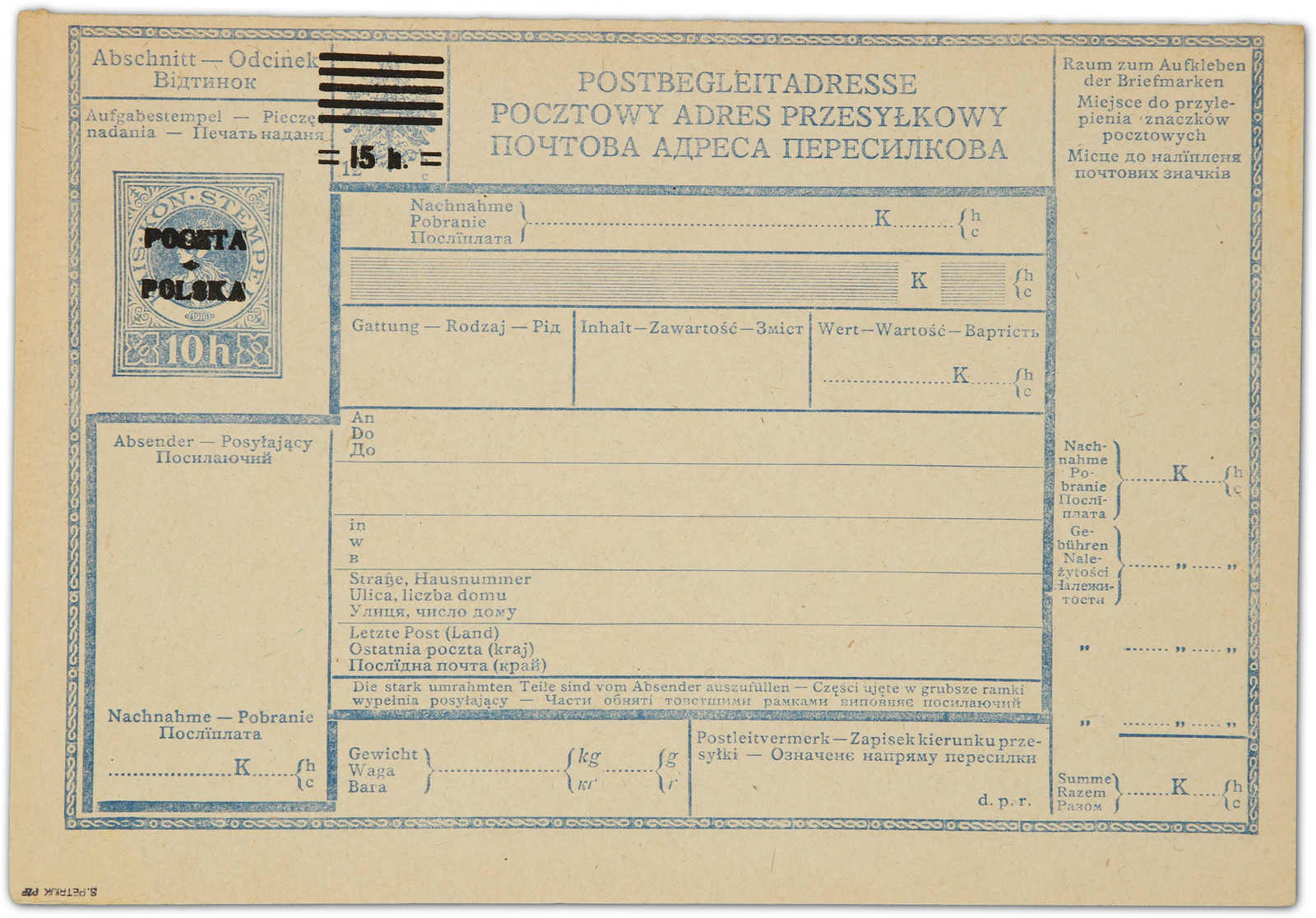 1919, Postbegleitadresse der Krakauer Ausgabe vom 10. Januar 1919. 15 hal/10(12) hal., npr (npr: n = deutsch, p = polnisch, r = ruthenisch). Die Postbegleitadresse ist ungebraucht und in einem sehr guten Zustand, Auflage unbekannt,