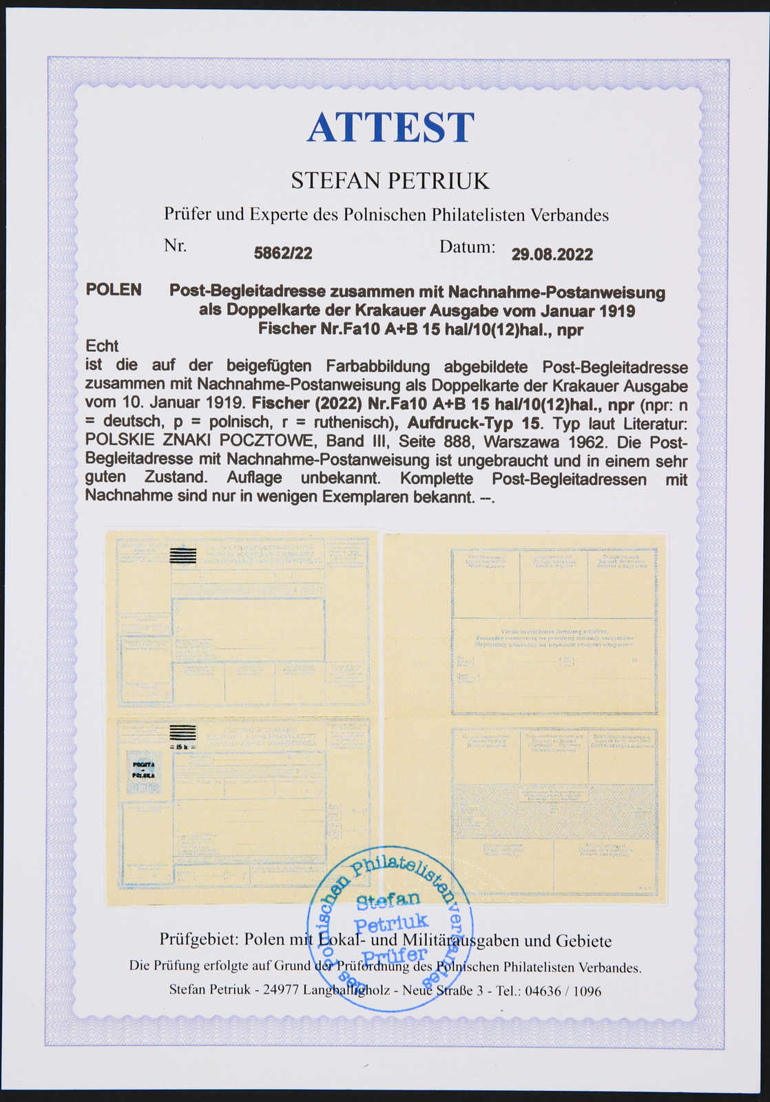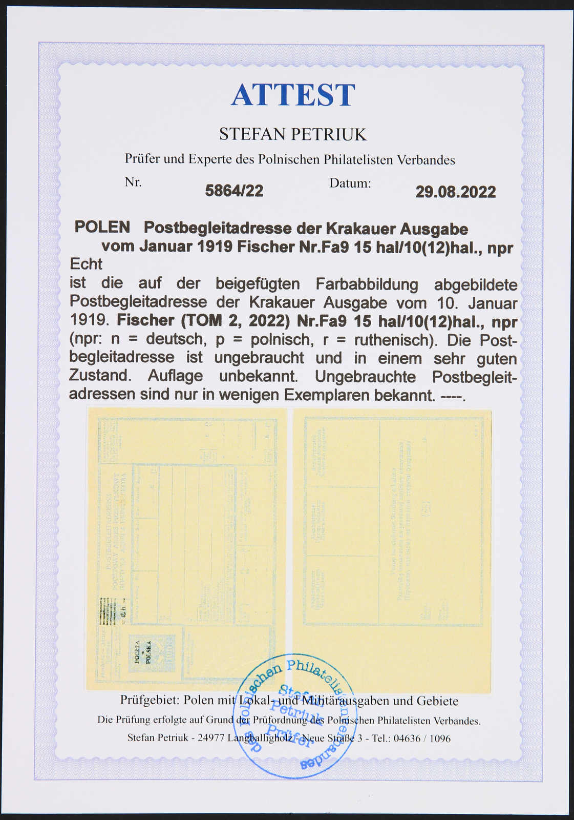 ungebrauchte Postbegleitadressen sind nur in wenigen Exemplaren bekannt, Fotoattest Petriuk (Image) (imagea)