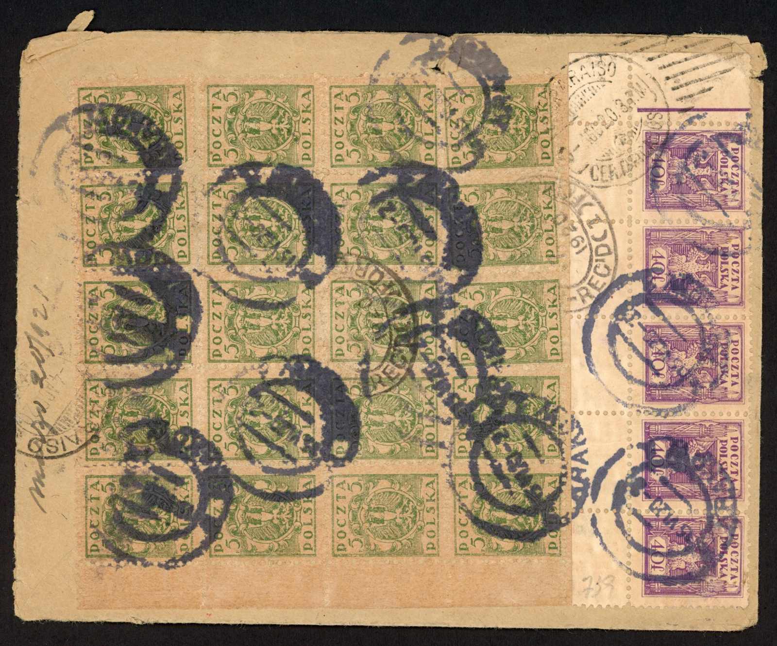 1920, 20mal 5 H. im Seitenrand-20er-Block und waagerechte 5er-Bogenecke poln. Adler rückseitig auf R-Brief (Einriss oben) mit österreichischem R-Zettel und umgearbeitetem Stempel "KRAKOW 15.6.20" mit aptiertem "KRAKAU", seltener roter