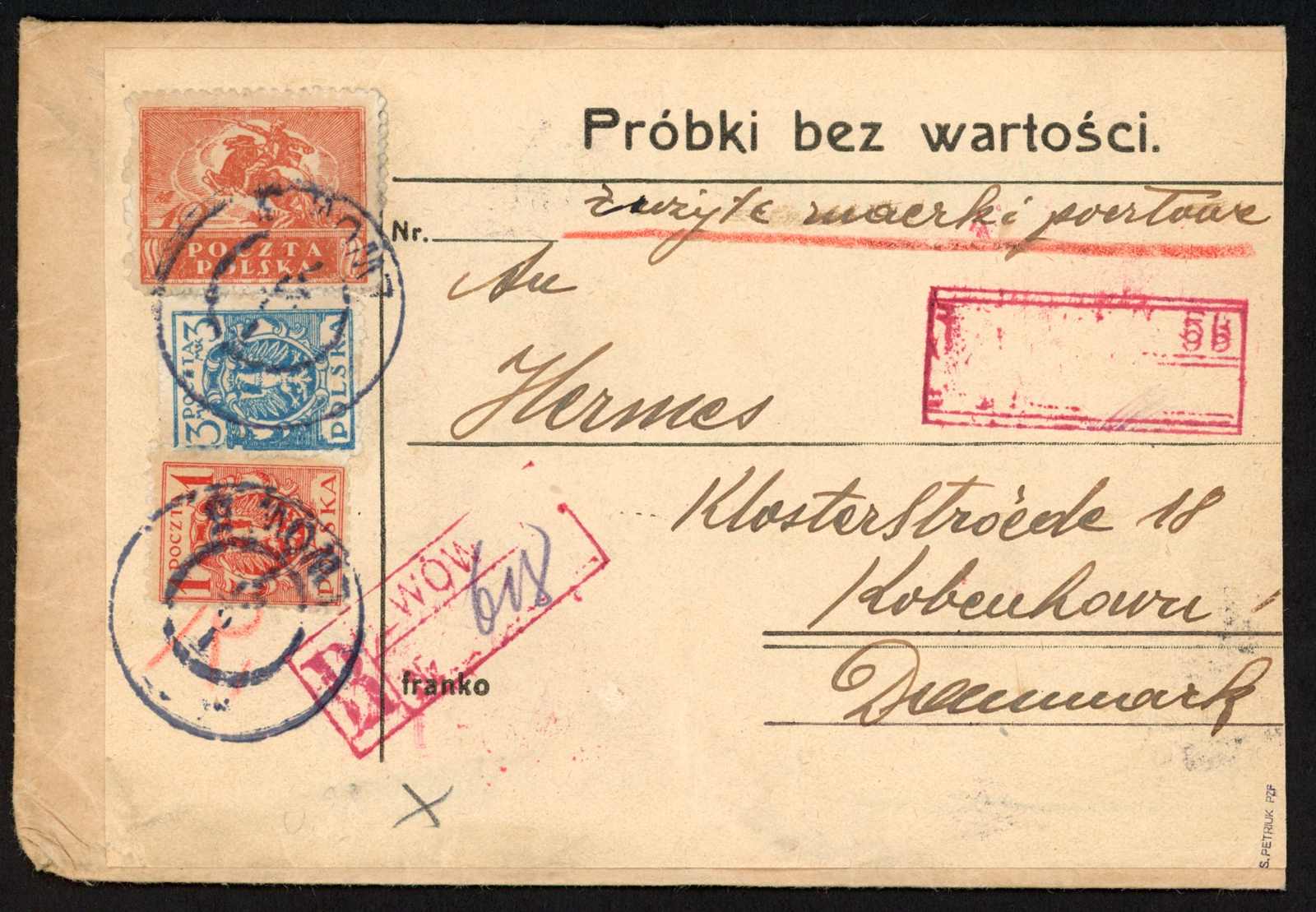 1921, 1 und 3 M. poln. Adler sowie 10 M. Reiter auf Einschreiben "Proben ohne Wert" nach Dänemark, umgearbeiteter österr. Stempel "LWOW 1.7.21" (Lemberg aptiert), seltene Portostufe vom Beginn der Inflationszeit, Marken mit üblicher