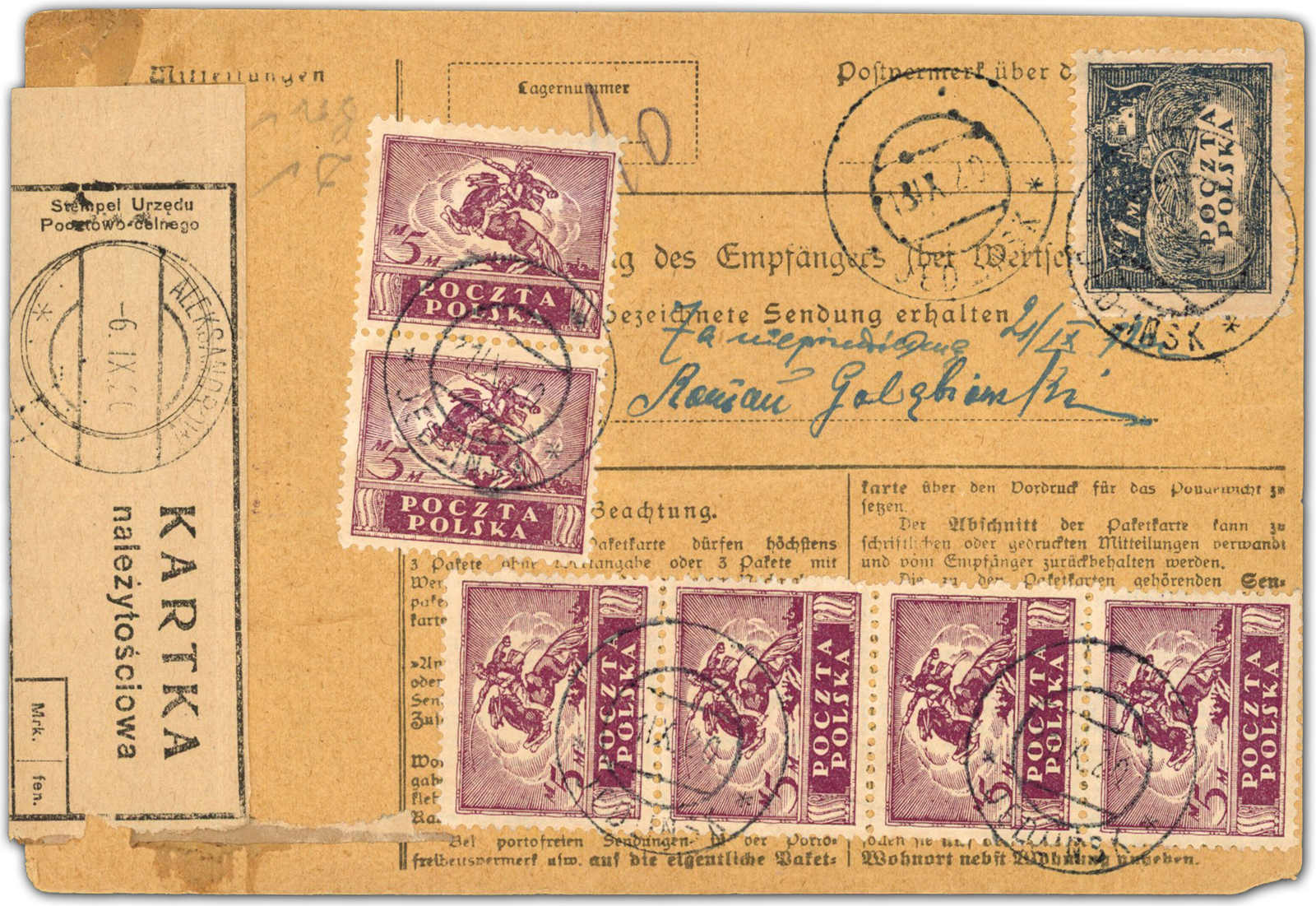 1920, 1 M. Kornspeicher und 5 M. Reiter (6) auf seltener kompletter deutscher Paketkarte für ein Paket aus den USA über das Postamt Gdansk, weiter über Zollamt Aleksandrowo 6.9.1920, anhängend Vordruck für die Zollabrechnung,
