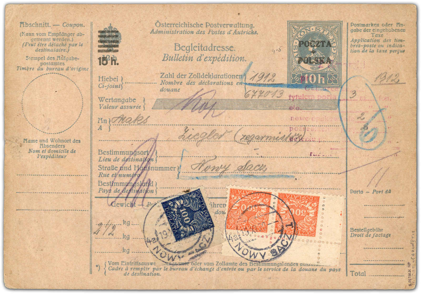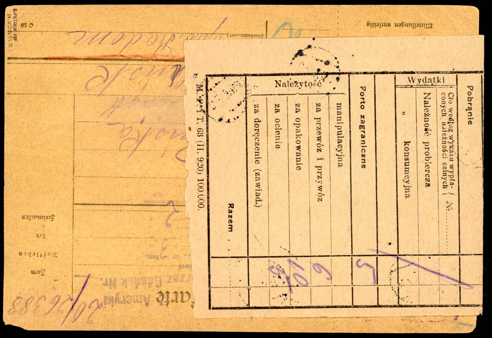 1920, sehr seltene österreichische Paketkarte FiNr. Ca 2 xd Type 12 für ein Paket aus den USA über das Postamt Gdansk, weiter über Tarnow 2 nach Nowy Sacz 19.11.20, polnische Nachportomarken für die Zustellgebühr, senkrecht gefaltet,