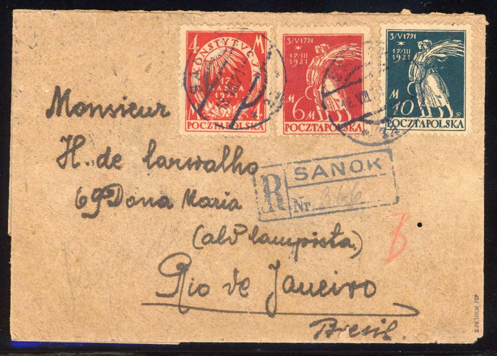 1921, R-Brief aus Sanok 18.8.1921 mit 6 Werten ex Mi-Nr. 164-170 vorder- und rückseitig vom Inflationsbeginn mit der für die damalige Zeit sehr seltenen Destination Brasilien, sign. Petriuk (Image)