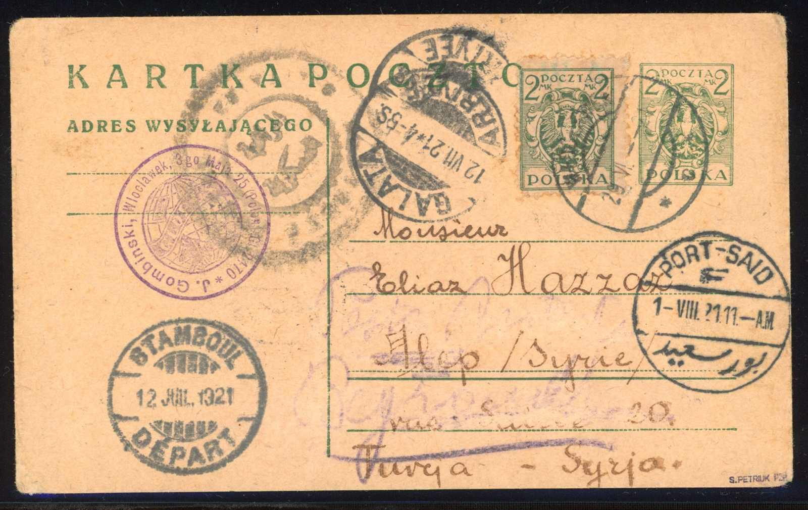 1921, 2 M. Ganzsachenpostkarte poln. Adler mit bild- und wertstufengleicher Marke ab "WLOCLAWEK 28.6.21" mit der für die damalige Zeit sehr seltenen Destination Syrien, sign. Petriuk (Image)