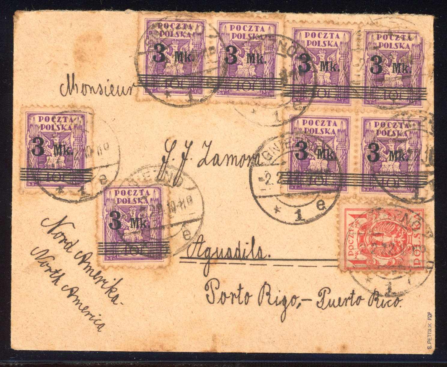 1922, 1 M. poln. Adler mit 3 M. auf 40 F. Aufdruckmarke (8) auf Brief ab "GNIEZNO 2.2.22" mit der für die damalige Zeit sehr seltenen Destination Puerto Rico, Altersspuren, sign. Petriuk (Image)