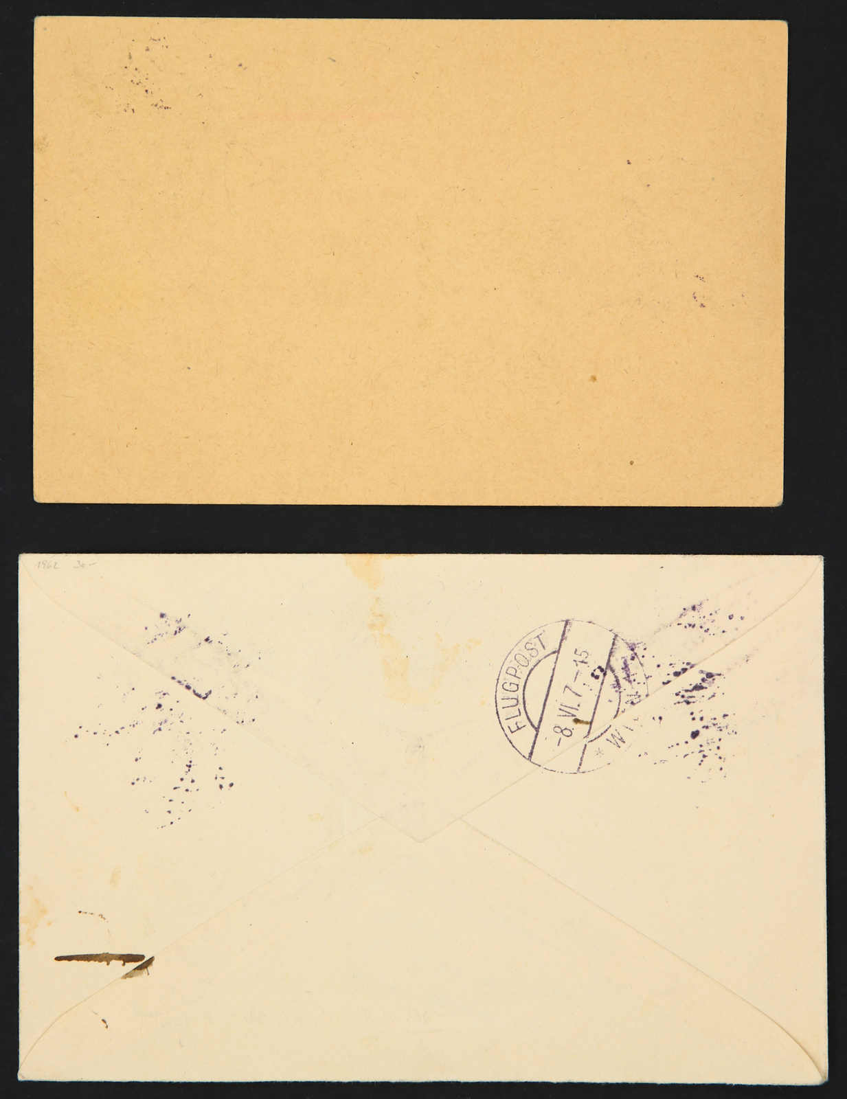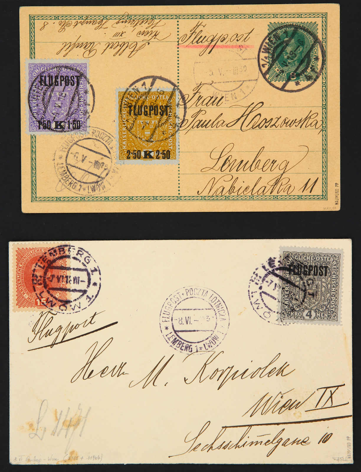 1918, Österreich, 8 H. Ganzsache mit Zusatzfr. 1,5 Kr. a. 2 Kr. und 2,5 Kr. a. 3 Kr. der Überdruck-Ausgabe für die Fluglinie Wien - Kiew auf Flugpostkarte, aufgegeben "WIEN 1 4.V.18" adressiert nach Lemberg, dazu Flugpostbrief, frankiert
