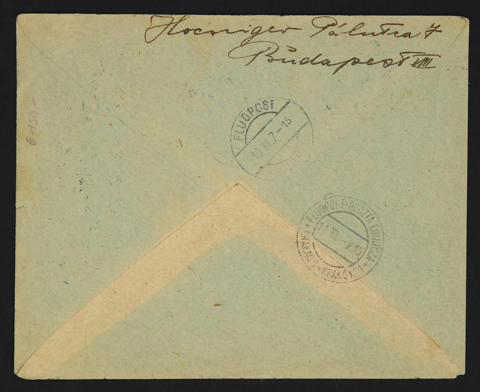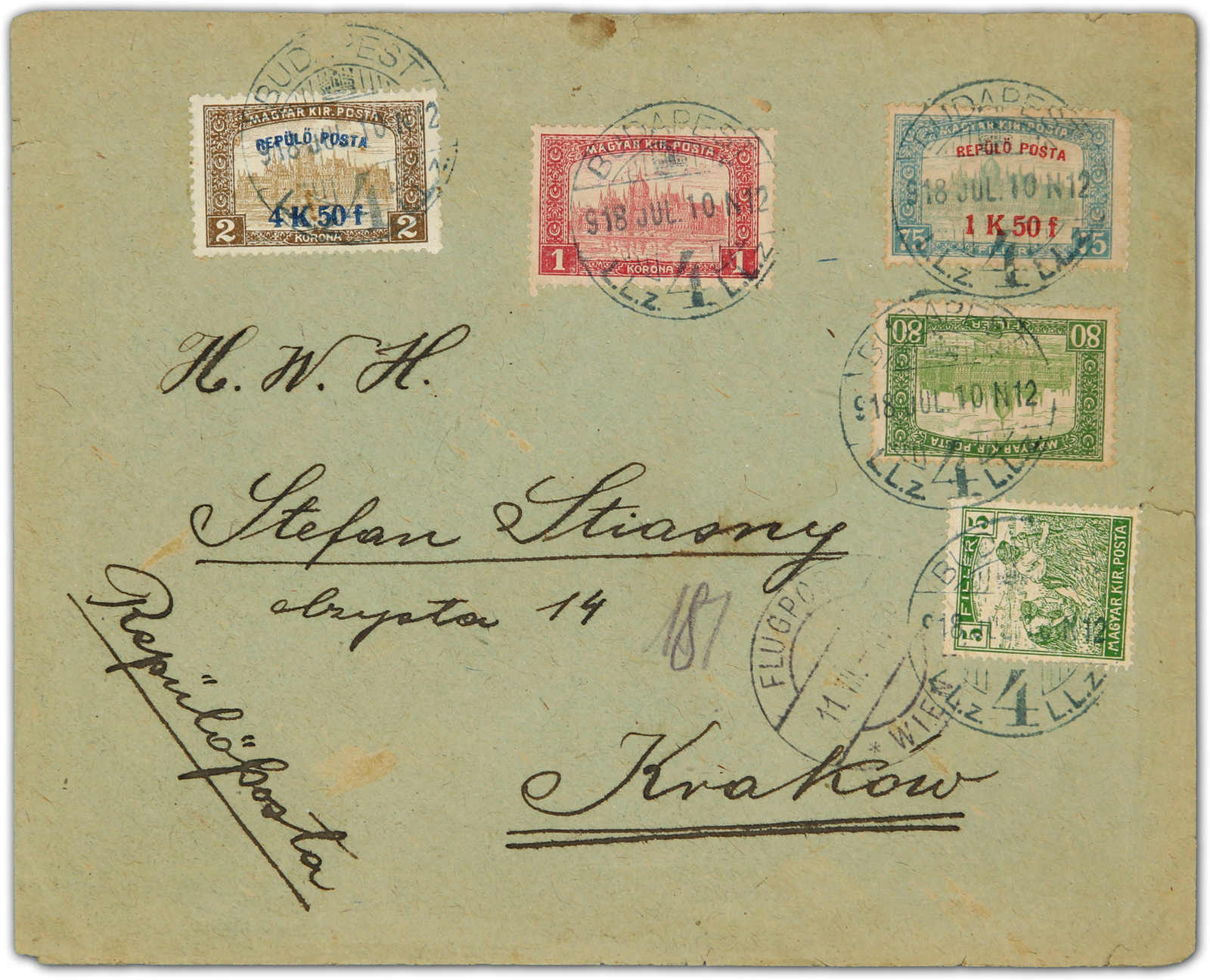 1918, 1,50 Kr. und 2,50 Kr. die Überdruckwerte für den Flugverkehr Budapest - Lemberg, mit Zusatzfrankatur auf Brief, aufgegeben "BUDAPEST 10 JUL. 18", adressiert nach Krakau, vorderseitig mit Flugpost-Bestätigungsstp. von Wien, teils