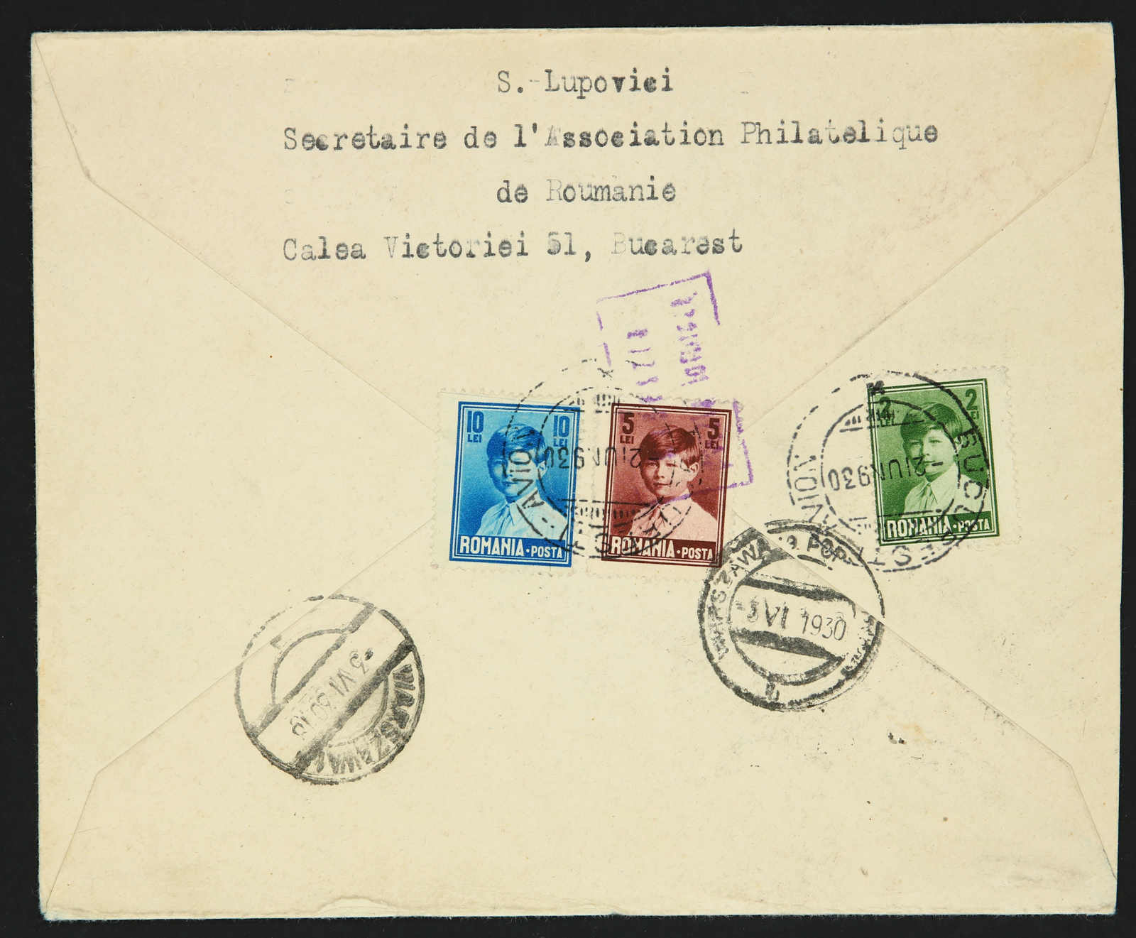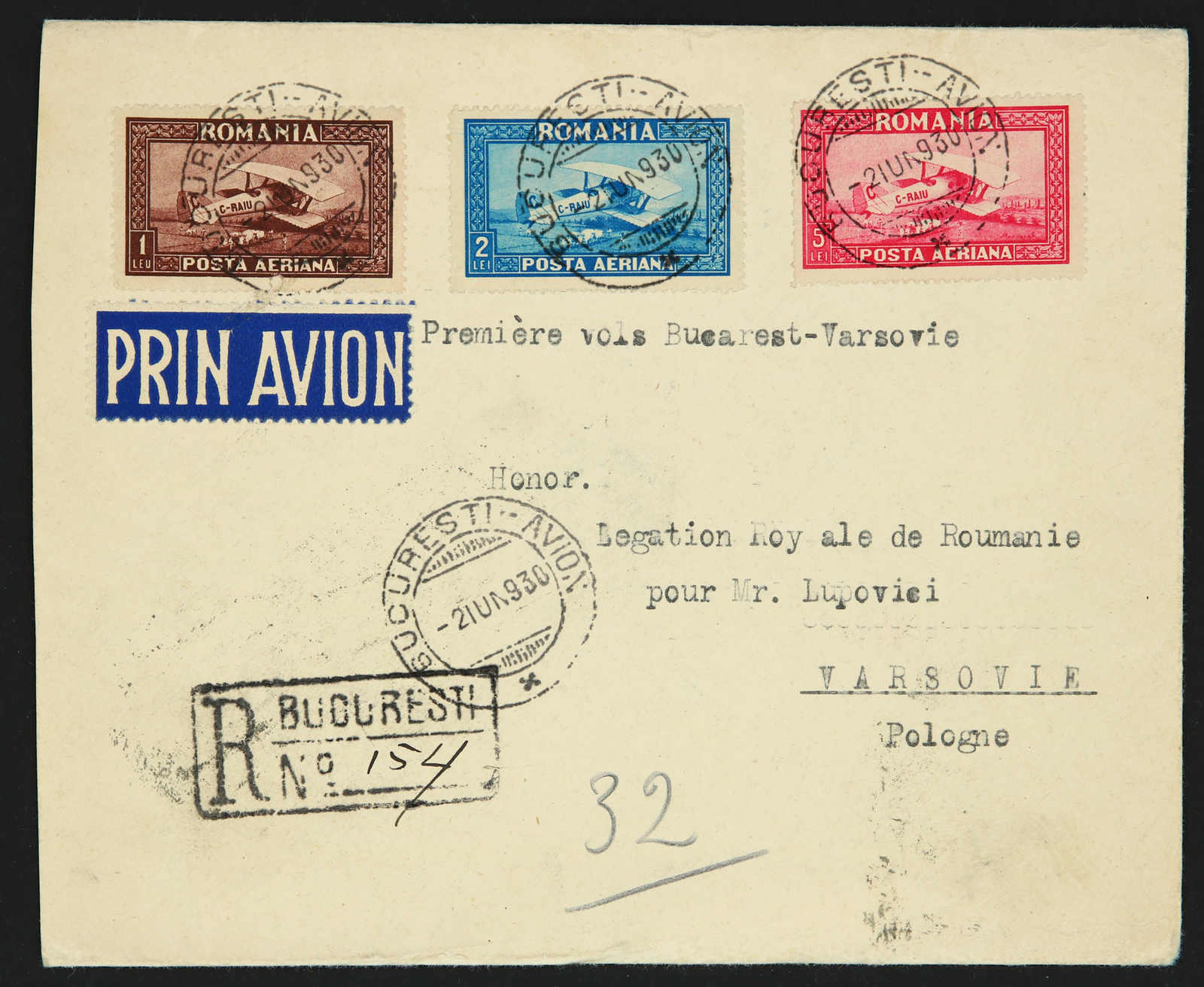 1930, 1, 2 und 5 L. Flugpost und Zusatzfr. auf Einschreiben-Flugpostbrief zur Eröffnung der Strecke Bukarest - Warschau, aufgegeben "BUCURESTI-AVION 2. JUN 1930", adressiert nach Warschau, Brief leichte Beförderungsspuren, sonst saubere
