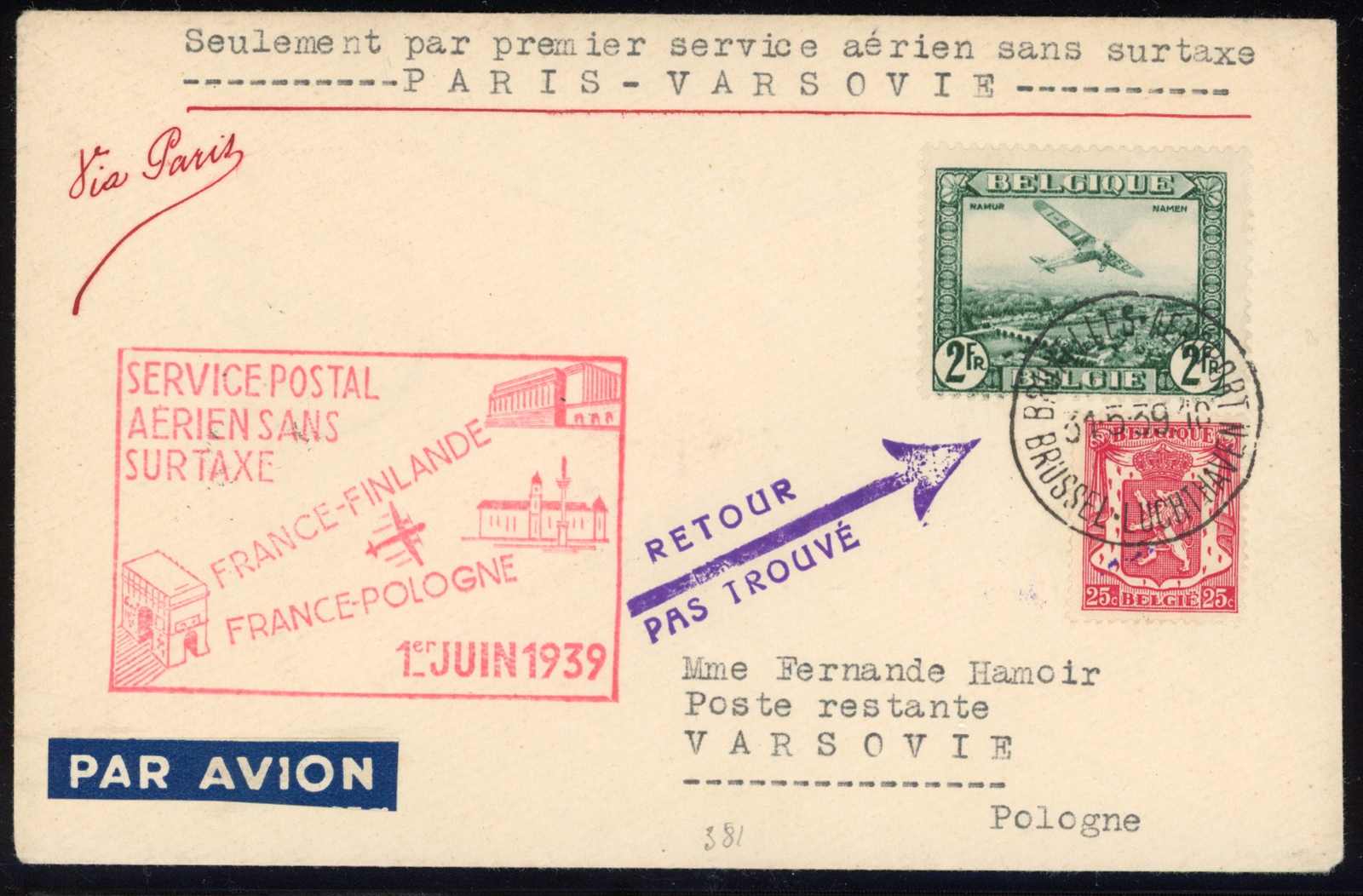 1939, 2 Fr. Flugpost und 25 C. Wappen, auf Sonderflugbrief für die Strecke Frankreich -Polen, aufgegeben "BRÜSSEL LUCHTHAVEN 31.5.39", befördert über Frankreich, adressiert nach Varsovie postlagernd, rückseitig mehrere Ankunftsstp.,