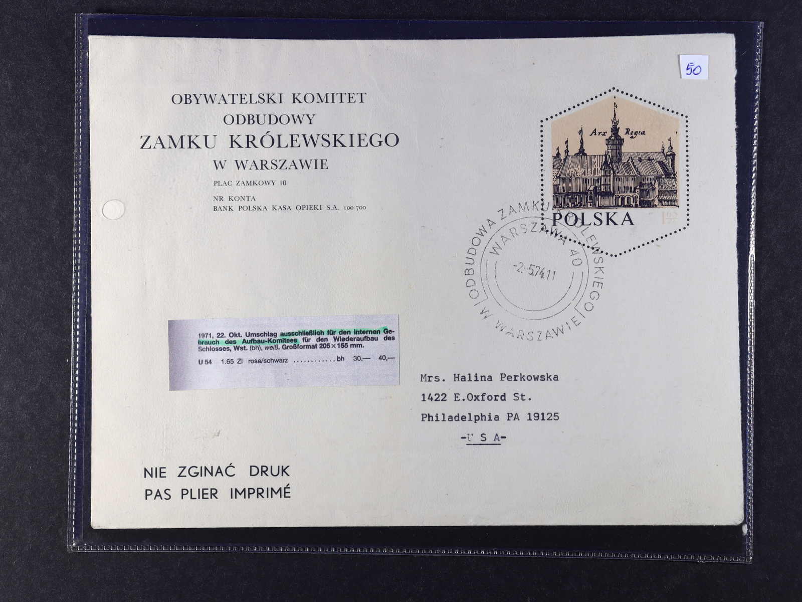 1974, großformatiger Ganzsachenumschlag, ausschließlich zur Verwendung des Aufbau-Komitees für den Wiederaufbau des Warschauer Schlosses, Nominalwert 1, 65 Zl., entwertet mit SSt. von Warschau 1974, adressiert in die USA, Beförderung ist
