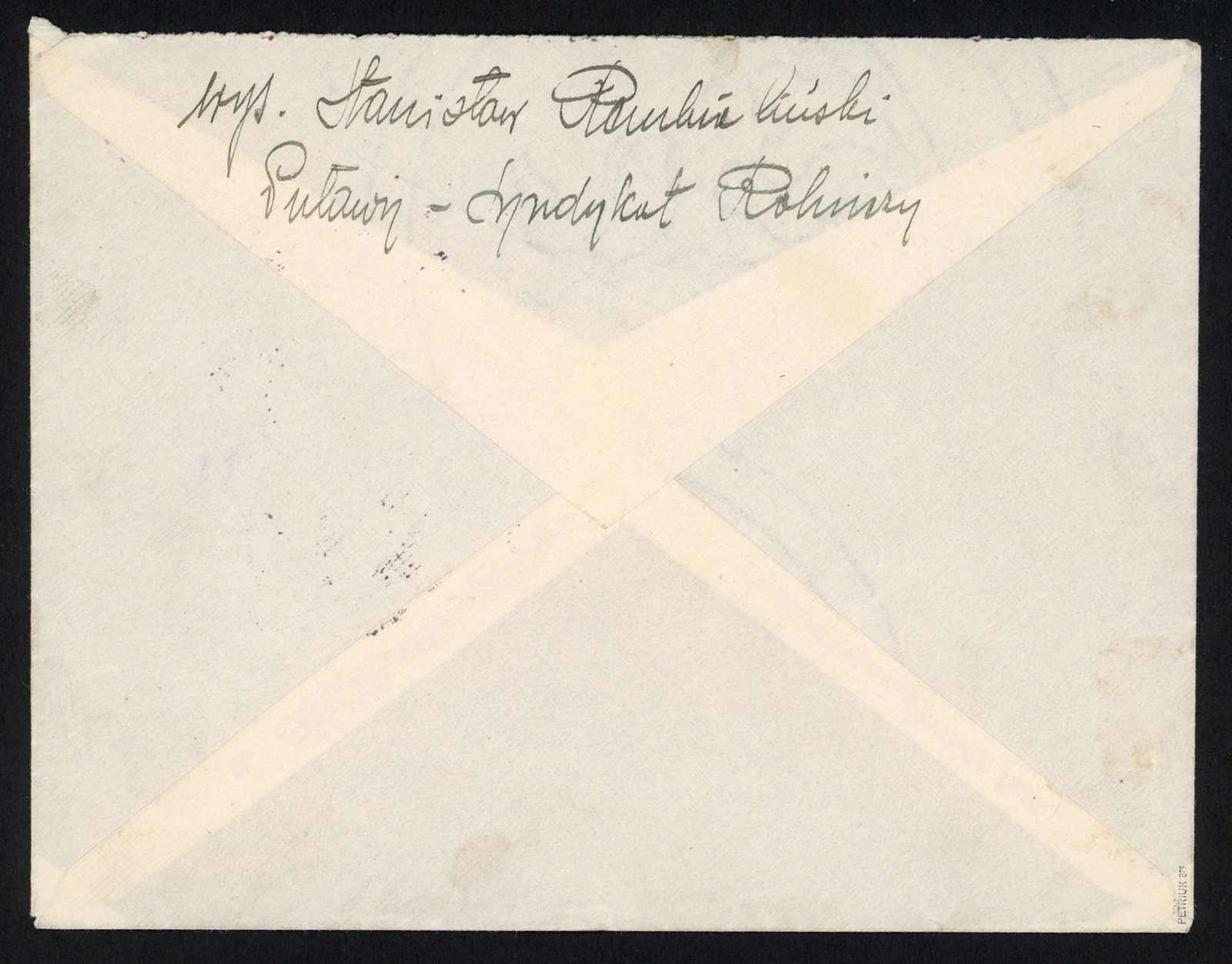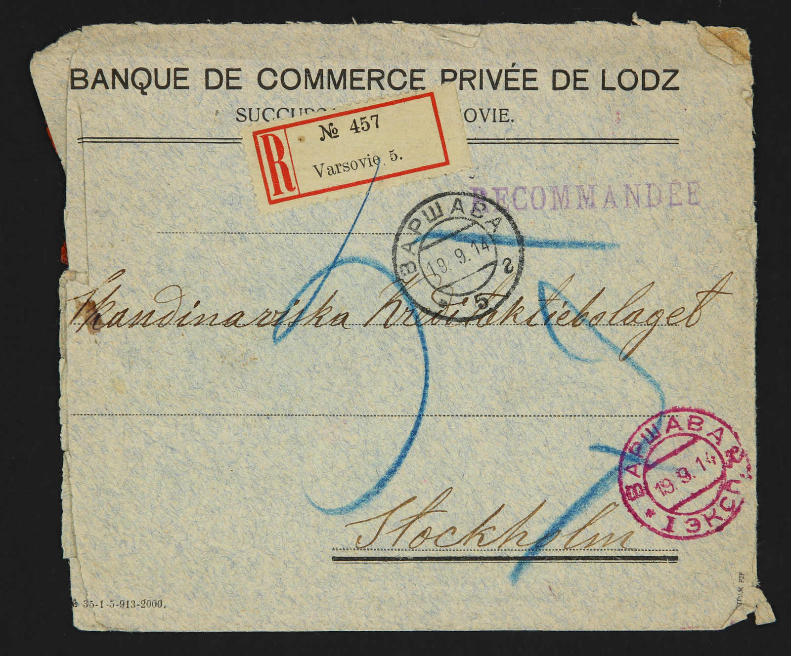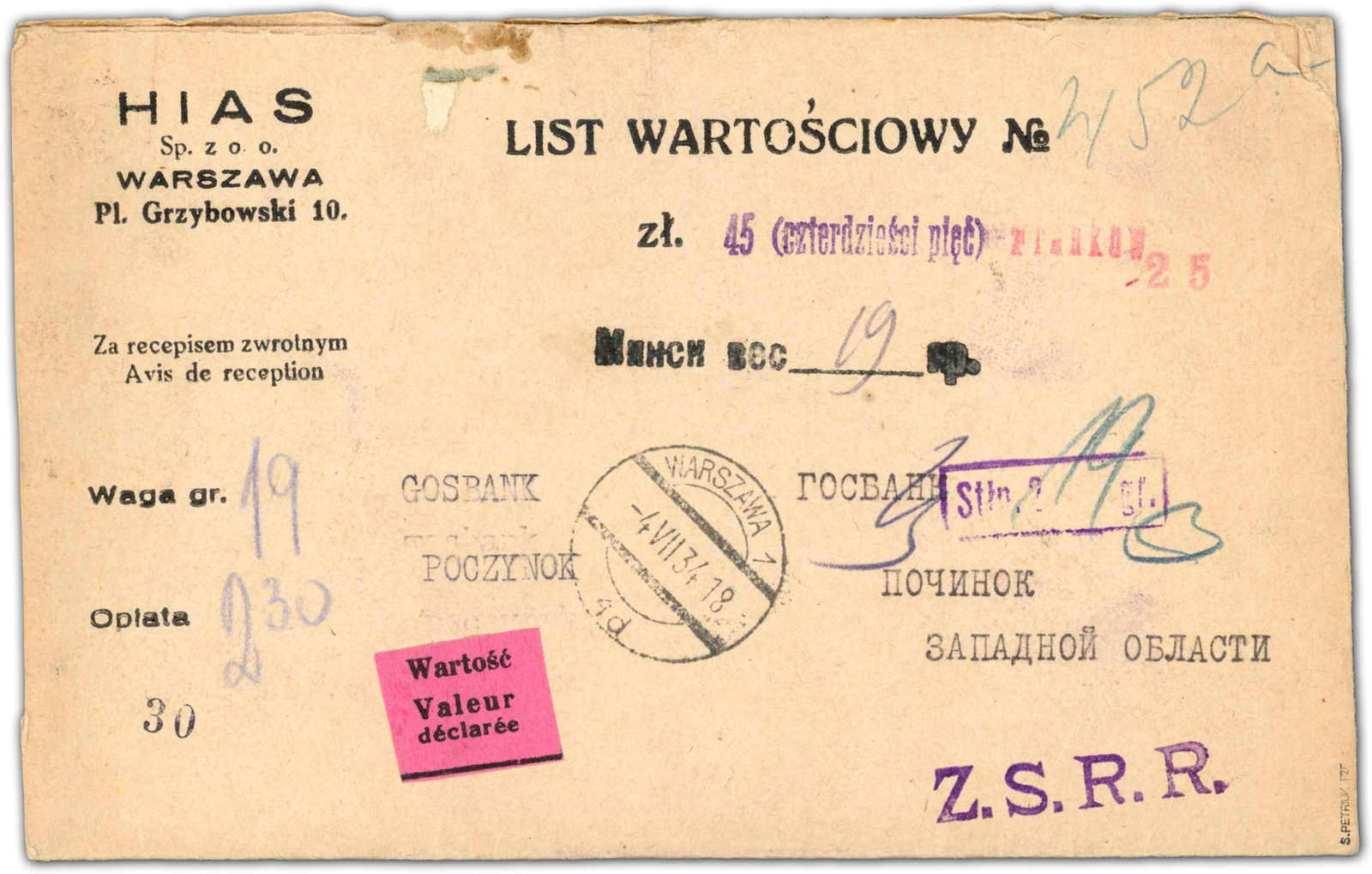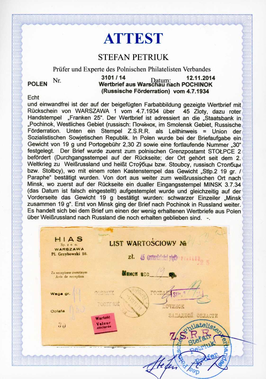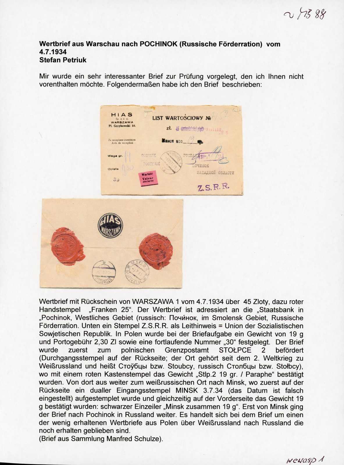 1934, Wertbrief mit Rückschein in Höhe von 45 Zt., aufgegeben in "WARSCHAU 4. VII. 34", adressiert an die Staatsbank in Pochinok/Sowjetunion. Bei der Aufgabe wurde das Gewicht von 19 g notiert und die Gebühren auf 2,30 Zt. festgelegt (bar