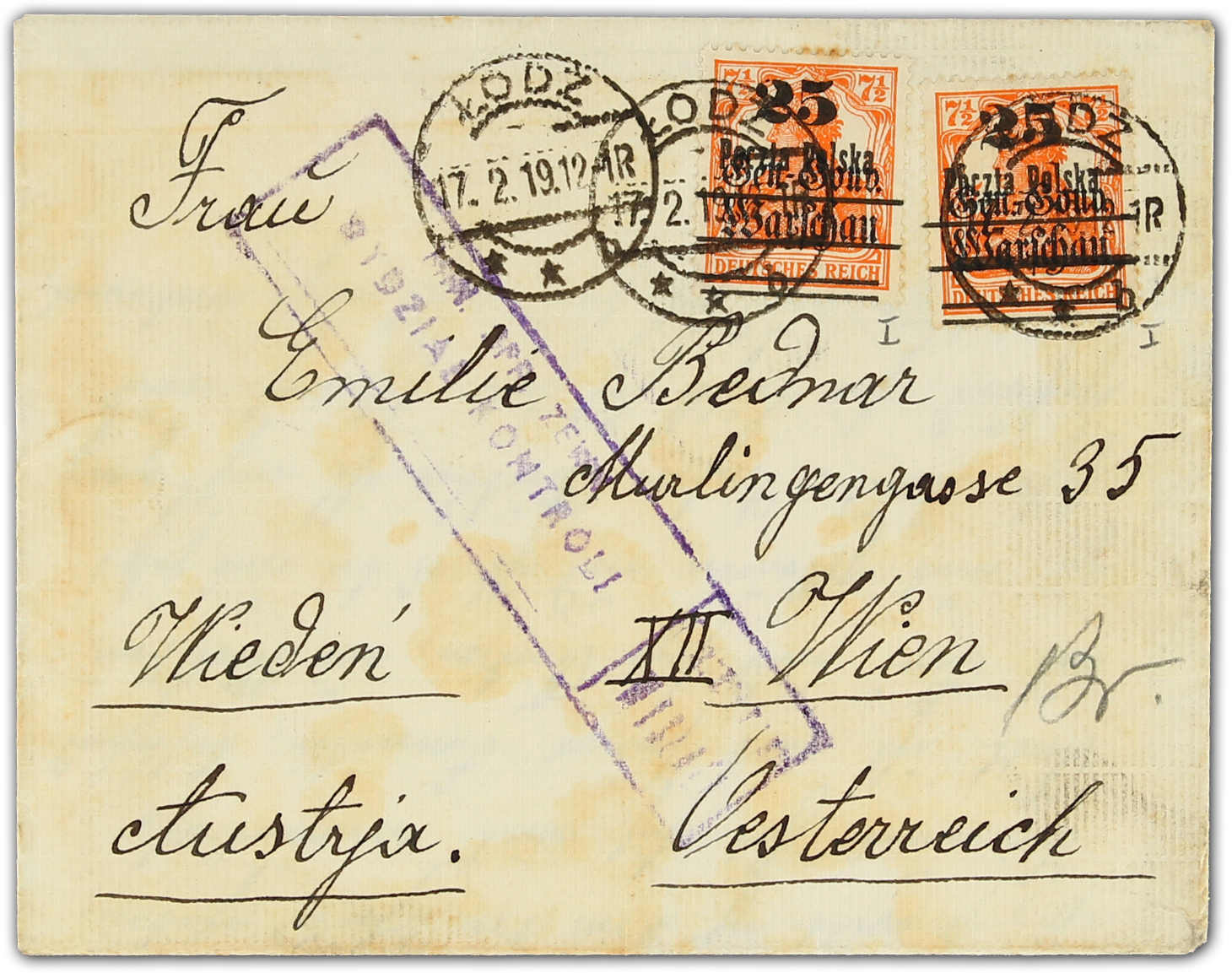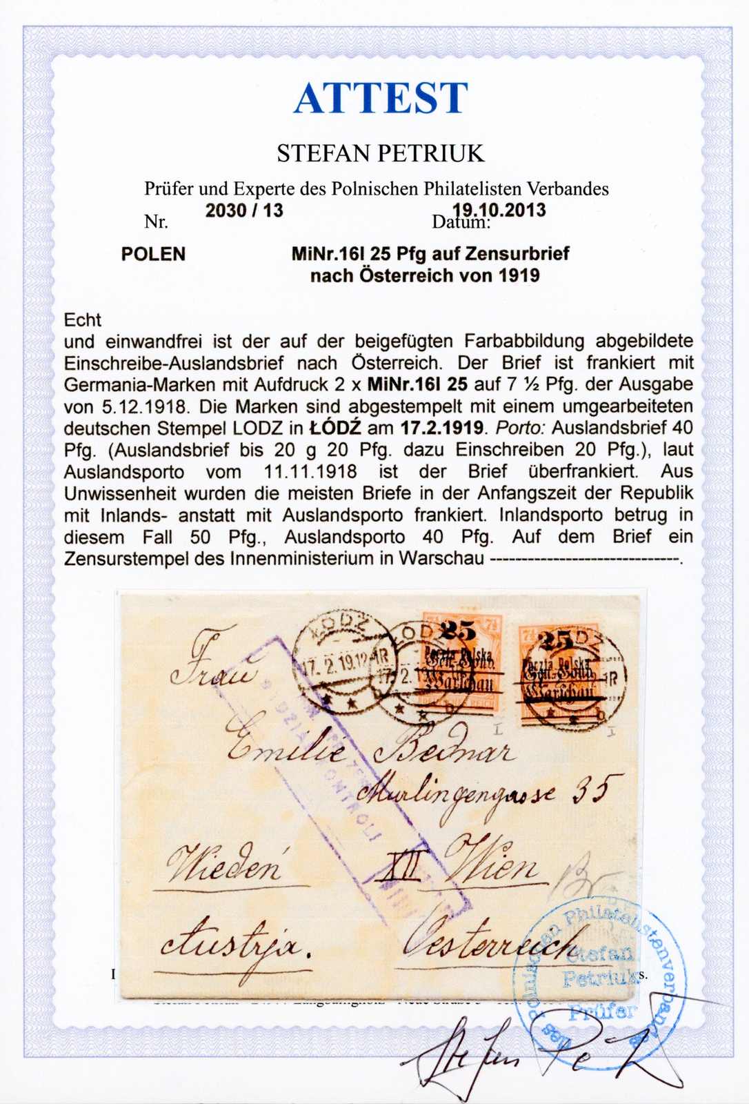 1919, Auslandsbrief Kleinformat mit 2 X 7½ Pfg. Germ. mit Überdruck =25= ab Lodz 17.2.19 nach Wien. Im Attest als =Einschreiben= bezeichnet, obwohl ohne Nummer oder R-Zettel. Die Marken als Type =I= gekennzeichnet. Der Aufgabestempel =L=