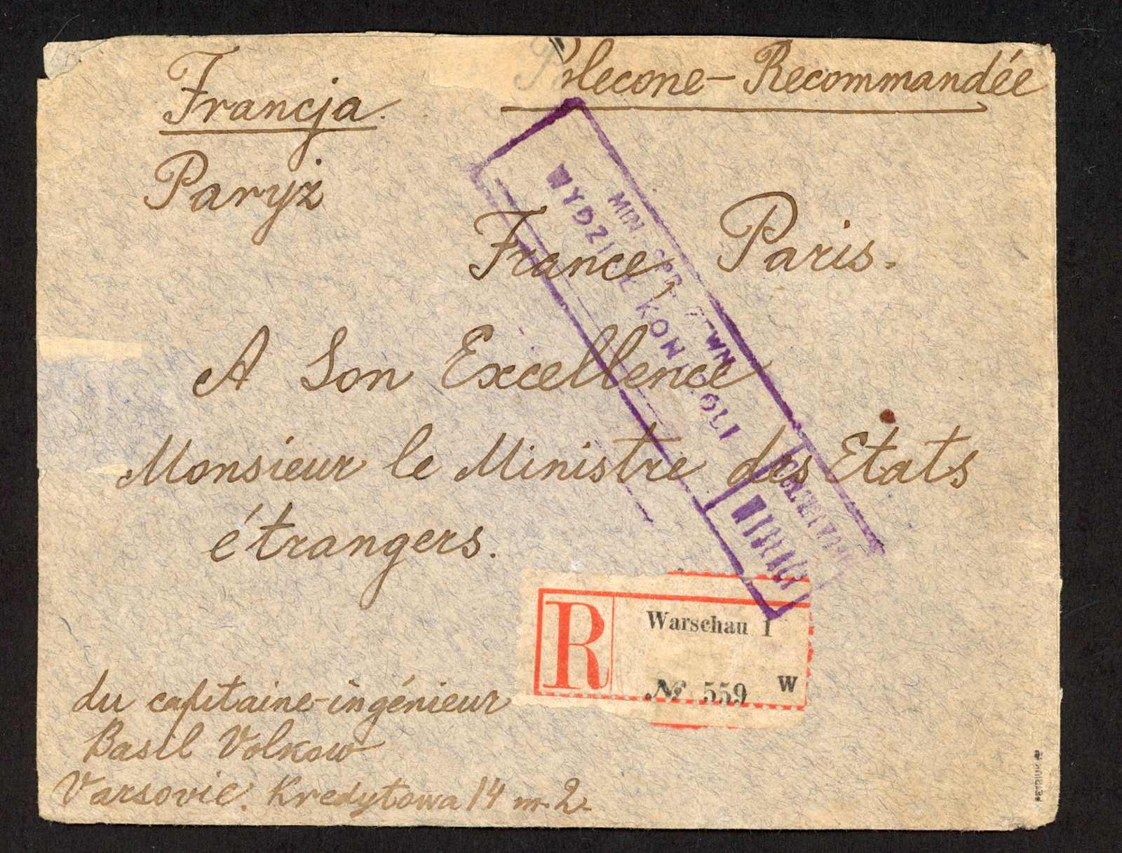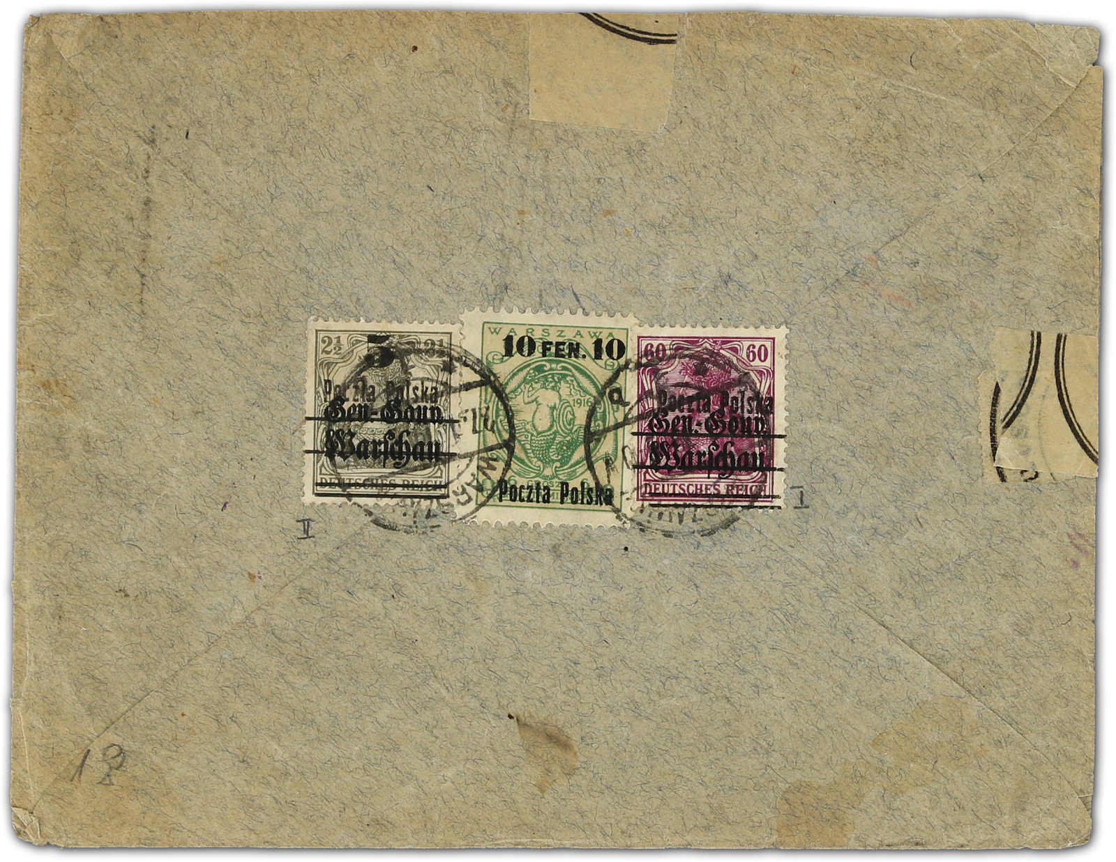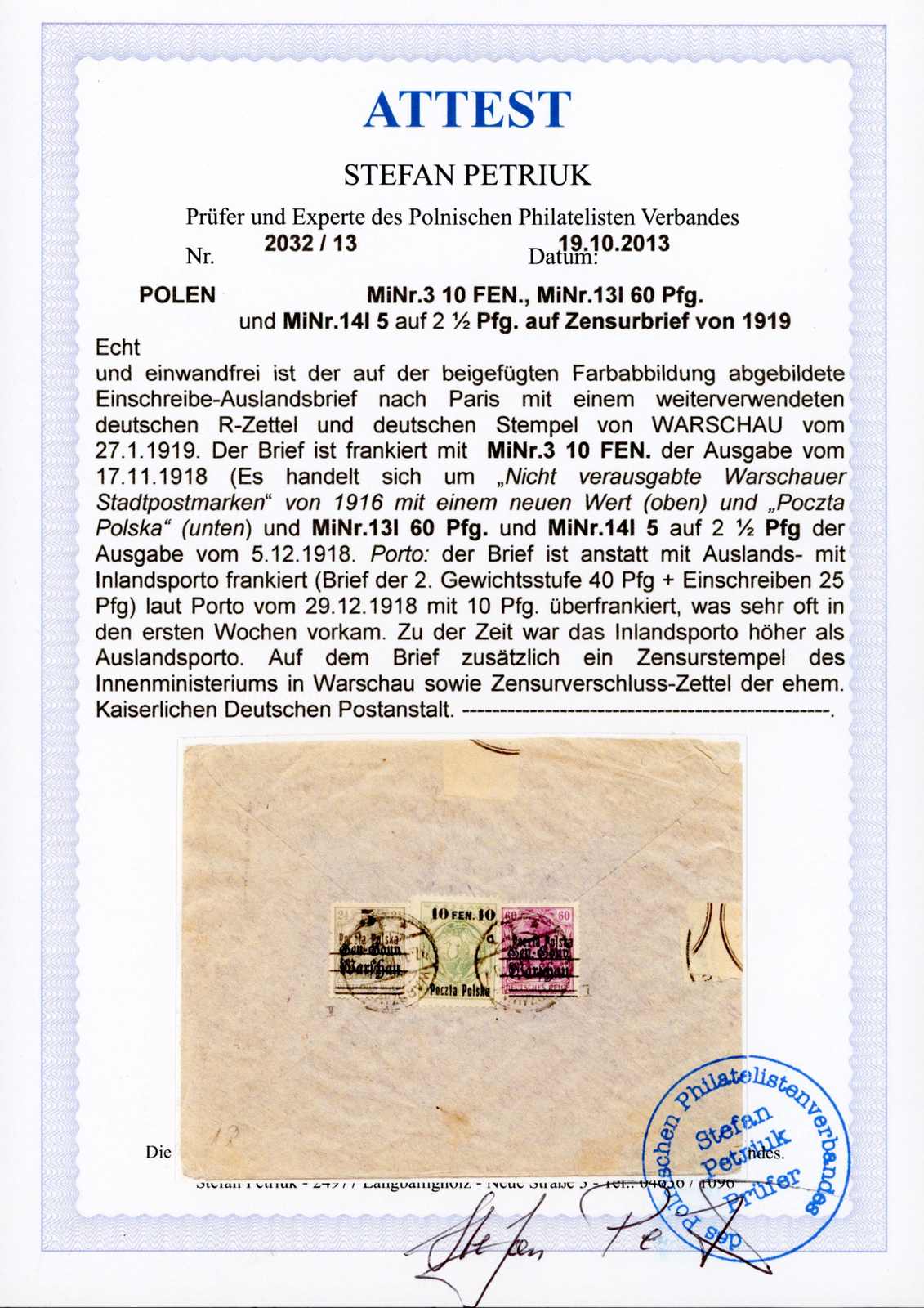 1919, Auslandsbrief 2. Gewichtsstufe mit Einschreiben, 2½ Pfg. und 60 Pfg. Germ. mit Überdruck, dazu Stadtpostmarke mit Überdruck 10 Fen. ab Warschau 27.1.19 mit Zensur Innenministerium und Teil dt. Zensurvignette nach Paris. Umschlag