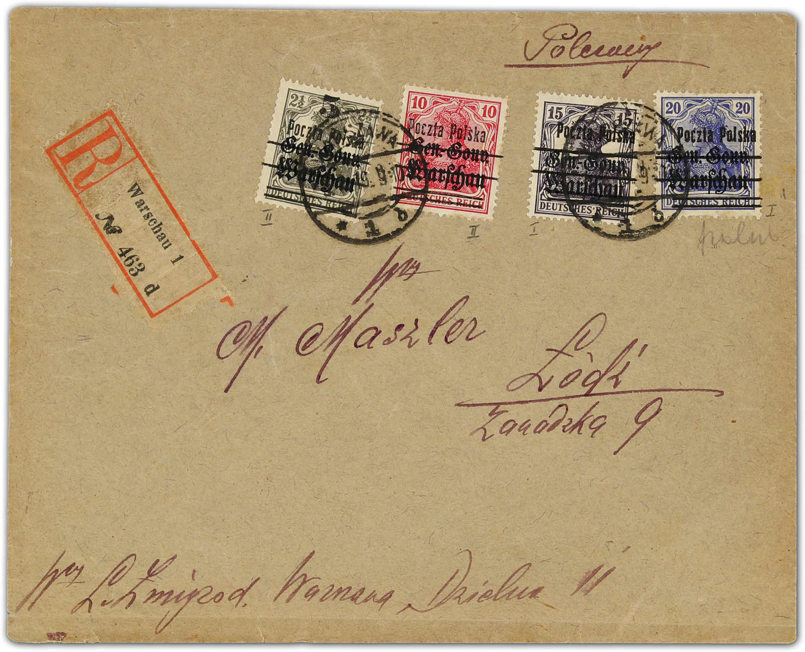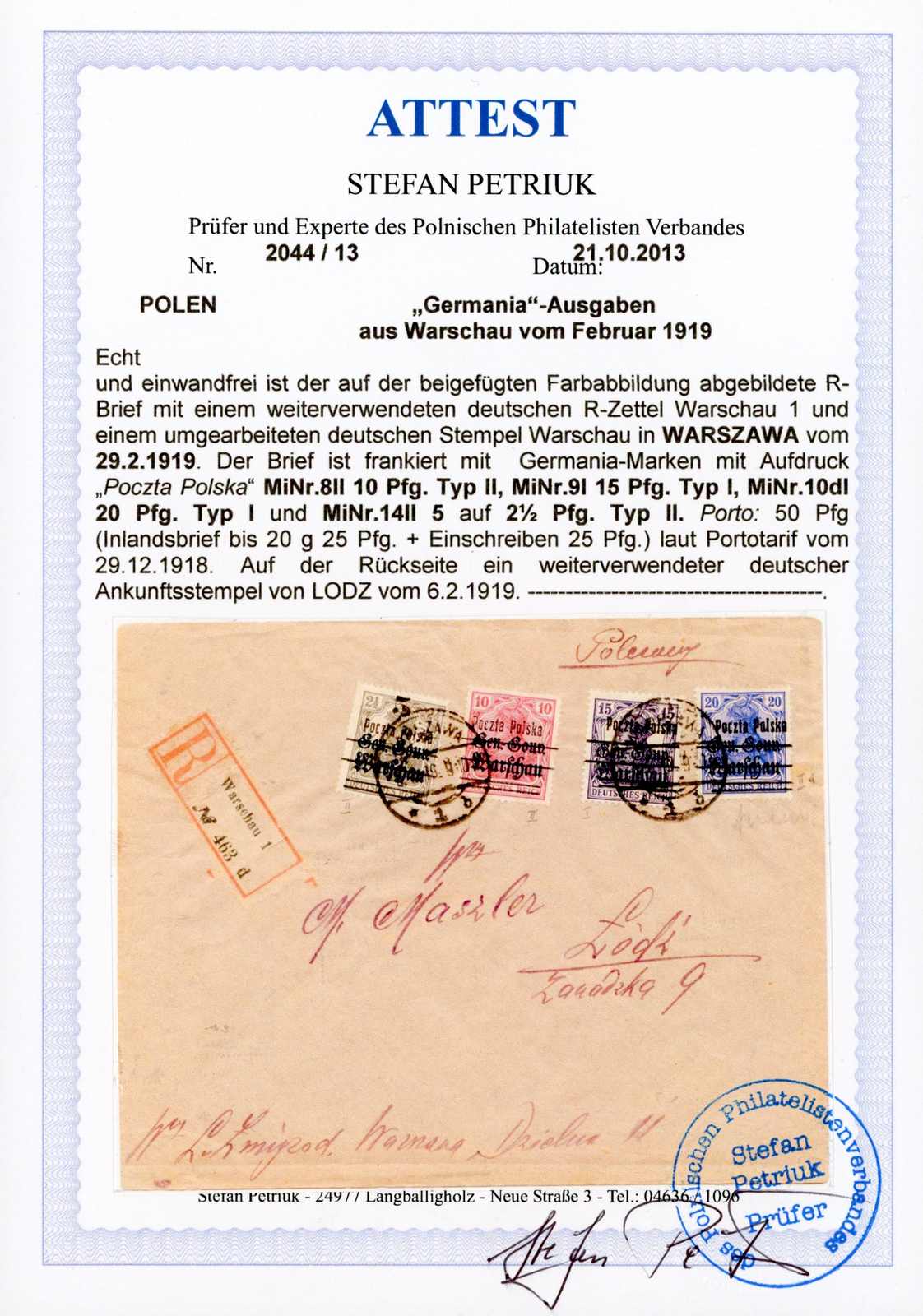 1919, Brief Einschreiben mit 10, 15, 20 Pfg. Germ. mit Überdruck, dazu 2½ Pfg. mit Überdruck =5= ab Warschau ?.2.29 nach Lodz 6.2.19. Fotoattest Petriuk