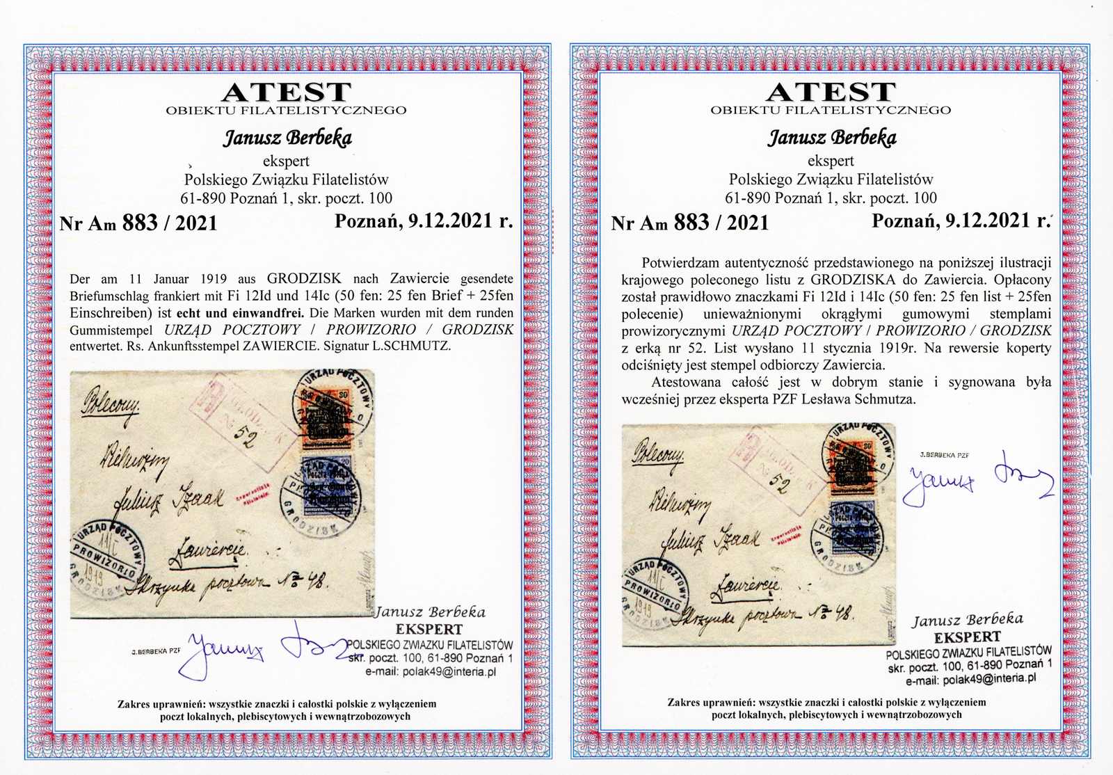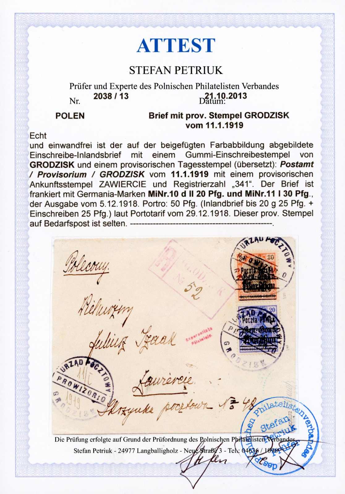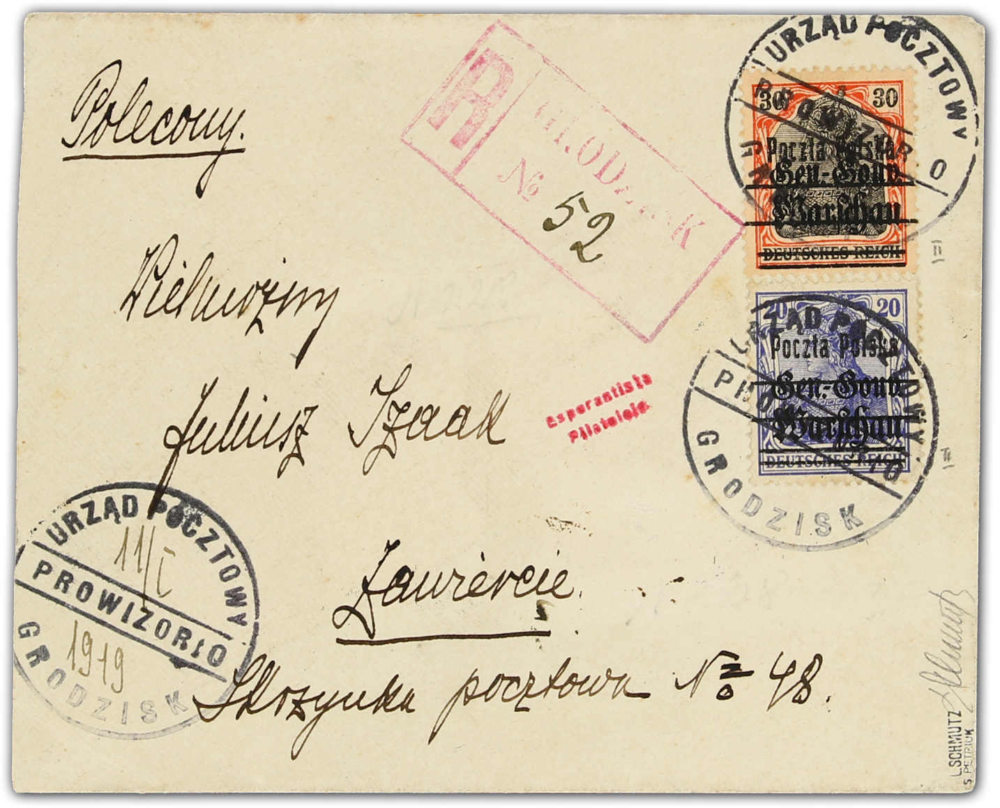 1919, Umschlag Kleinformat als Einschreiben mit 20 und 30 Pfg. Germ m. Aufdruck, prov. Tagesstempel GRODZISK, Datum handschr. dazu R-Stempel rot, Nr. handschr. nach Zawiercie. Ankunft mit L1. Fotoatteste Petriuk und Berbeka (Image) (imagea)