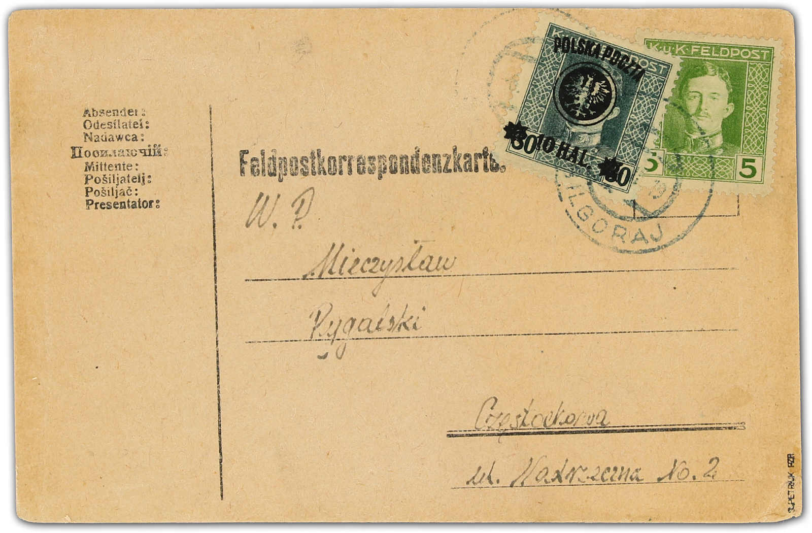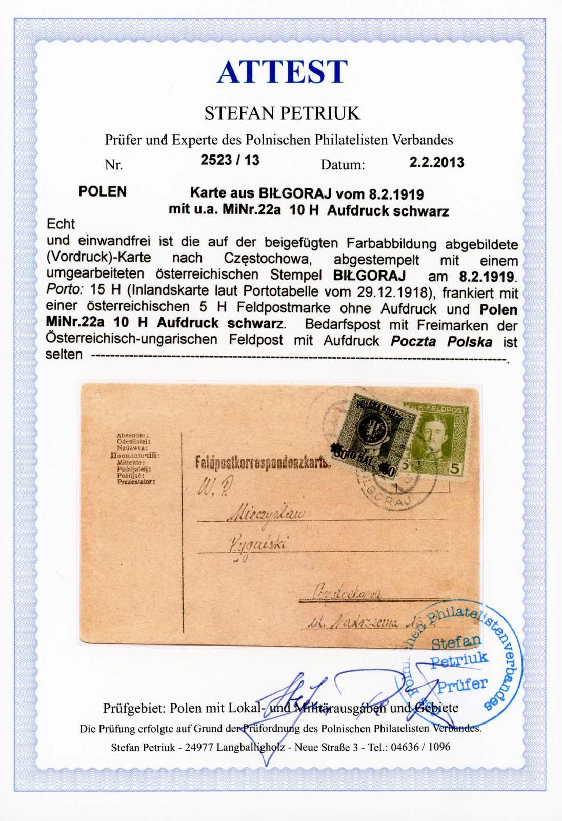 1919, Feldpost-Vordruckkarte mit 5 H. KuK Feldpost, dazu poln. Aufdruckmarke 10 auf 30 H. - zus. 15 H. - ab Bilgoraj 8.2.19 - reinster Bedarfstext - nach Czestochowa. Fotoattest Petriuk (Image) (imagea)