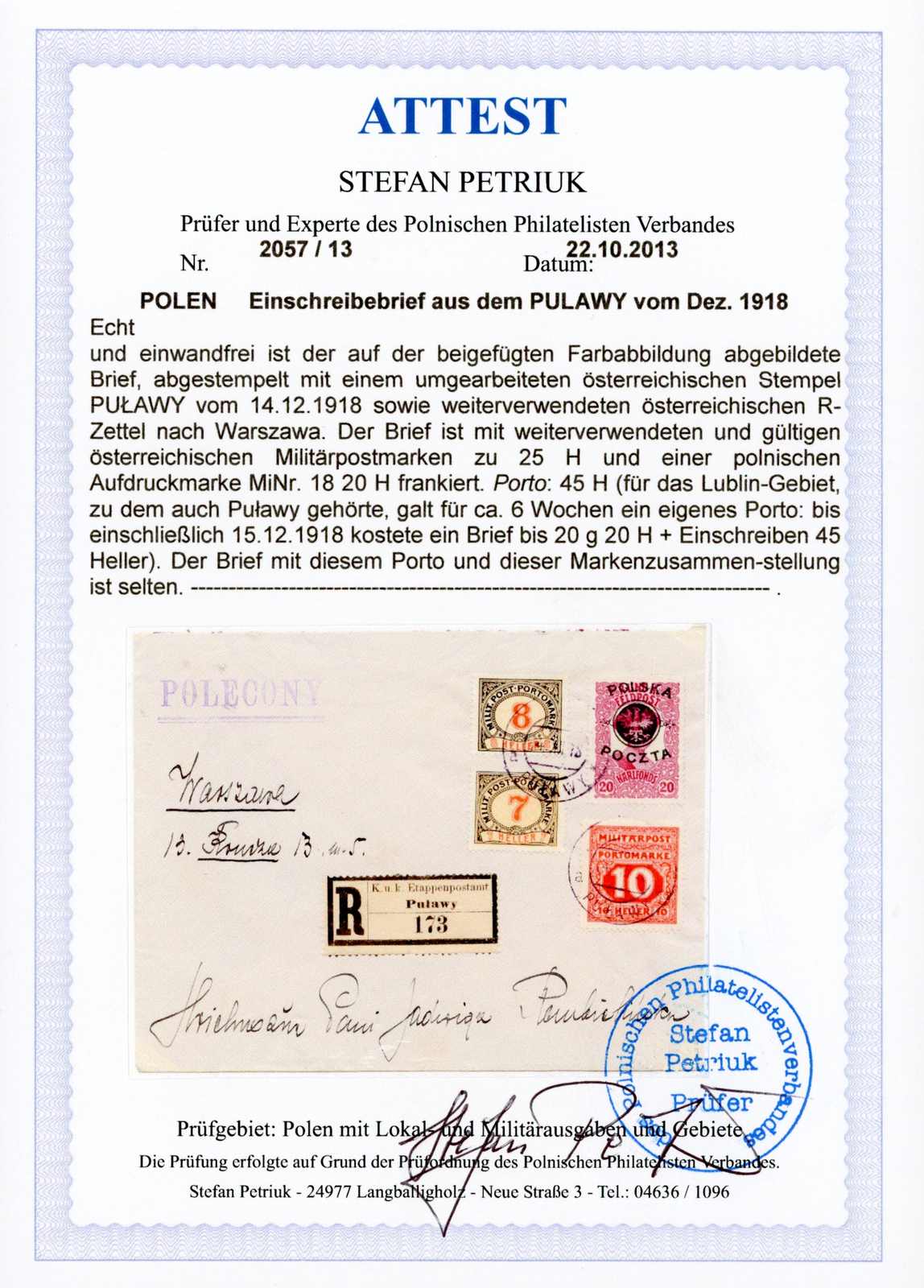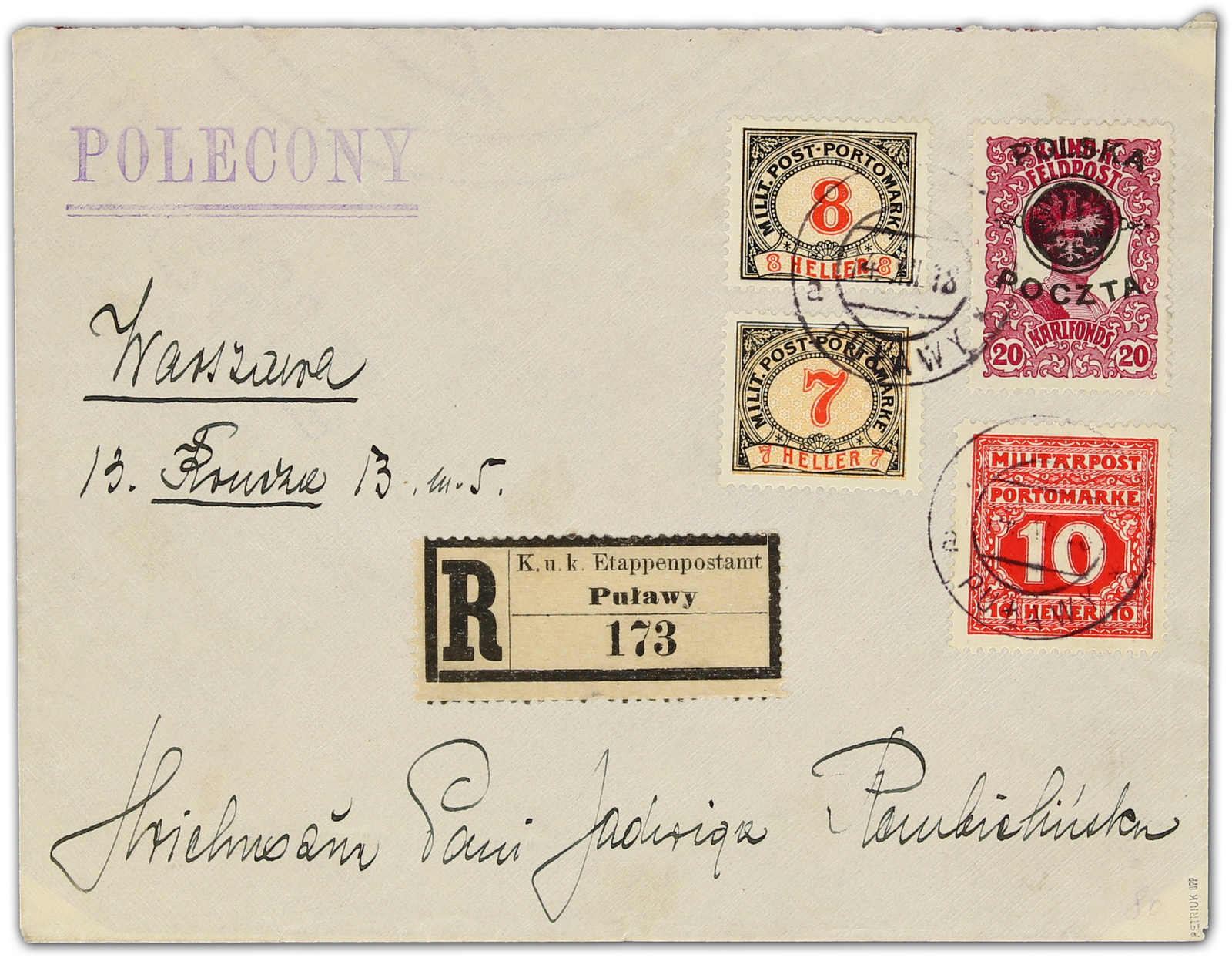 1918, Brief Einschreiben mit 20 H. Aufdruck Polska Poczta und dazu 7, 8 und 10 H. KuK-Mil.-Post ab Pulawy 14.12.18 nach Warschau. Freigemacht mit 45 H. für das Lublin-Gebiet. Der Brief mit dieser Markenzusammenstellung ist selten.
