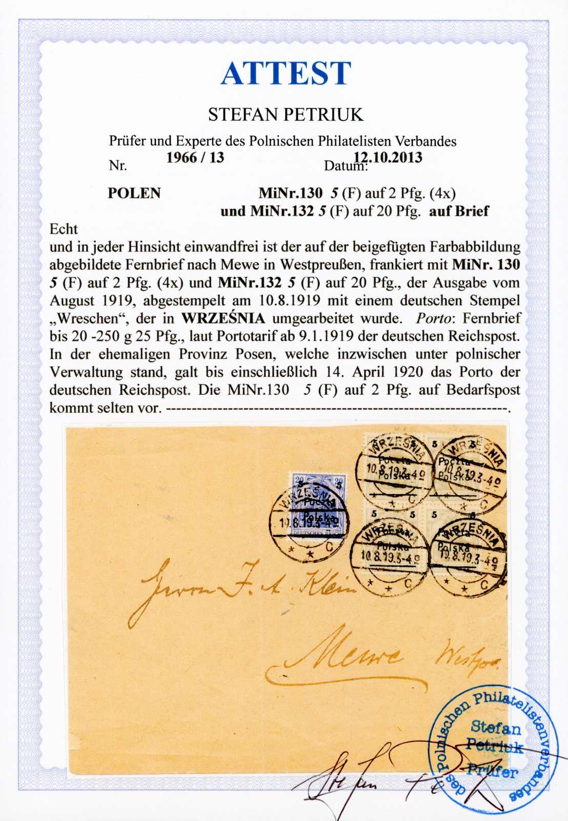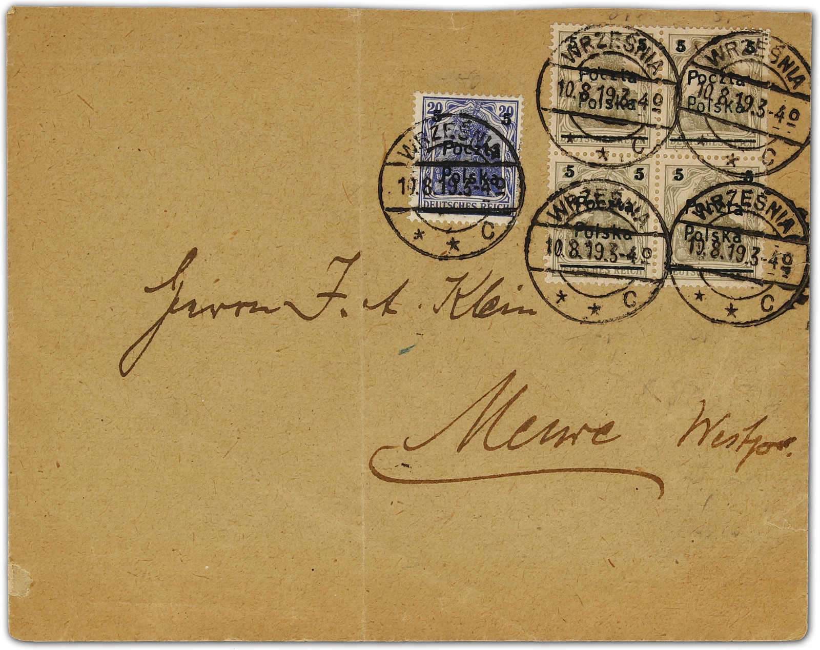 1919, Auslandsbrief mit 4 X 5 F. auf 4er-Block 2 Pfg. Germ. dazu 5 auf 20 Pfg. Germ. Poczta Polska Aufdruck ab Wrzesnia 10.8.19 nach Mewe Westpreußen. Recht seltene Kombination mit den 5-Fen. Aufdruckwerten, dazu der Kleinstwert als