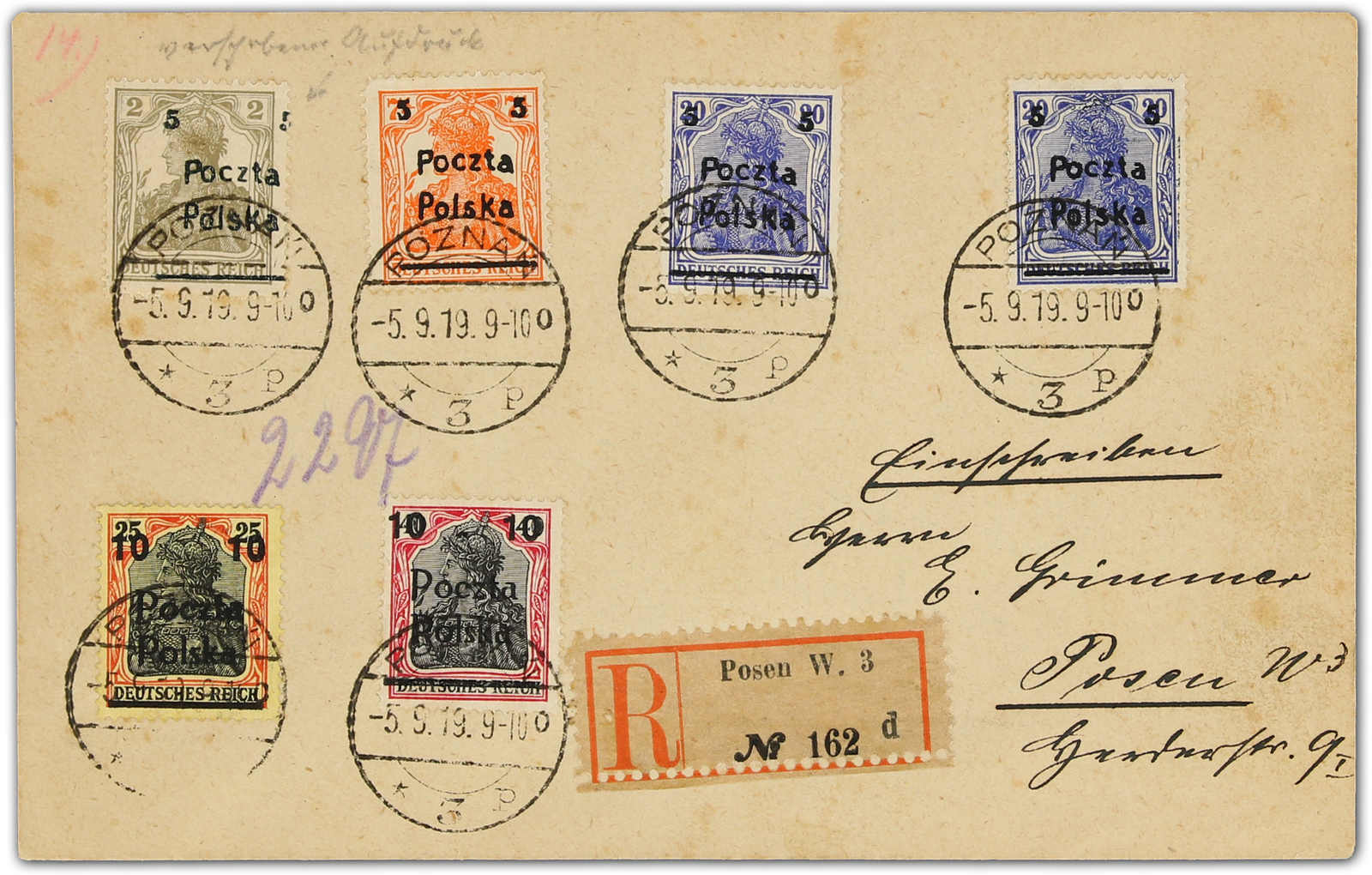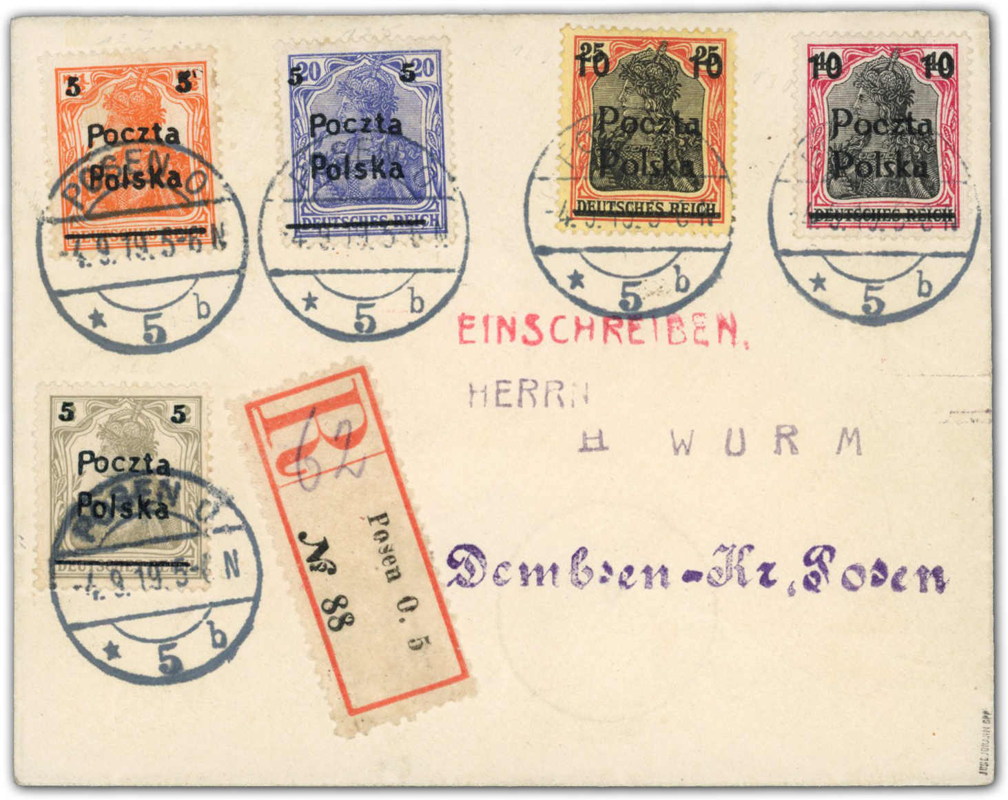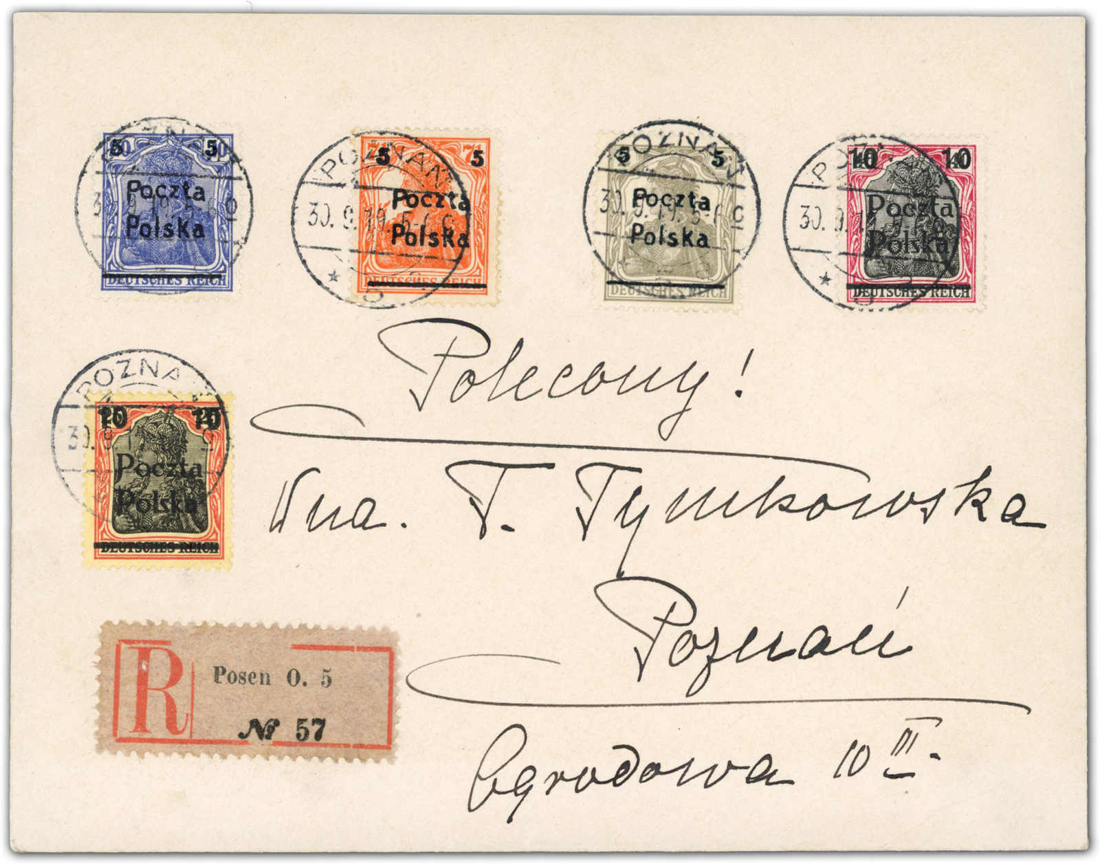 1919, Ortsbrief Einschreiben mit den 5 Aufdruckwerten auf Germ. gebraucht Poznan 30.9.19 mit Ankunft gleicher Tag. (Image) (imagea)