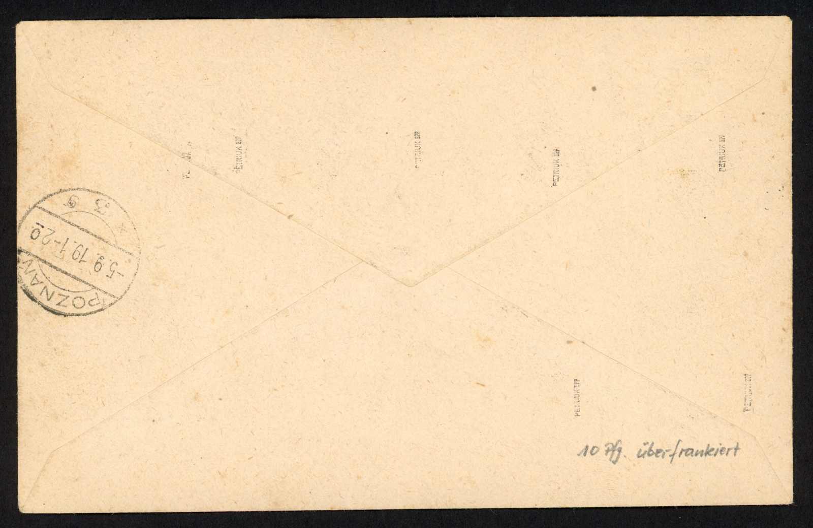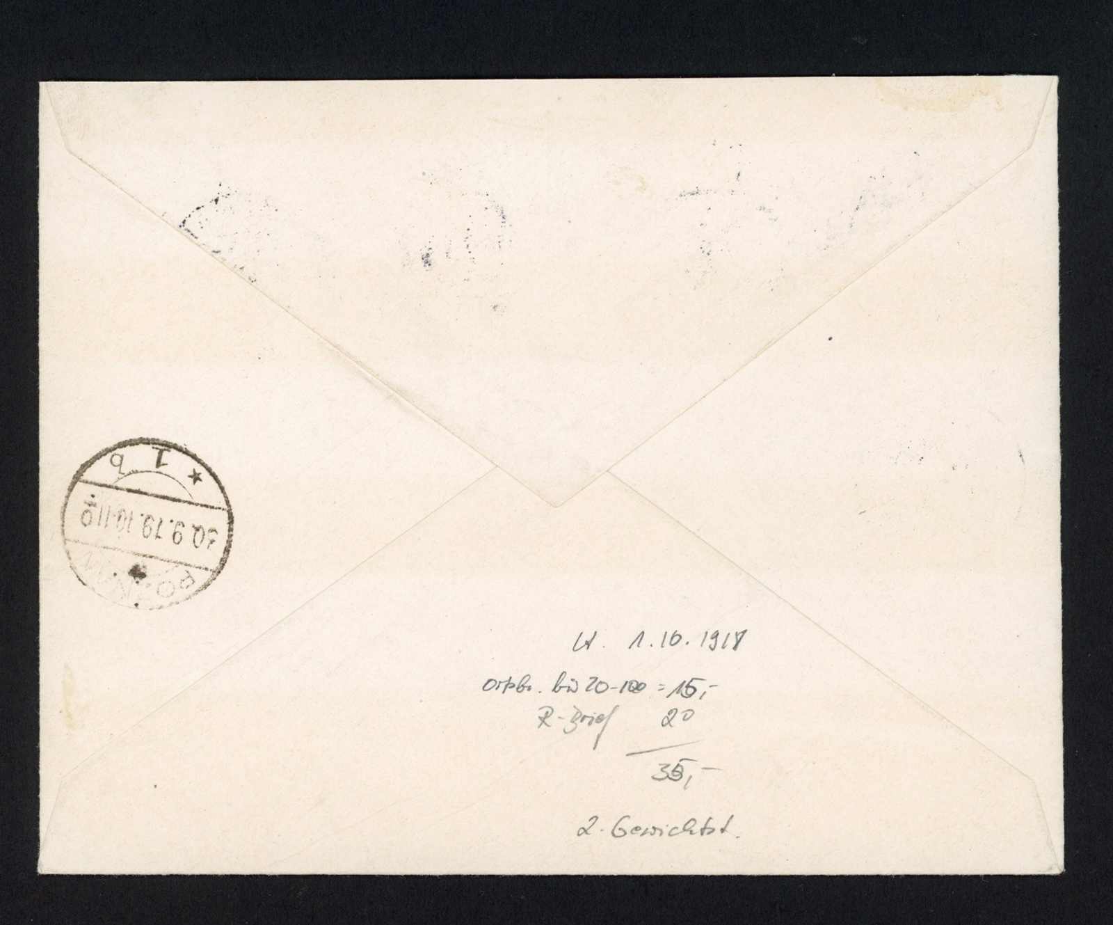 1919, Brief Einschreiben mit 5 versch. Germ.-Werten mit Aufdruck: 5 auf 2, 5 auf 7½, 5 auf 20 - diese 2 X, 10 auf 25 und 10 auf 40 - zusammen 40 Fen., somit 10 Fen. überfrankiert. ab/in Poznan 5.9.19 nach Posen mit Ankunft gleicher Tag