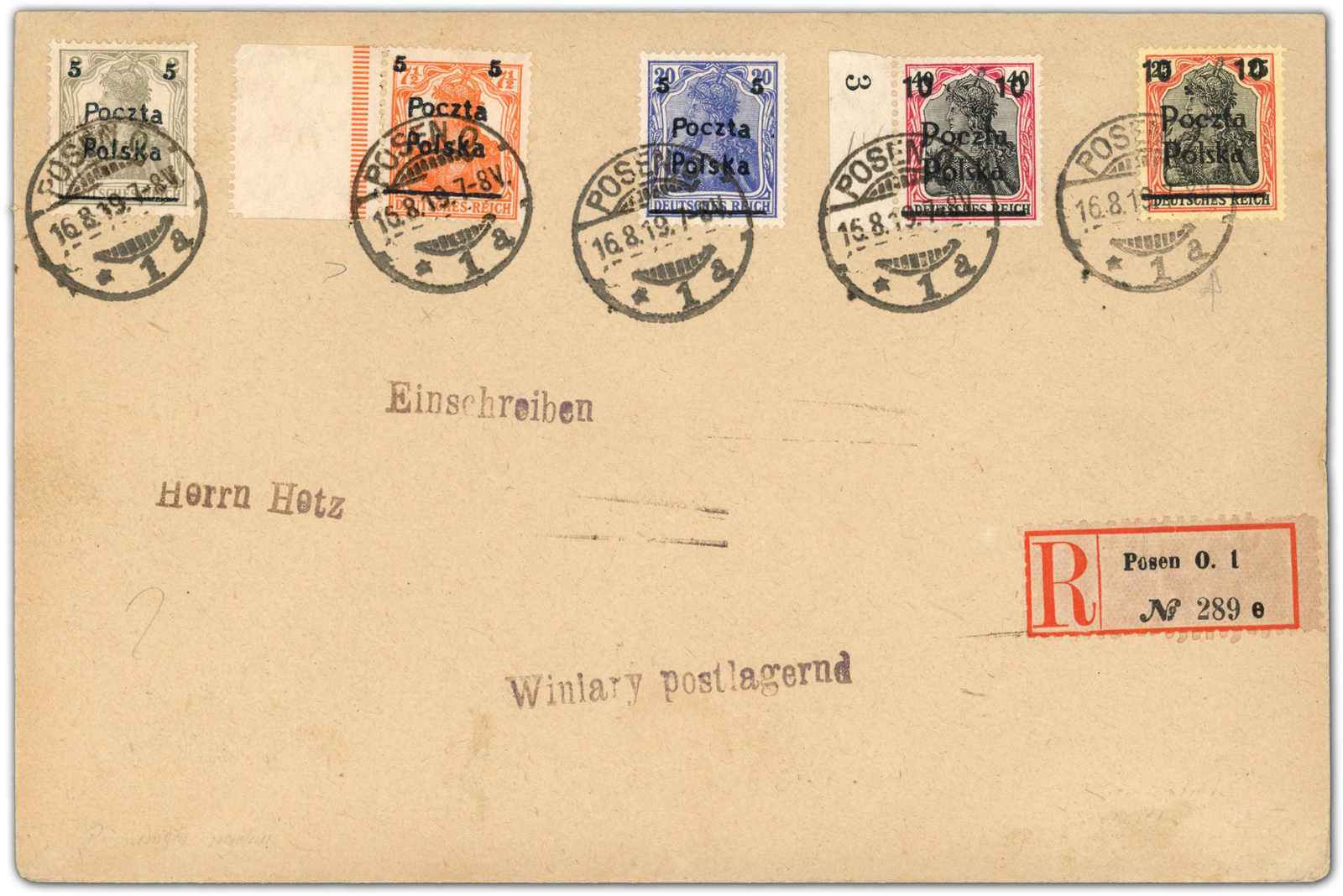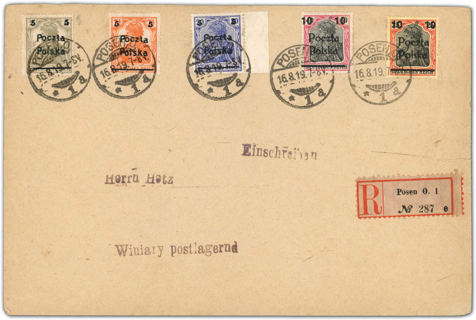 1919, Satzbrief Einschreiben mit den 5 Aufdruckwerten auf Germ. ab Posen O 1 16.8.19 nach Winiary postlagernd Ankunft 16.8.19. Natürlich philatelistisch beeinflusst, doch echt befördert. Sign. Petriuk. (Image) (imagea)