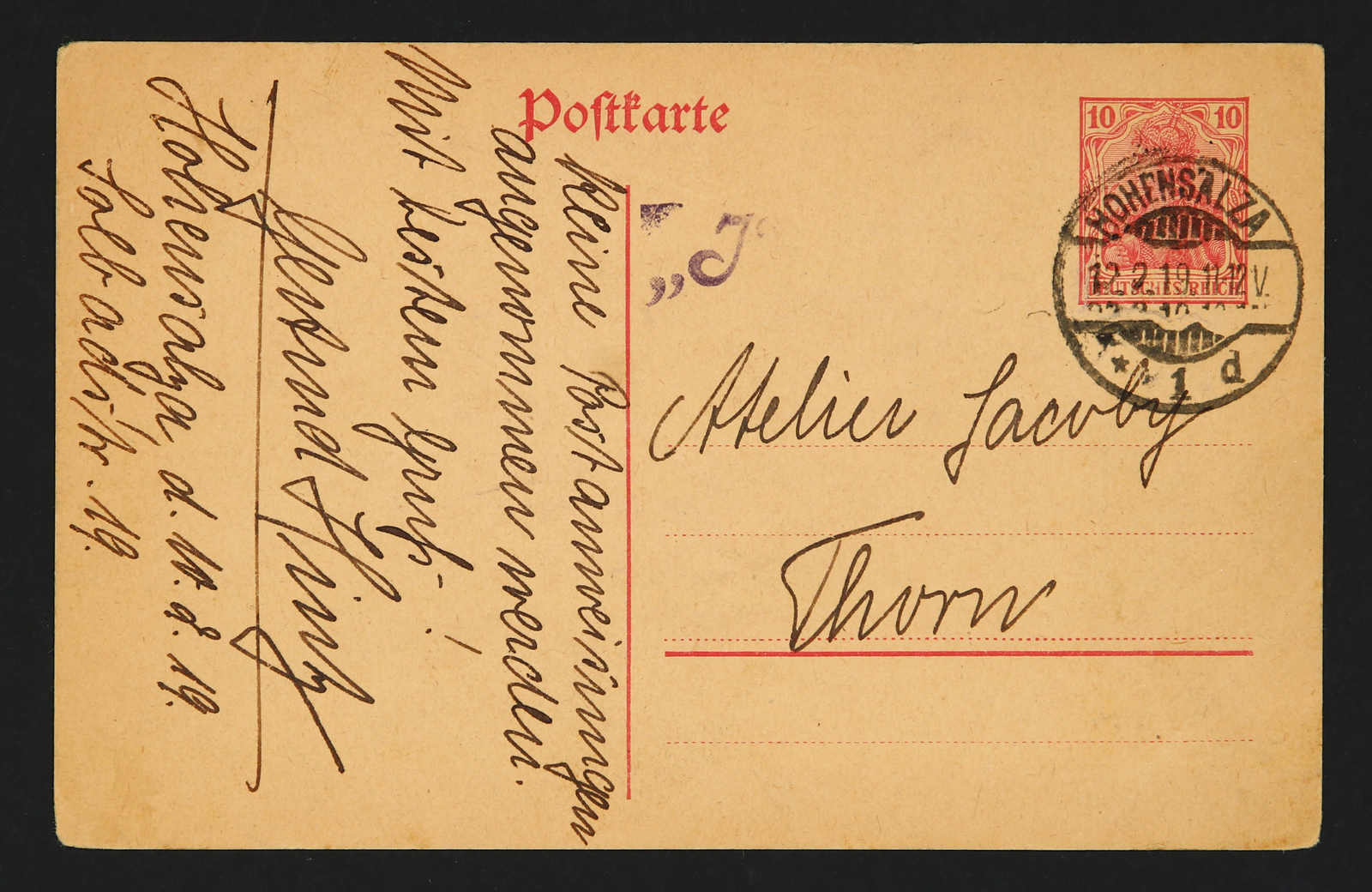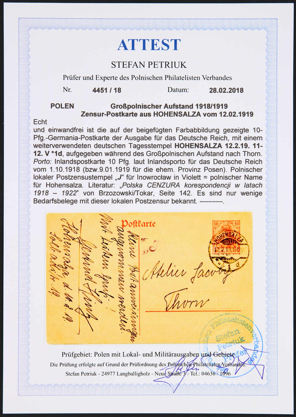 1918/19, Großpolnischer Aufstand, Zensurkarte aus HOHENSALZA vom 12.2.1919 auf 10 Pfg. Germania-Postkarte mit weiterverwendetem deutschen Tagesstempel "HOHENSALZA 12.2.1919 11-12 V *1d" nach Thorn, Polnischer Postzensurstempel "J" für
