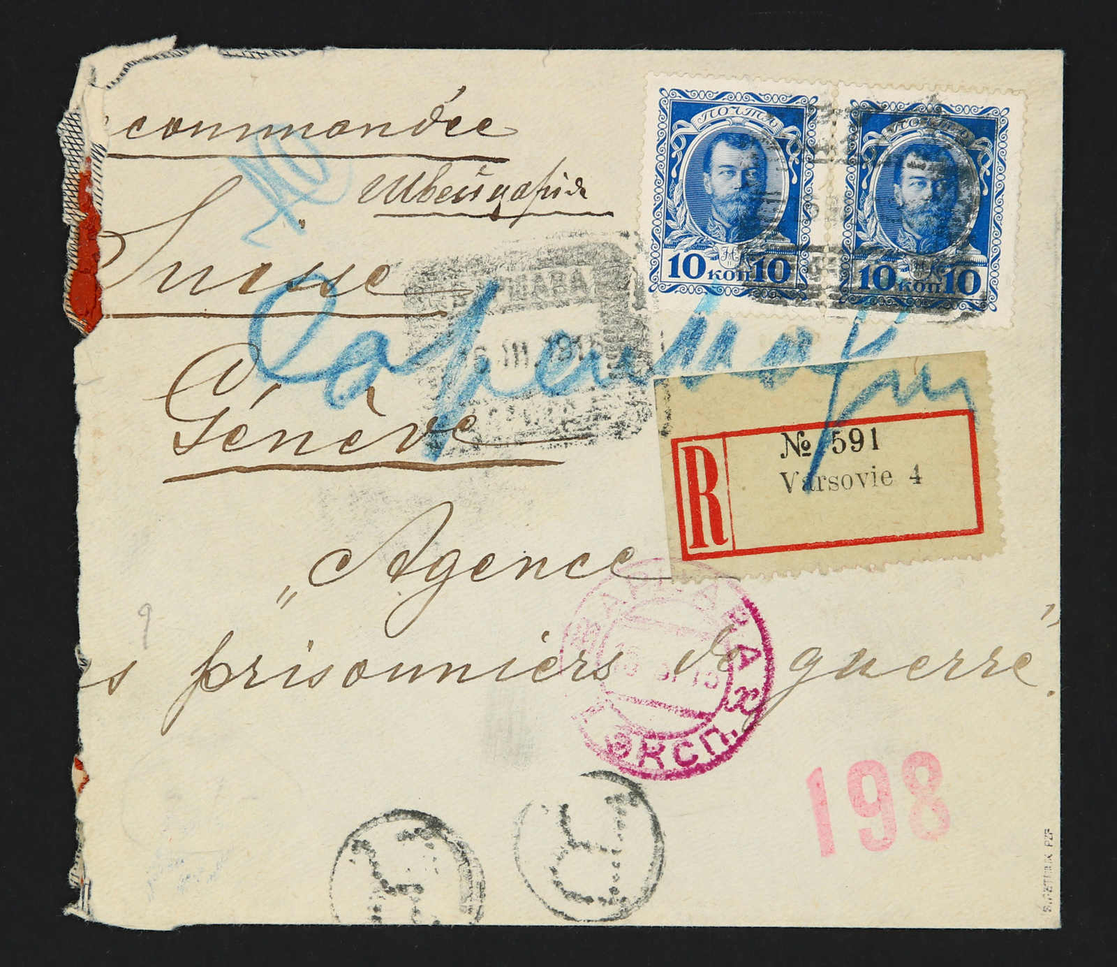 1915, Warschau, zwei russische Zensurbriefe aufgegeben im I. WK in Warschau mit Militärzensur-Siegellack verschlossen, Öffnungsfehler, Bedarfsspuren