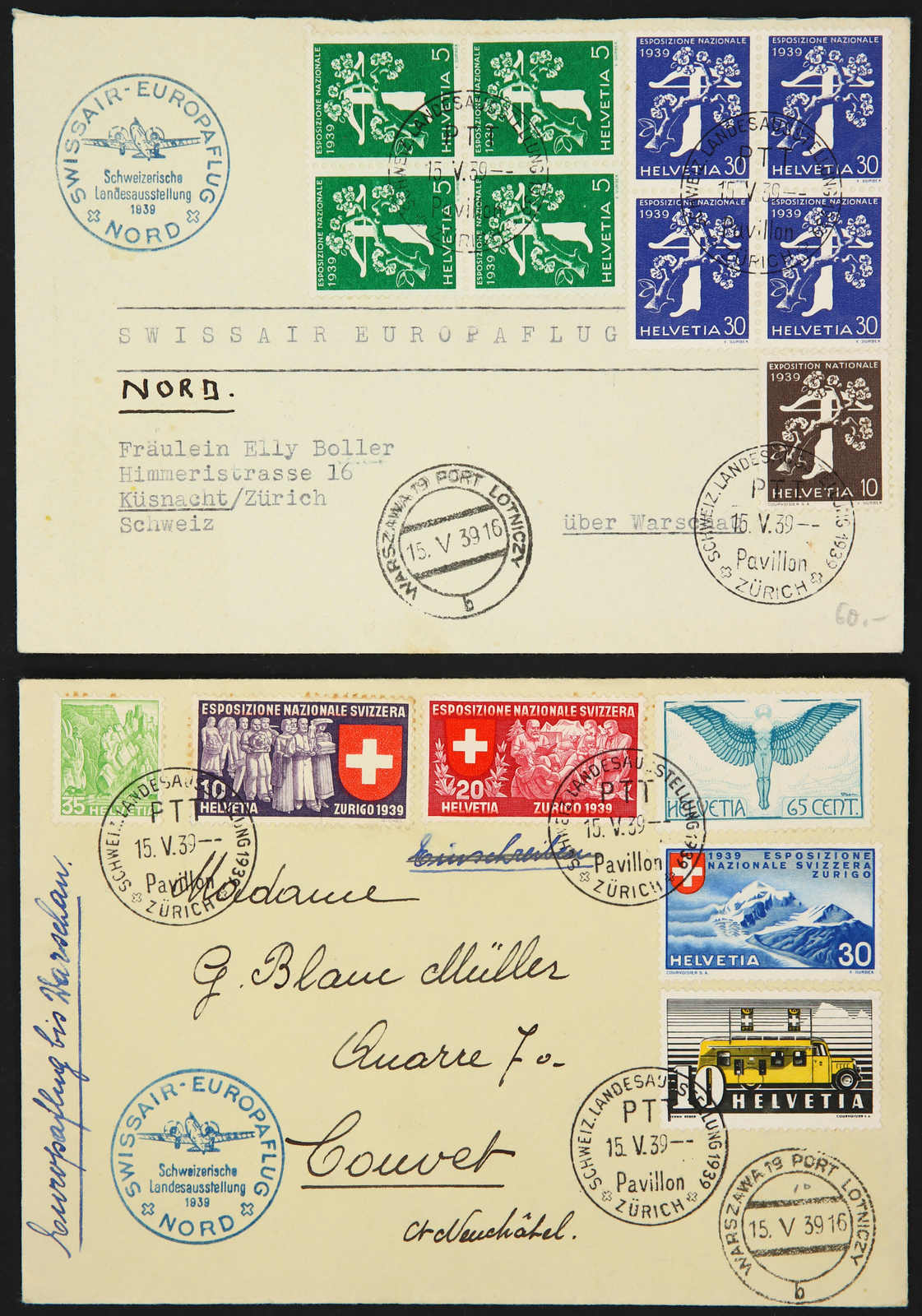 1939, 2 Flugpostbriefe mit Schweizer Frankatur auf Sonderflug "SWISSAIR -EUROPAFLUG", aufgegeben "SCHWEIZER LANDESAUSSTELLUNG ZÜRICH 15.V. 39", befördert über Warschau, vorderseitig mit Bestätigungs- und Durchgangsstp., bis auf einige