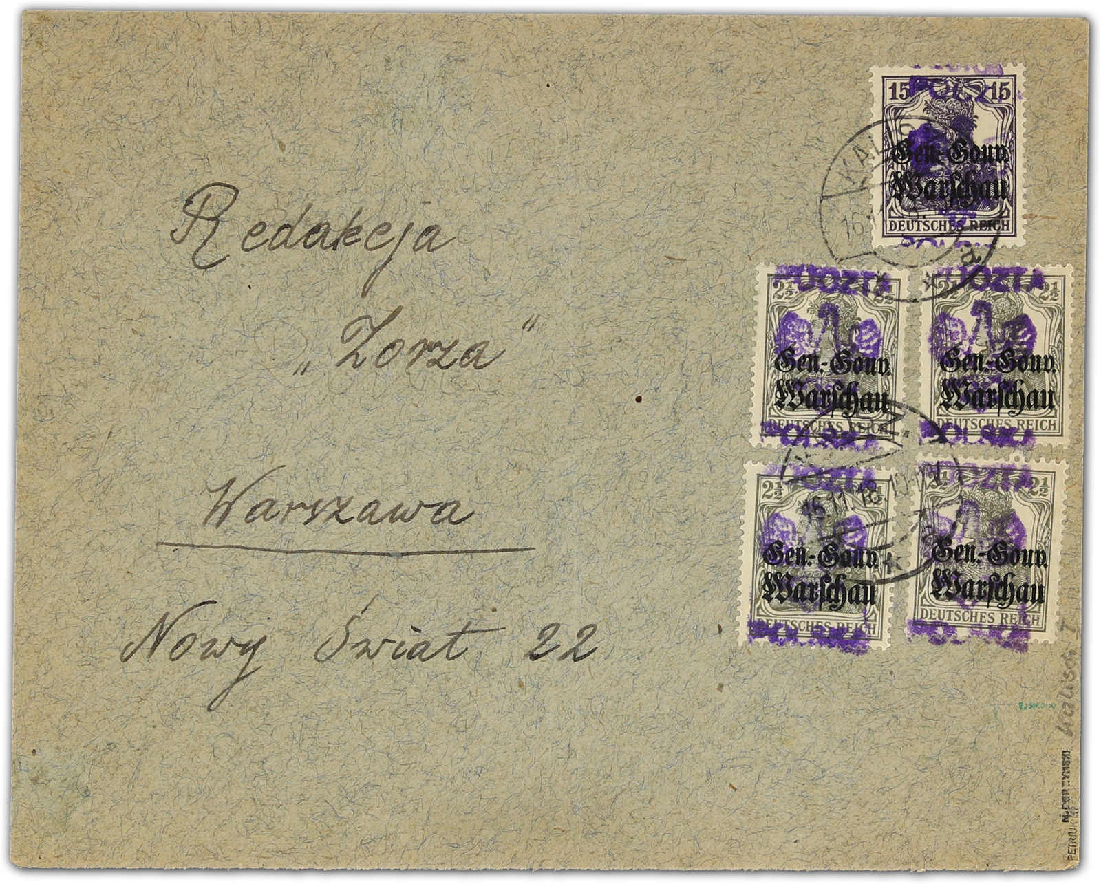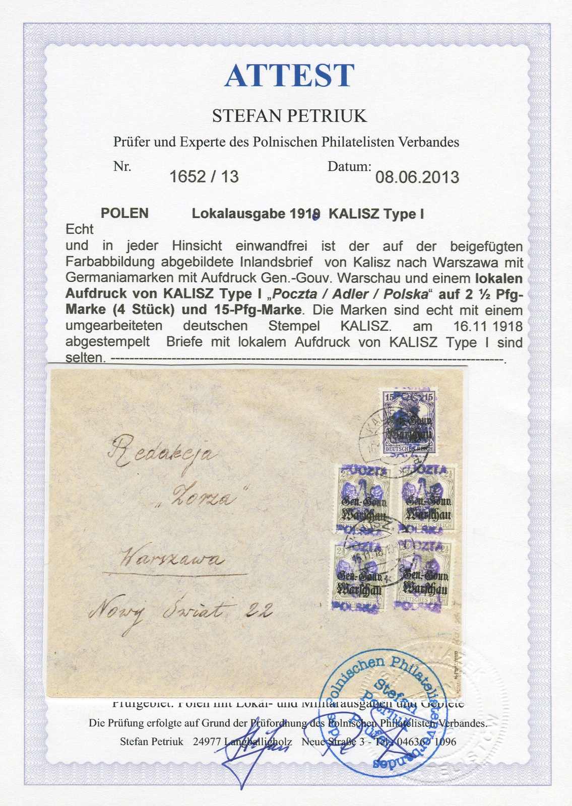 1918, 2½ Pfg. Germania (4x) und 15 Pfg. Germania je mit Aufdrucktype I auf Inlandsbrief von Kalisz nach Warschau, mit umgearbeitetem deutschen Stempel entwertet, Marken in einwandfreier Qualität, Umschlag senkrechter Mittelbug, Briefe mit