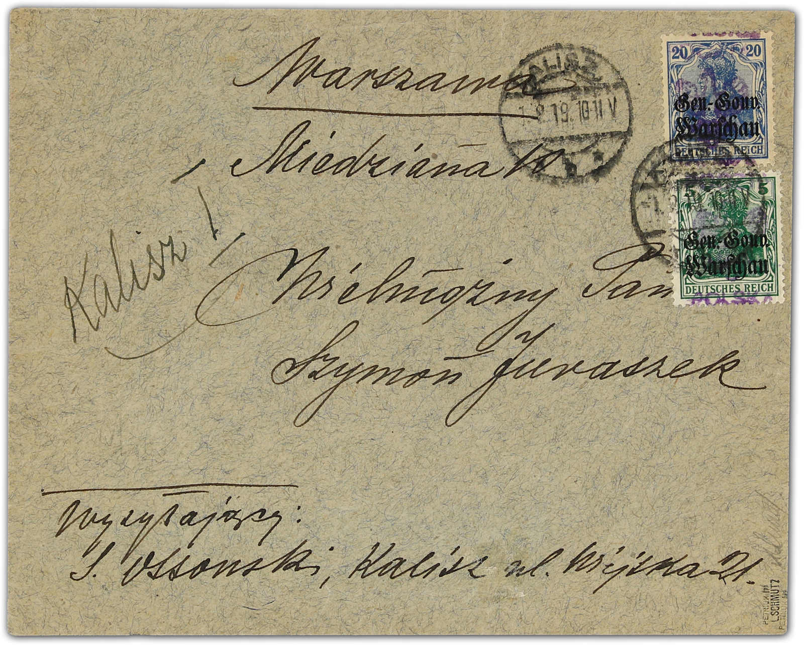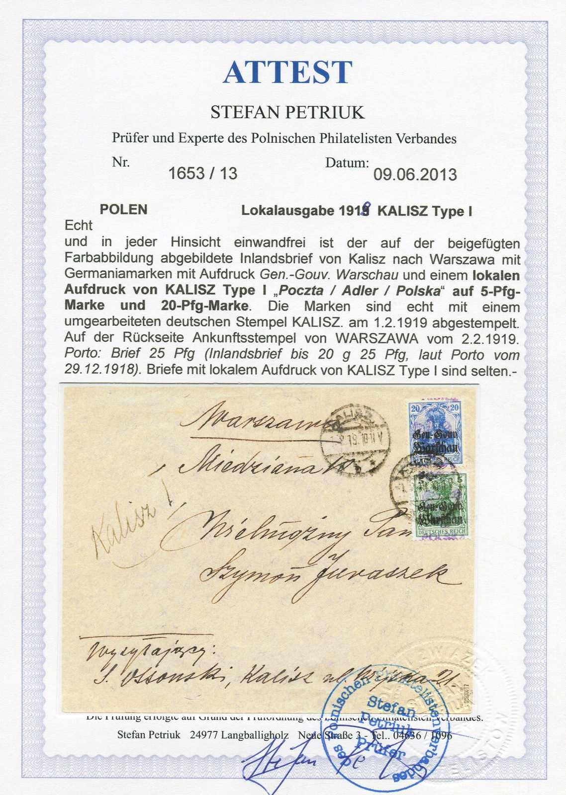 1918, 5 und 20 Pfg. Germania mit Aufdrucktype I auf Inlandsbrief von Kalisz nach Warschau, mit umgearbeitetem deutschen Stempel entwertet, rückseitig Ankunftsstempel, einwandfreie Qualität, Briefe mit dieser Aufdrucktype sind selten,