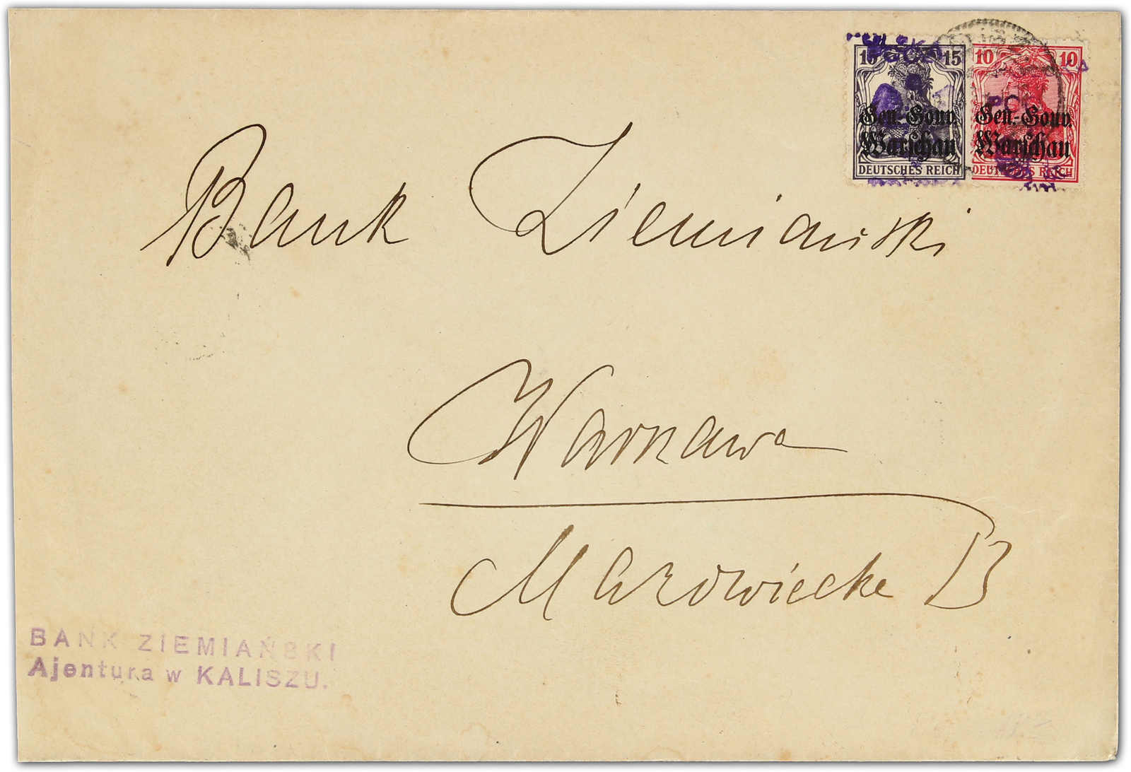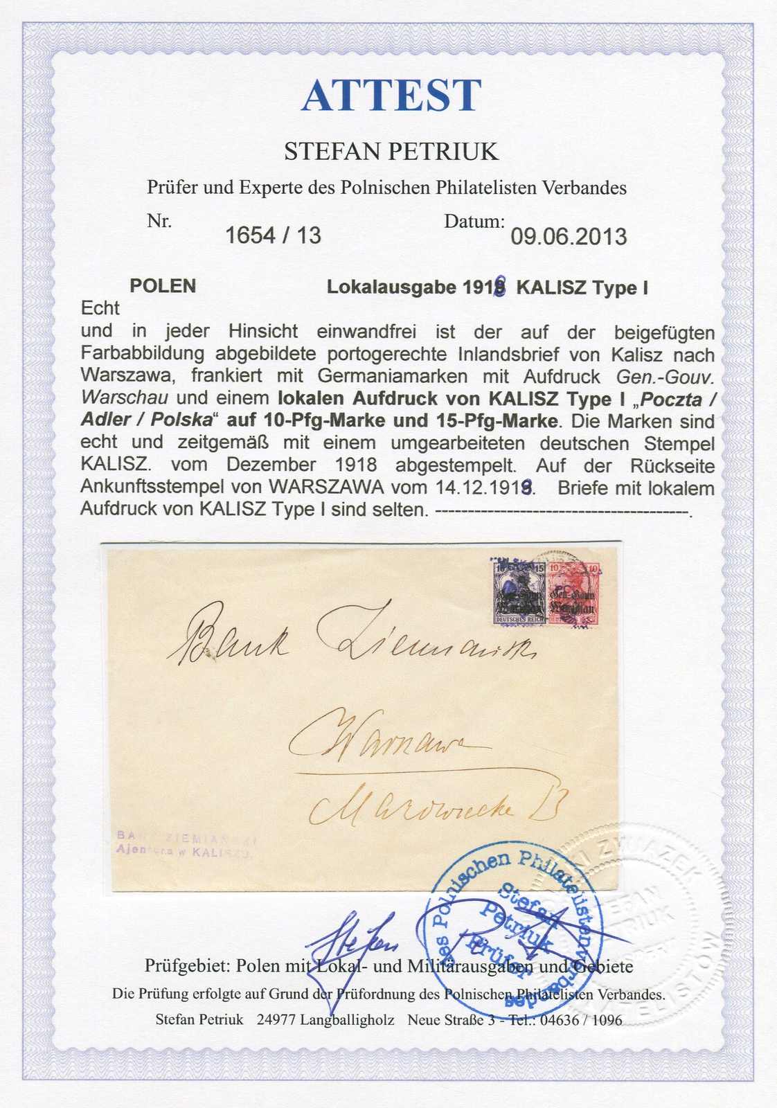 1918, 10 und 15 Pfg. Germania mit Aufdrucktype I auf portogerechtem Inlandsbrief von Kalisz nach Warschau, zeitgerecht mit umgearbeitetem deutschen Stempel entwertet, rückseitig Ankunftsstempel, Marken einwandfrei, Umschlag leicht bügig,