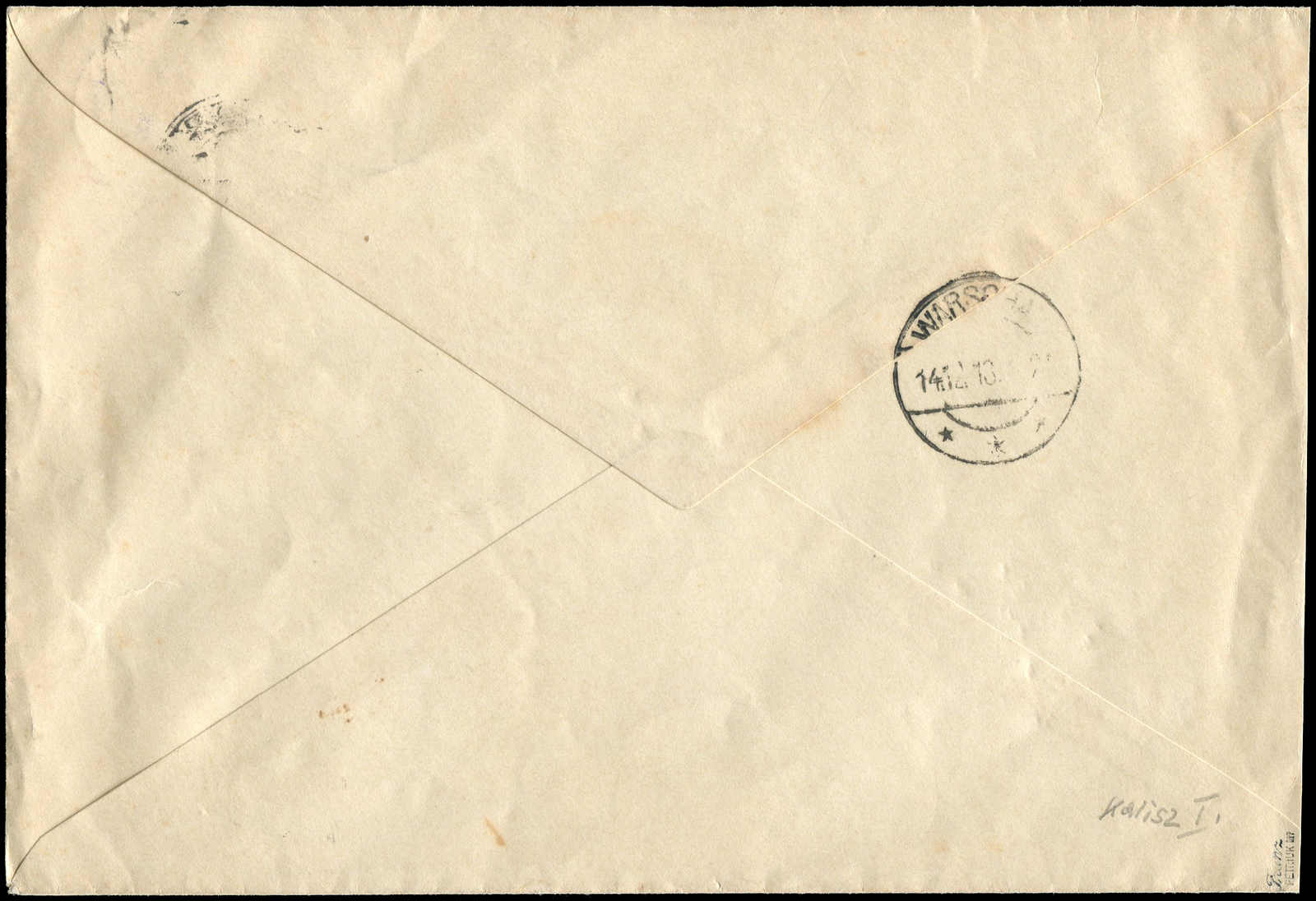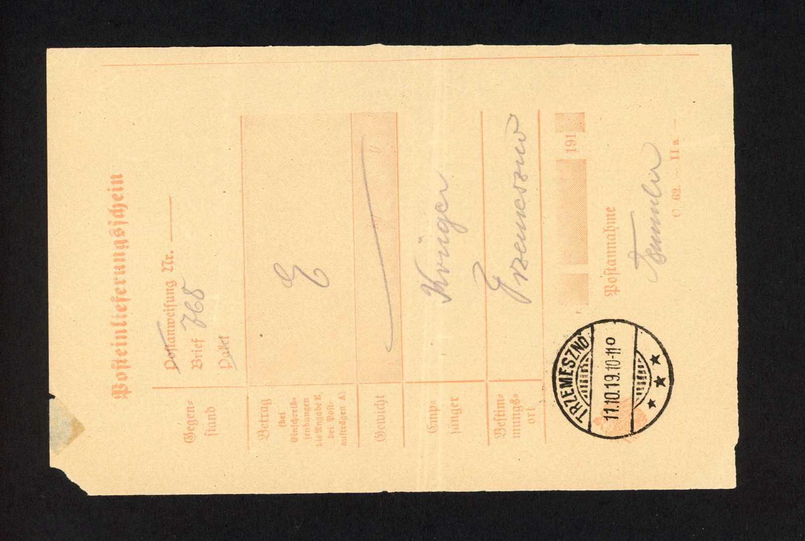 1918, weiterverwendeter Posteinlieferungsschein der Deutschen Reichspost für ein Paket von Kalisz nach Warschau, abgestempelt mit umgearbeitetem deutschen Stempel KALISZ, auf dem Schein oben links violetter Handstempelaufdruck von Kalisz
