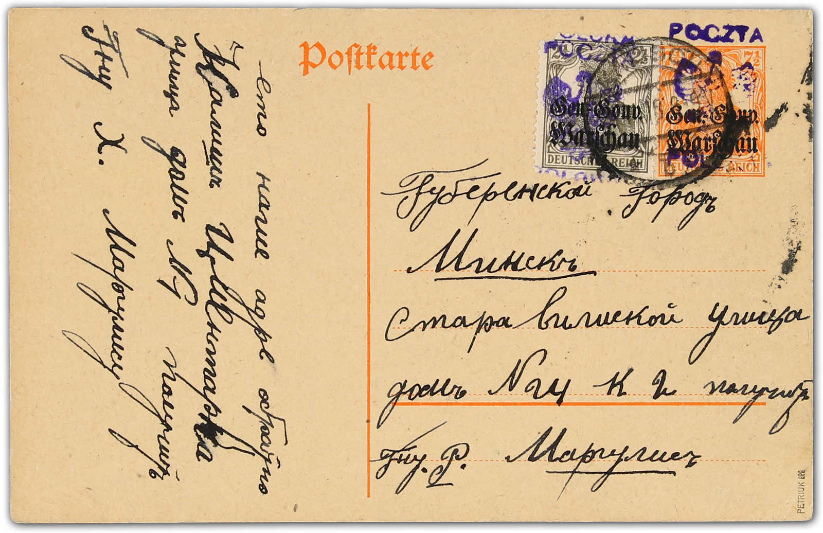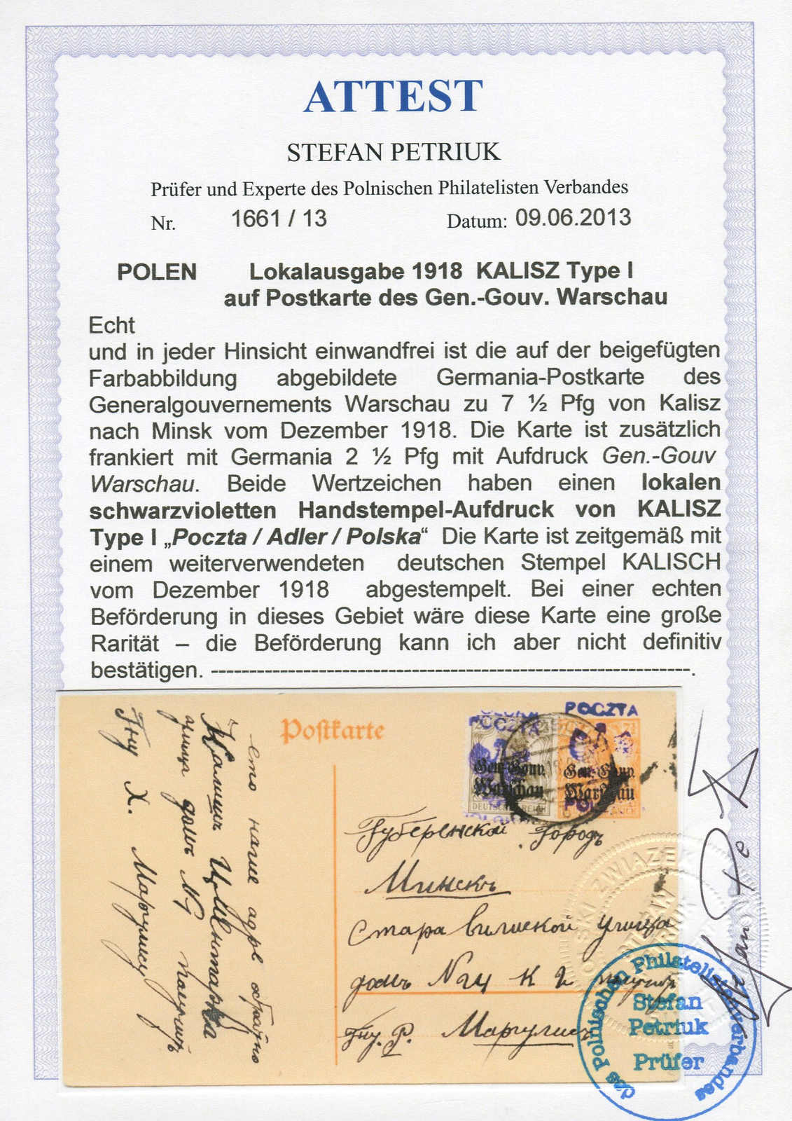 1918, 7½ Pfg. Germania-Ganzsachenkarte mit zusätzlicher 2½ Pfg. Germania mit Aufdrucktype I (linke obere Ecke beschädigt) von Kalisz nach Minsk, zeitgerecht mit weiterverwendetem deutschen Stempel entwertet, eine Beförderung kann jedoch