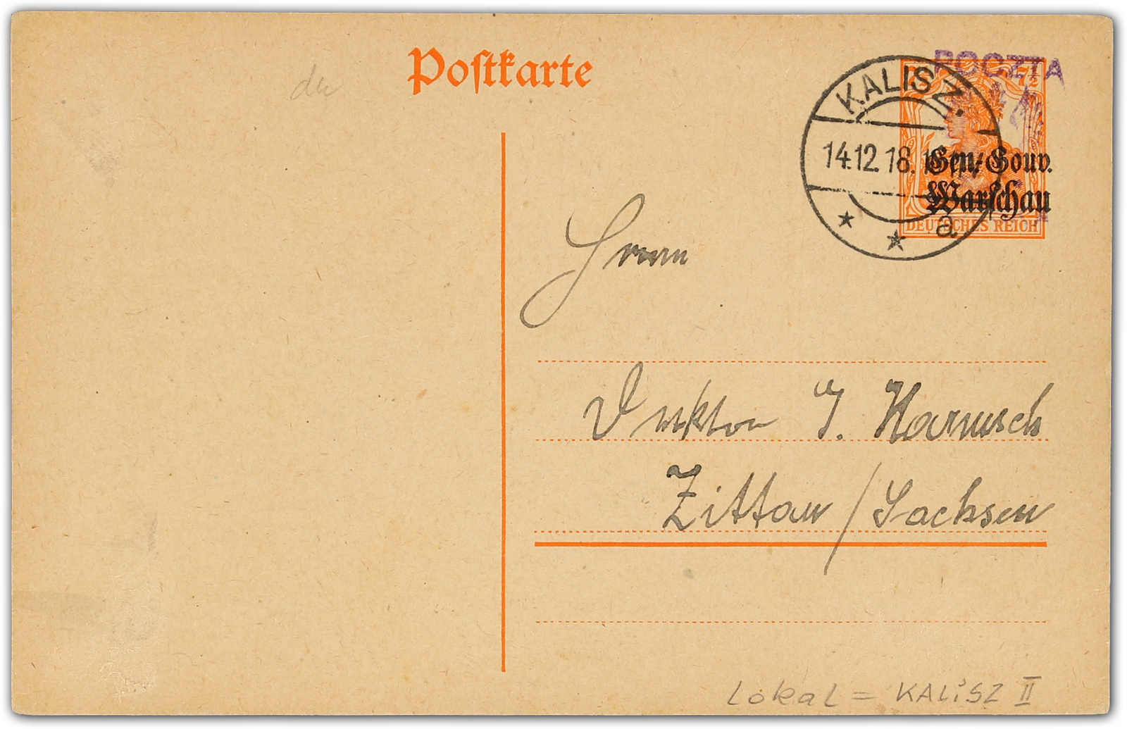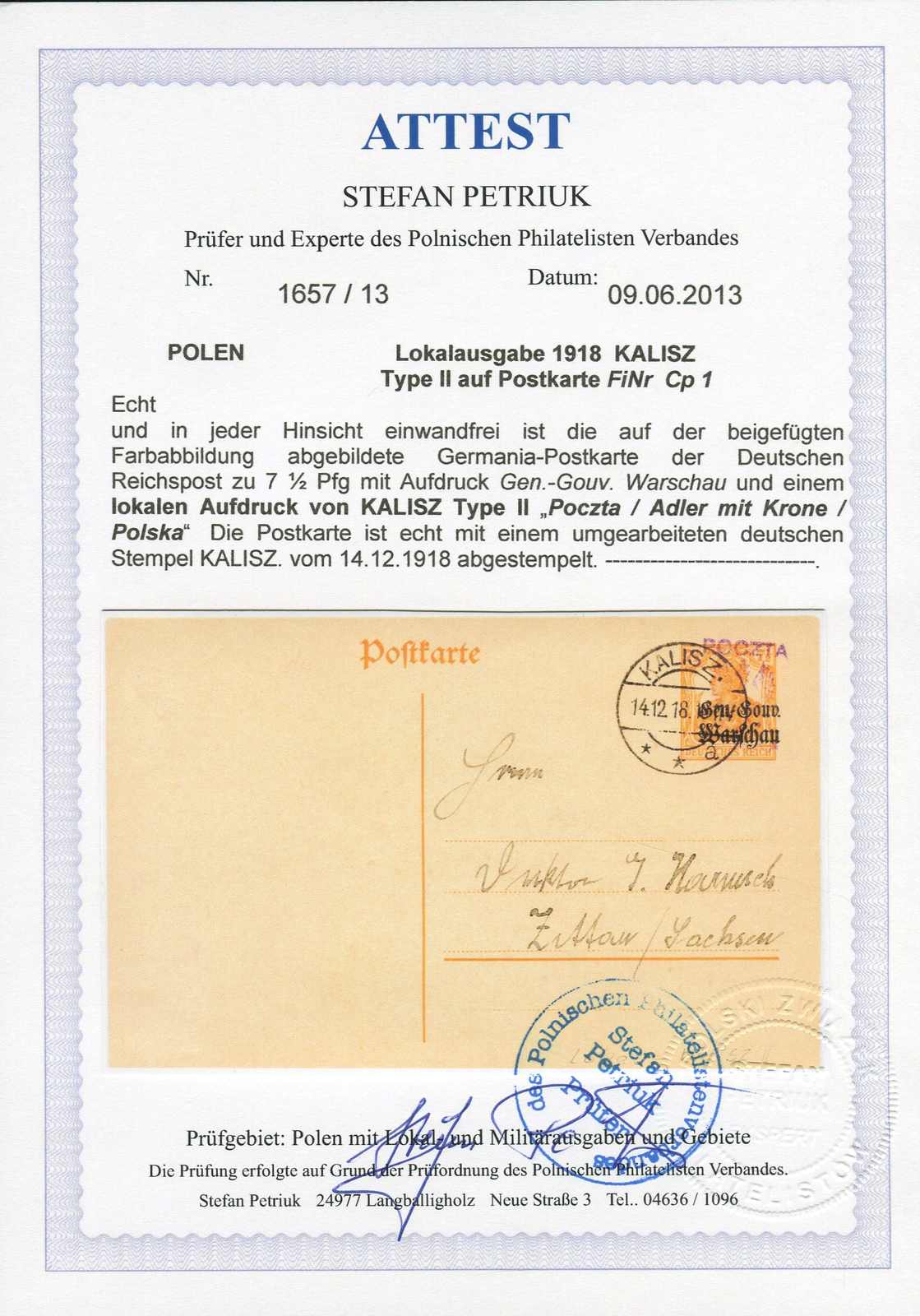 1918, 7½ Pfg. Germania-Ganzsachenkarte mit Aufdrucktype II von Kalisz nach Zittau, mit umgearbeitetem deutschen Stempel entwertet, einwandfreie Qualität, signiert Petriuk BPP, Fotoattest Petriuk (Image) (imagea)
