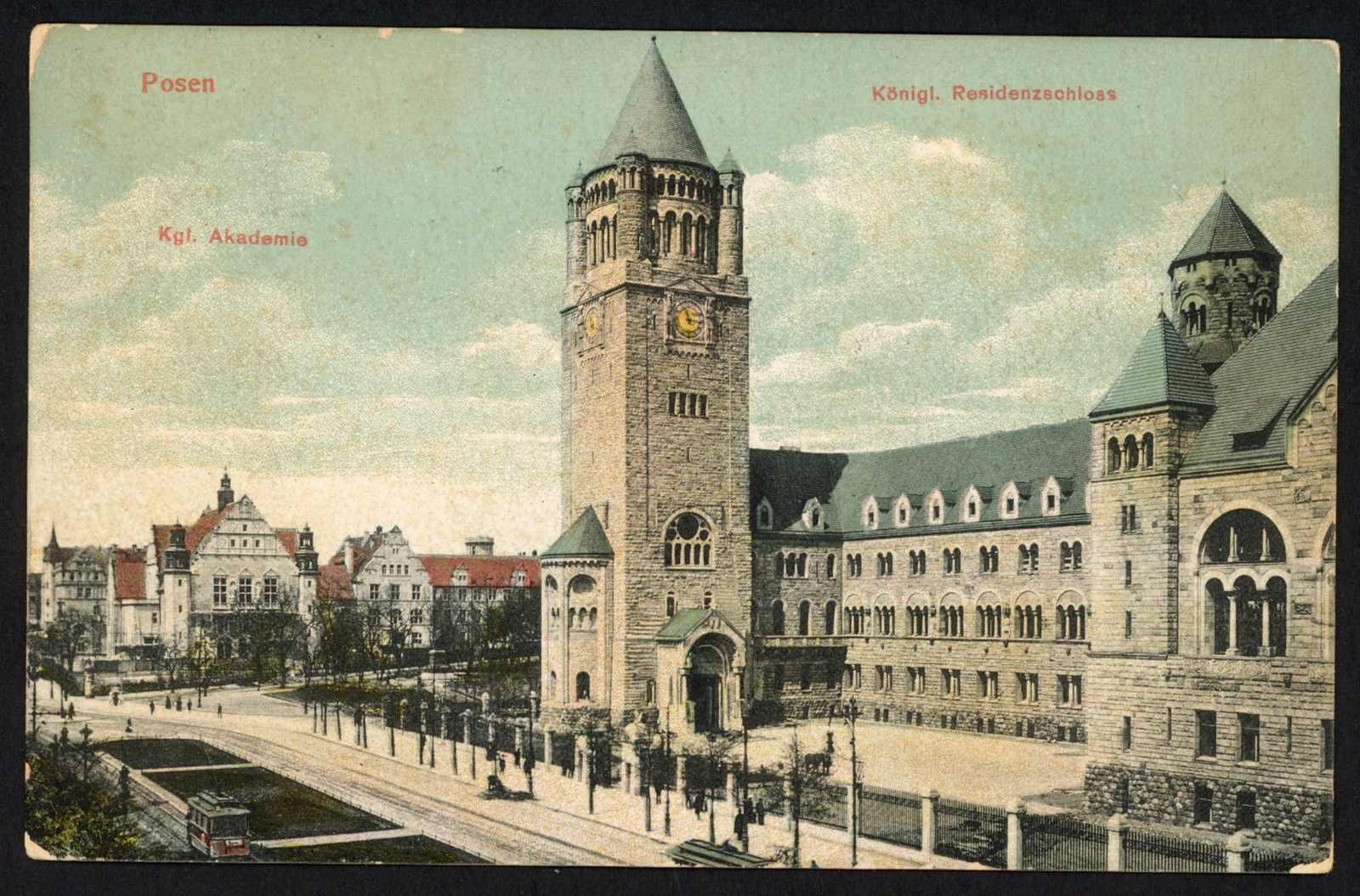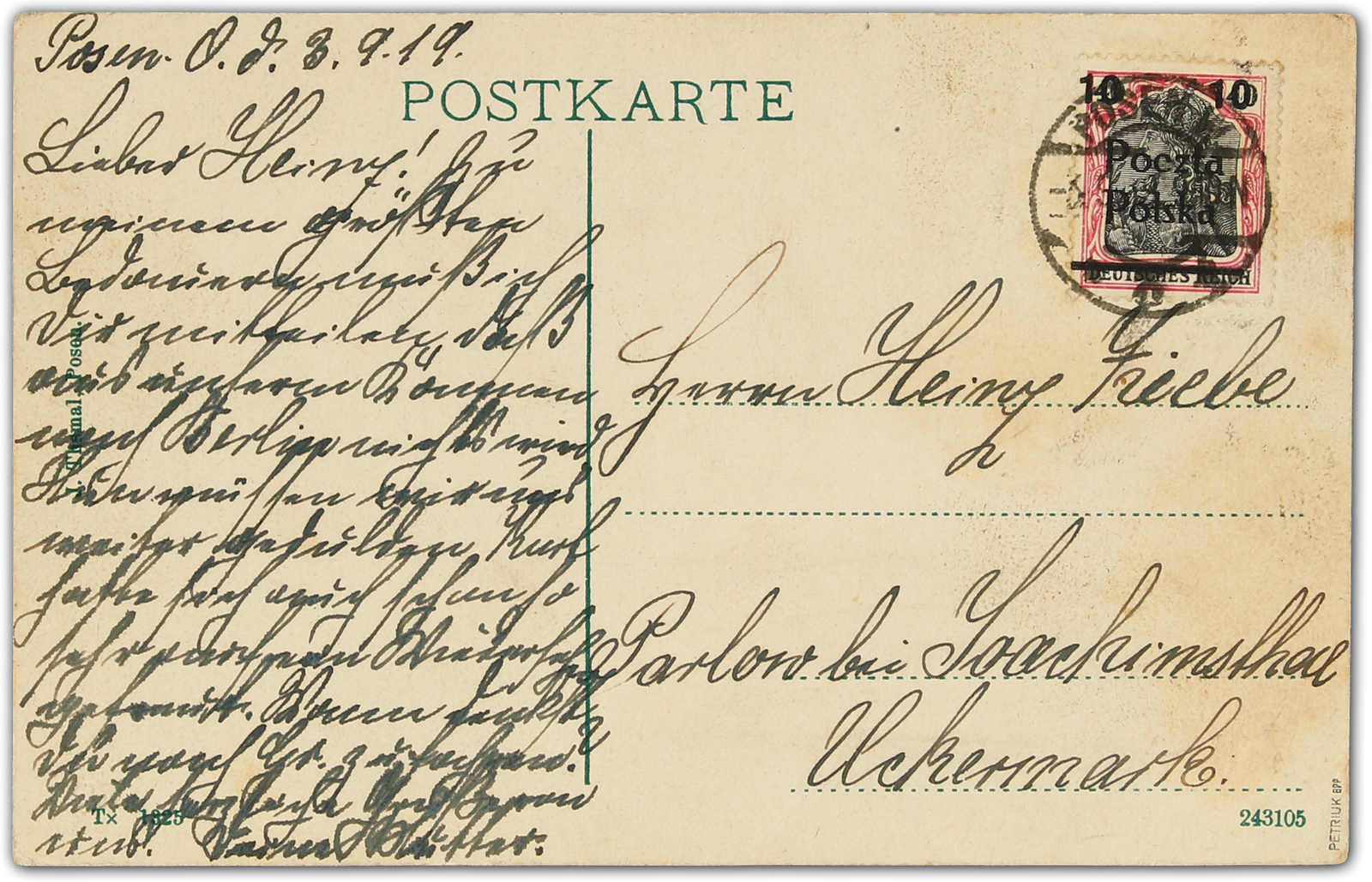 1919, farb. Ansichtskarte Posen Residenzschloss mit 10 Fen. Überdruck auf 40 Pfg. Germ. ab Posen W 3 3.9.19 nach Parlow bei Joachimsthal Uckermark. Sign. Petriuk BPP. (Image) (imagea)