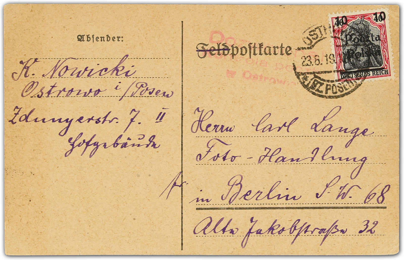 1919, Feldpost-Vordruckkarte, =Feld= gestrichen, als Fern/Auslandskarte mit 10 Fen. auf 40 Pfg. Germ. Aufdruck Poczta Polska ab Ostrowo Bz. Posen 23.8.19 mit Zensurstempel rot nach Berlin. Sign. Petriuk BPP. (Image) (imagea)