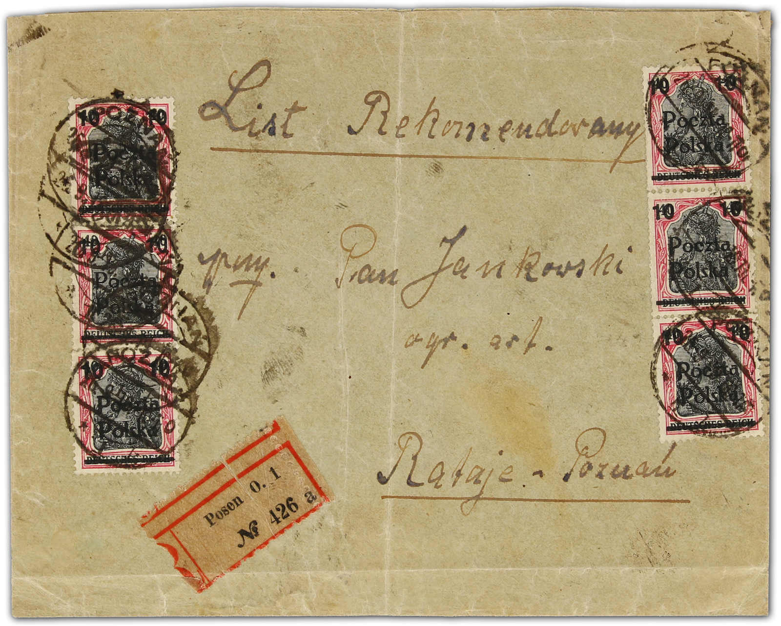 1919, Brief Einschreiben über 20 g (40 + 20 Fen.) mit 6 X 10 Fen. auf 40 Pfg. Germ. Überdruckausgabe ab Poznan / Posen 26.9.19 mit Ankunft Poznan - nach Rataje-Poznan. Umschlag deutliche Faltspuren und etwas fleckig, aber recht seltene