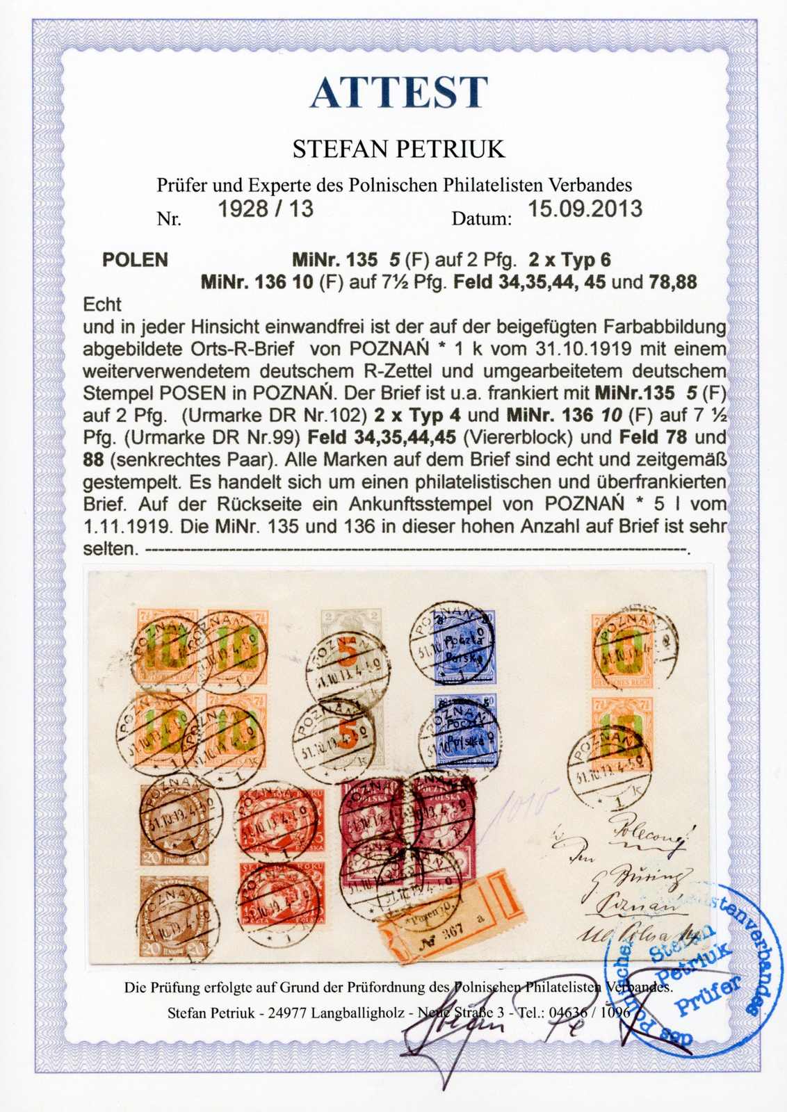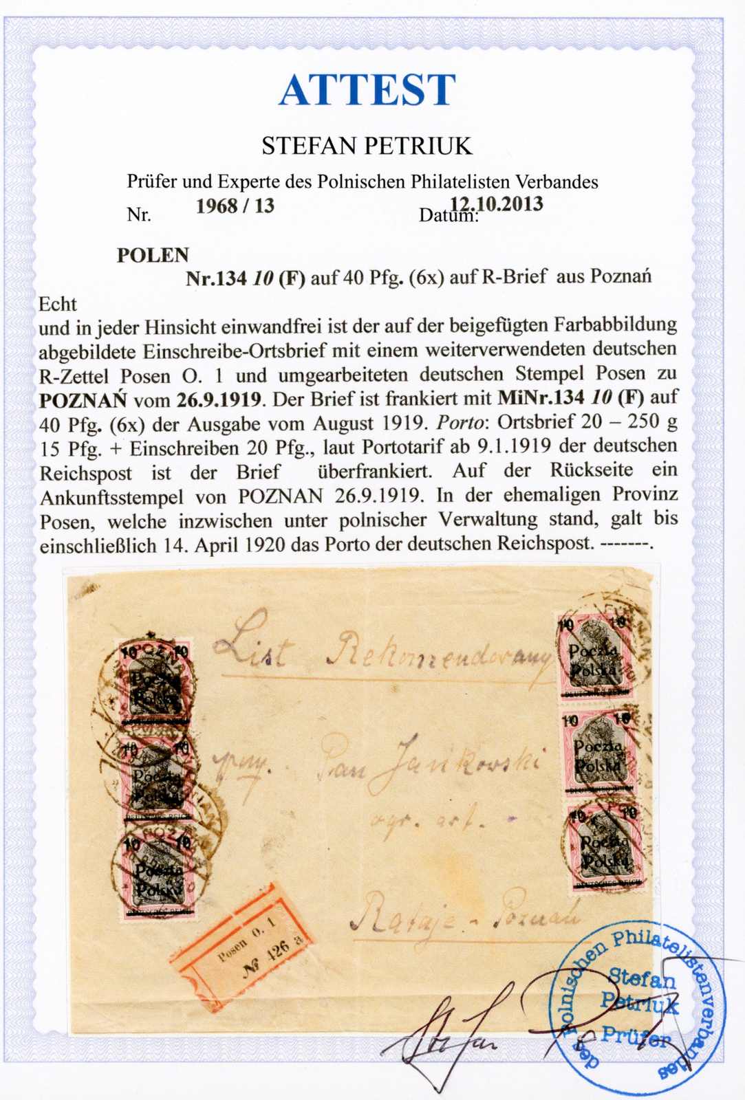 aufgenommen... mit Aufgabestempel Poznan 1 31.10.19. 8 Marken der 2. Posener Ausgabe und dazu in MiF sind äußerst selten. Hier natürlich nicht portogerecht und sicherlich philatelistisch beeinflusst. Fotoatteste Schmutz und Petriuk (Image) (imagea)