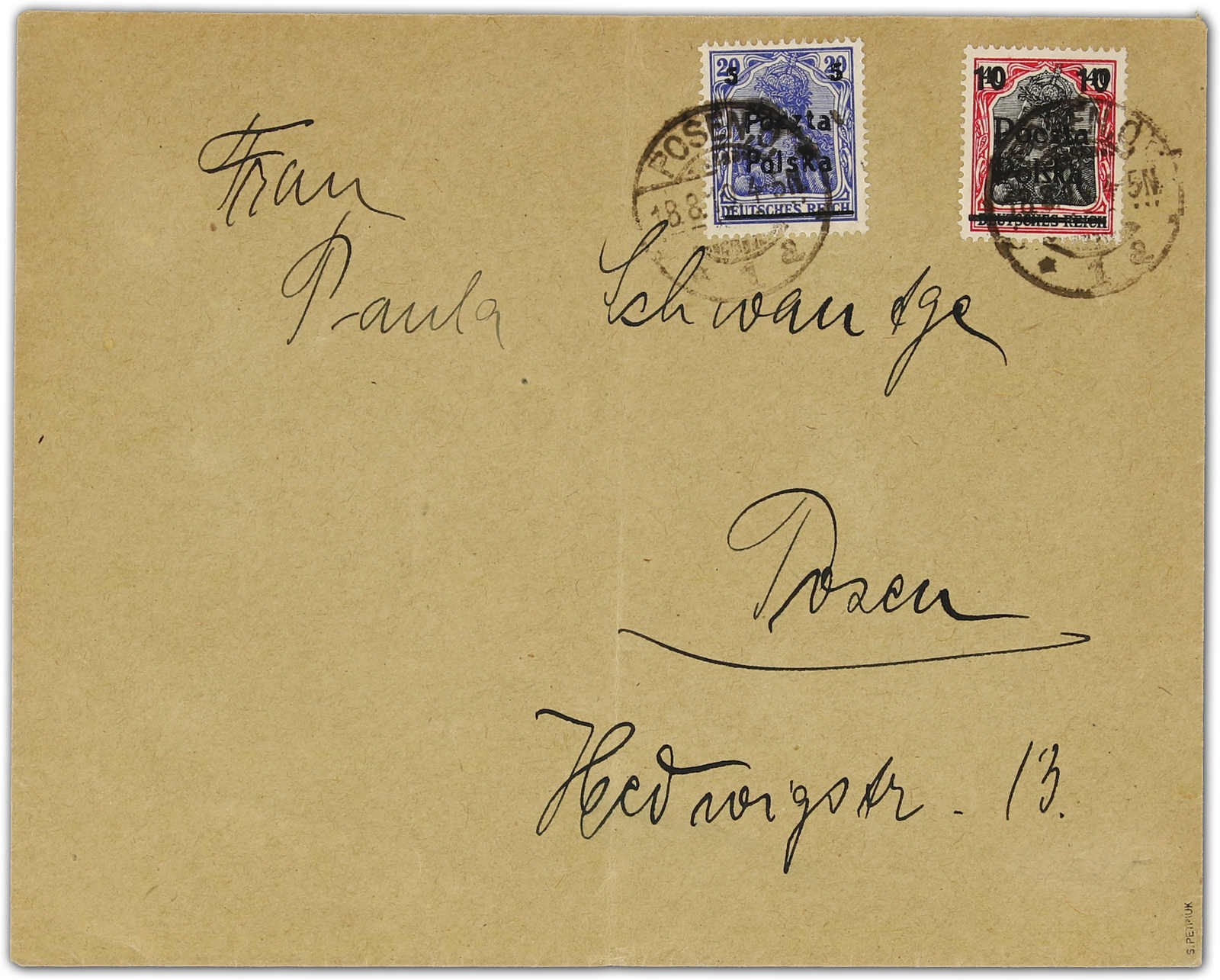 1919, Ortsbrief 15 Fen. mit 5 auf 20 und 10 auf 40 Pfg. Germ. gebraucht Posen 1 =O= 18.8.19. Umschlag senkrecht gefaltet. Signiert Petriuk.