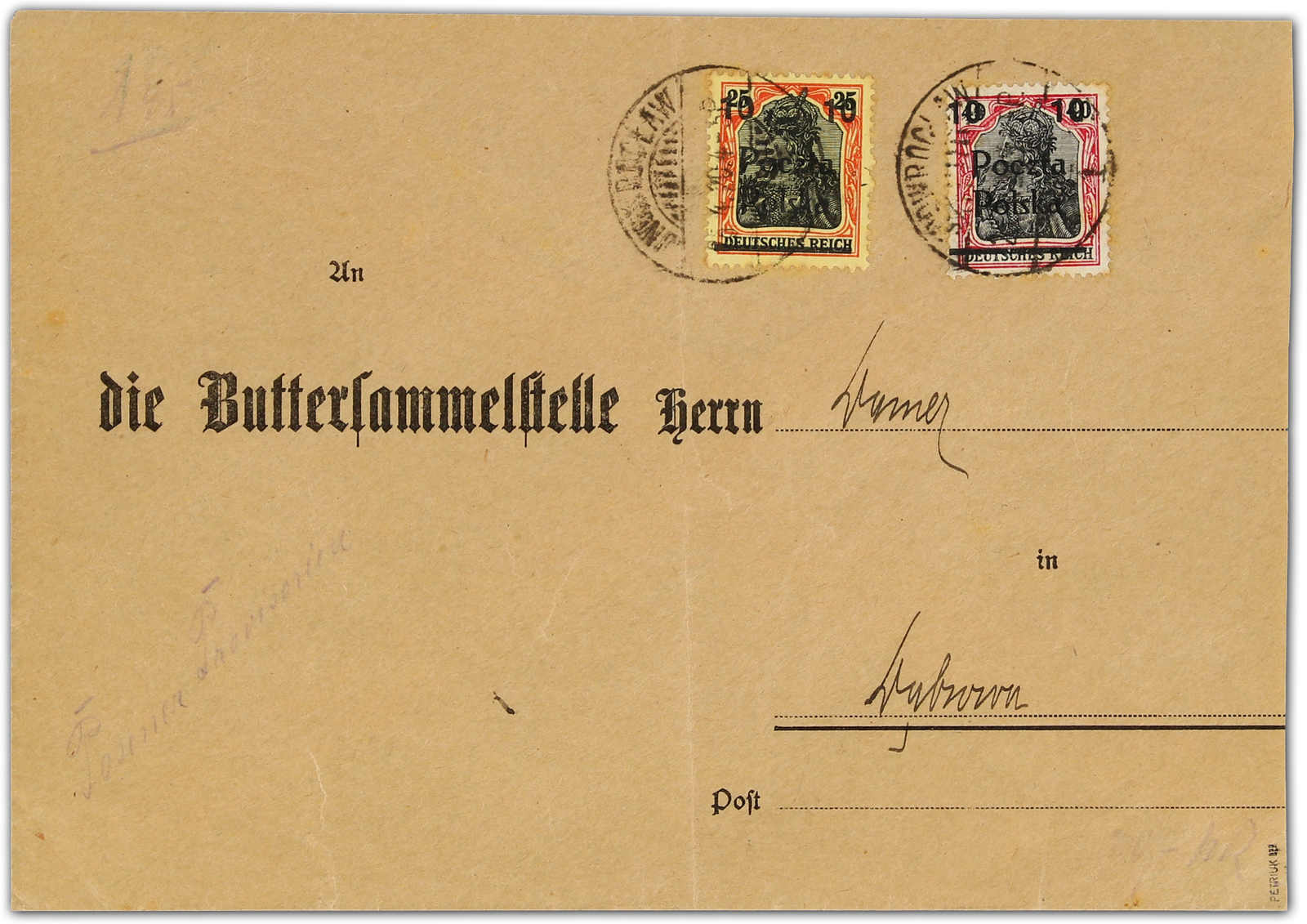 1919, Vordruckumschlag Buttersammelstelle mit 2 X 10 Fen. Aufdruck auf 25 + 40 Pfg. Germ. Inowroclaw 25.4.20 nach Dabrowa. Umschlag 2seitig geöffnet, rechts etwas verkürzt und senkr. gefaltet. Sign. Petriuk. (Image)