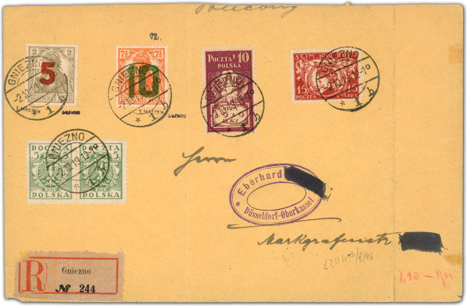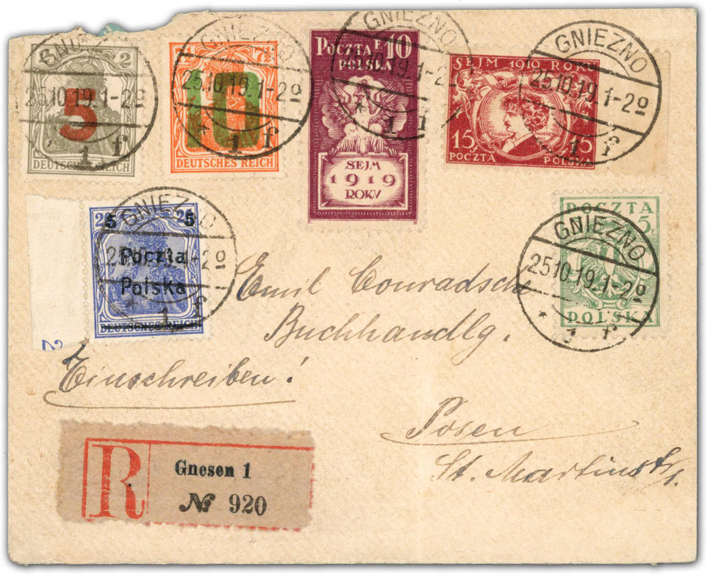 1919, kleiner Umschlag Einschreiben, links oben durch Öffnung etwas uneben, kl. Ausriss, mit 5 und 10 Fen. 2. Posener Ausgabe, dazu 5 auf 20 Germ., 5 F Adler, 10 + 15 Fen. Sondermarken ab Gniezno 25.10.19 nach Posen. Sign. Jungjohann und