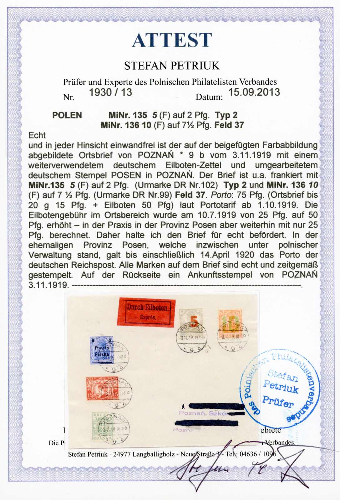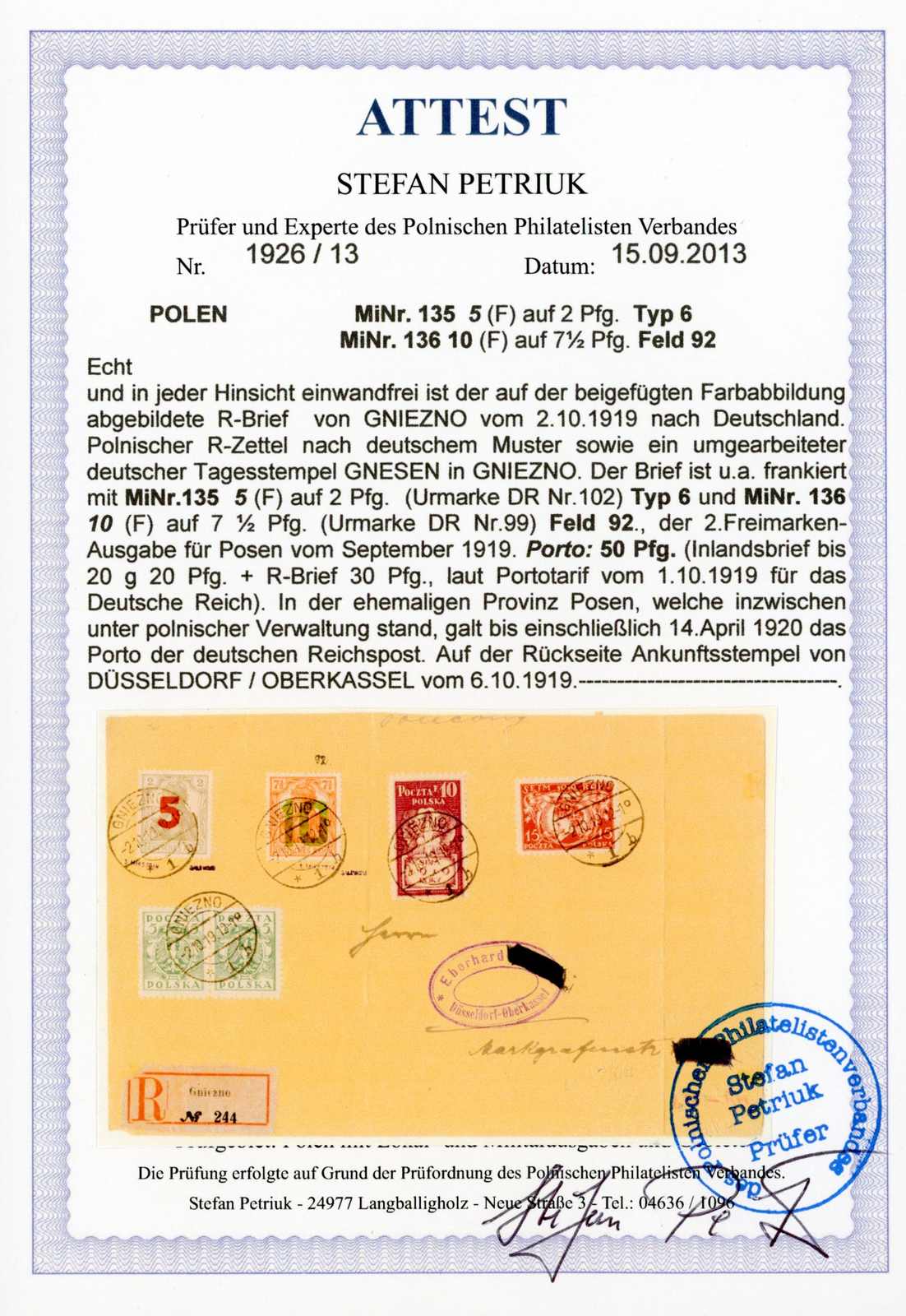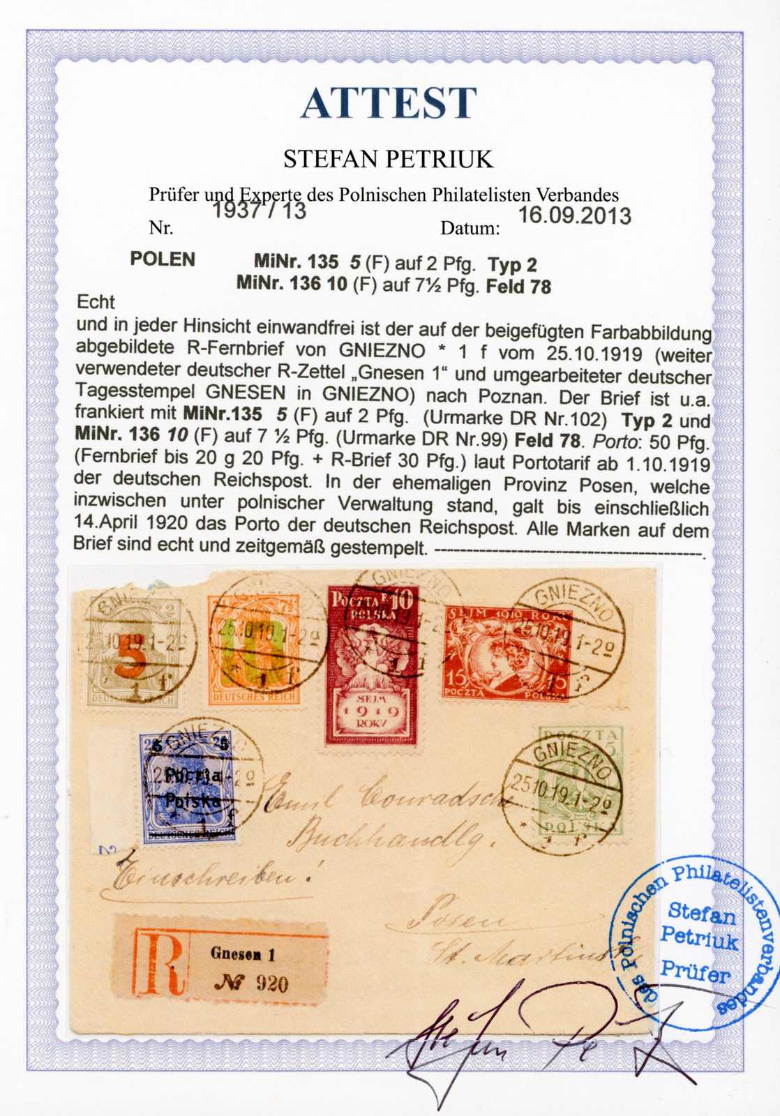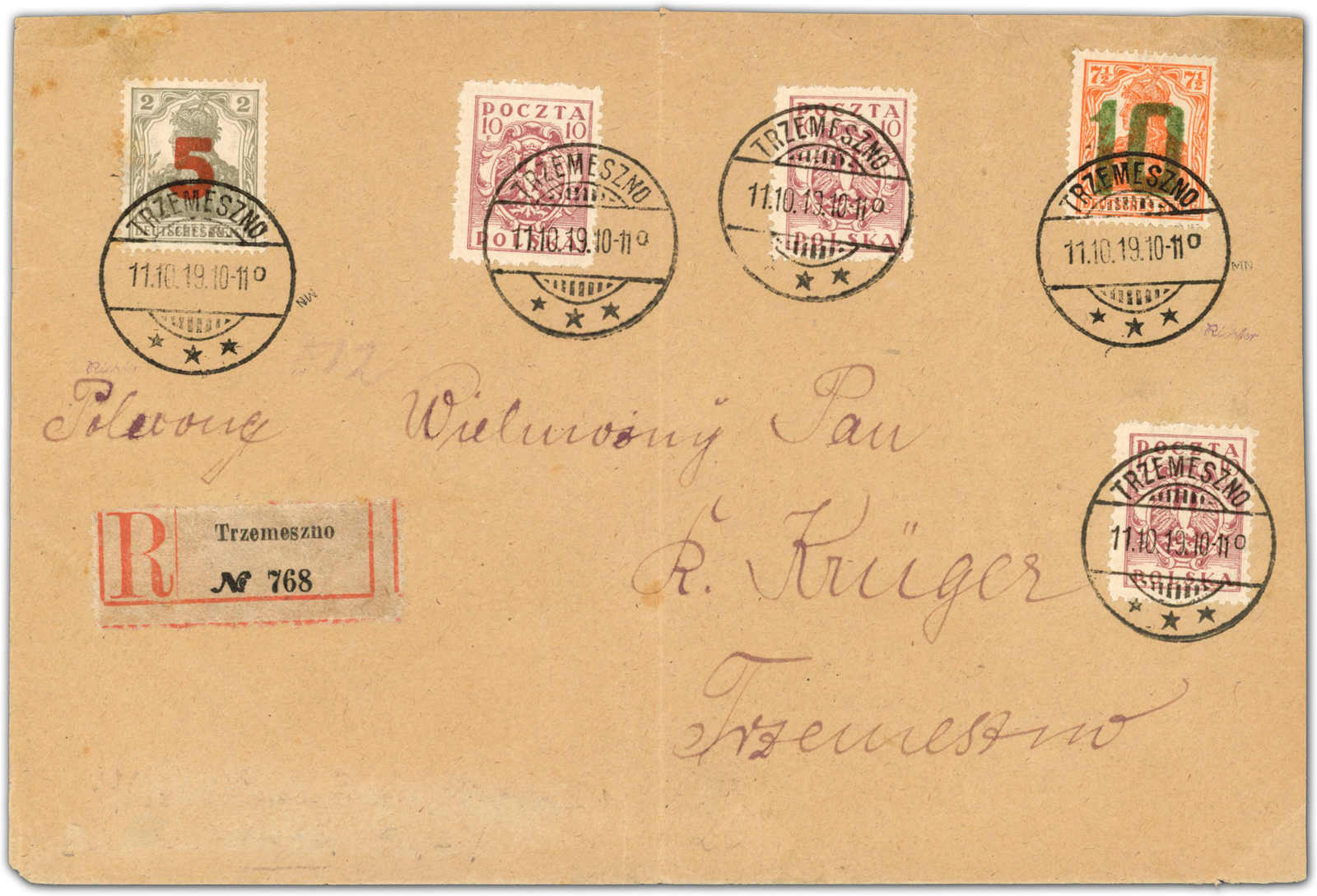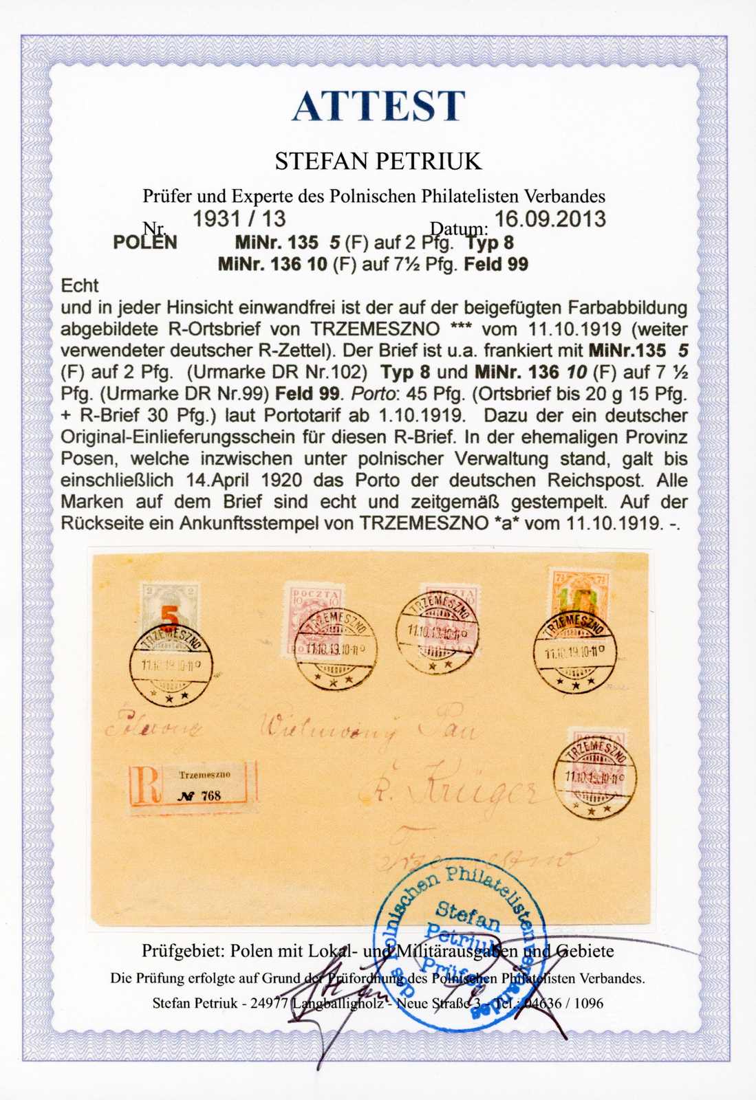 1919, Ortsbrief Einschreiben mit 5 + 10 Fen. 2. Posener Ausgabe, dazu 3 X 10 Fen. Adler gebraucht Trzemeszno 11.10.19. Umschlag etwas Spuren, senkr. gefaltet. Dazu Einlieferungsschein aus alten DR-Beständen. Sign. und Fotoattest Petriuk