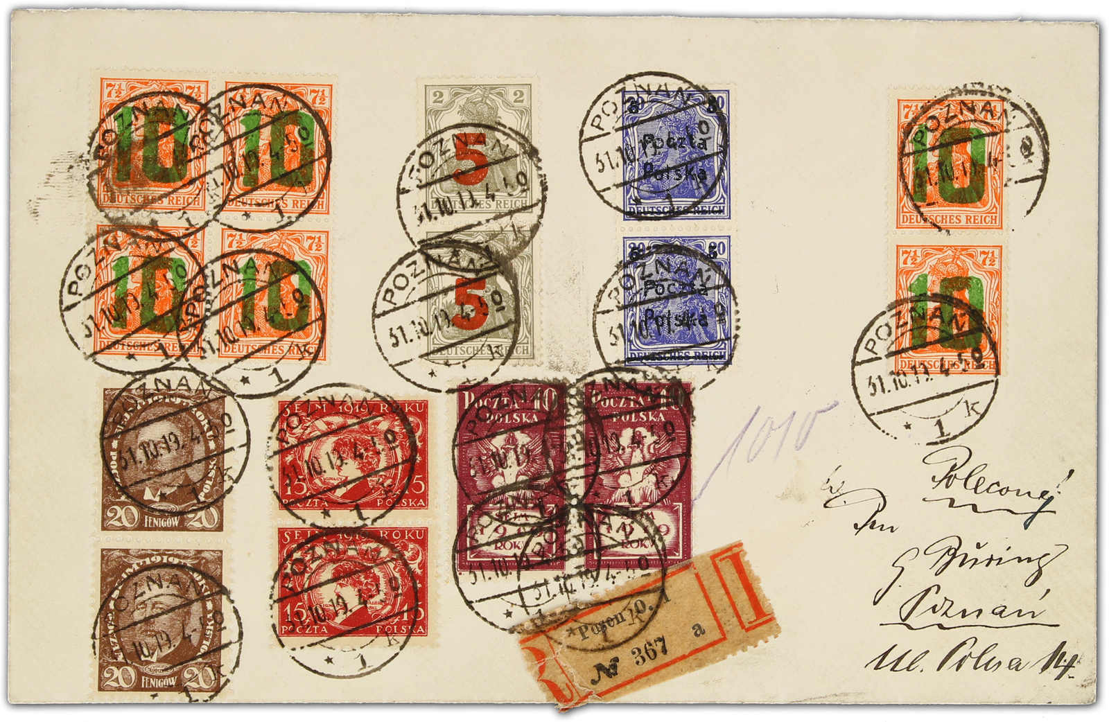 1919, Ortsbrief Einschreiben mit 2 X 5 Fen. und 6 X 10 Fen. 2. Posener Ausgabe. Verklebt sind 2 X Type 6 und bei 10 Fen. die Felder 34,35,44,45,78,88. Dazu 2 X 5 auf 20 Pfg. Germ., Inhalt war ungebr. Formular Posen Telefongespräch