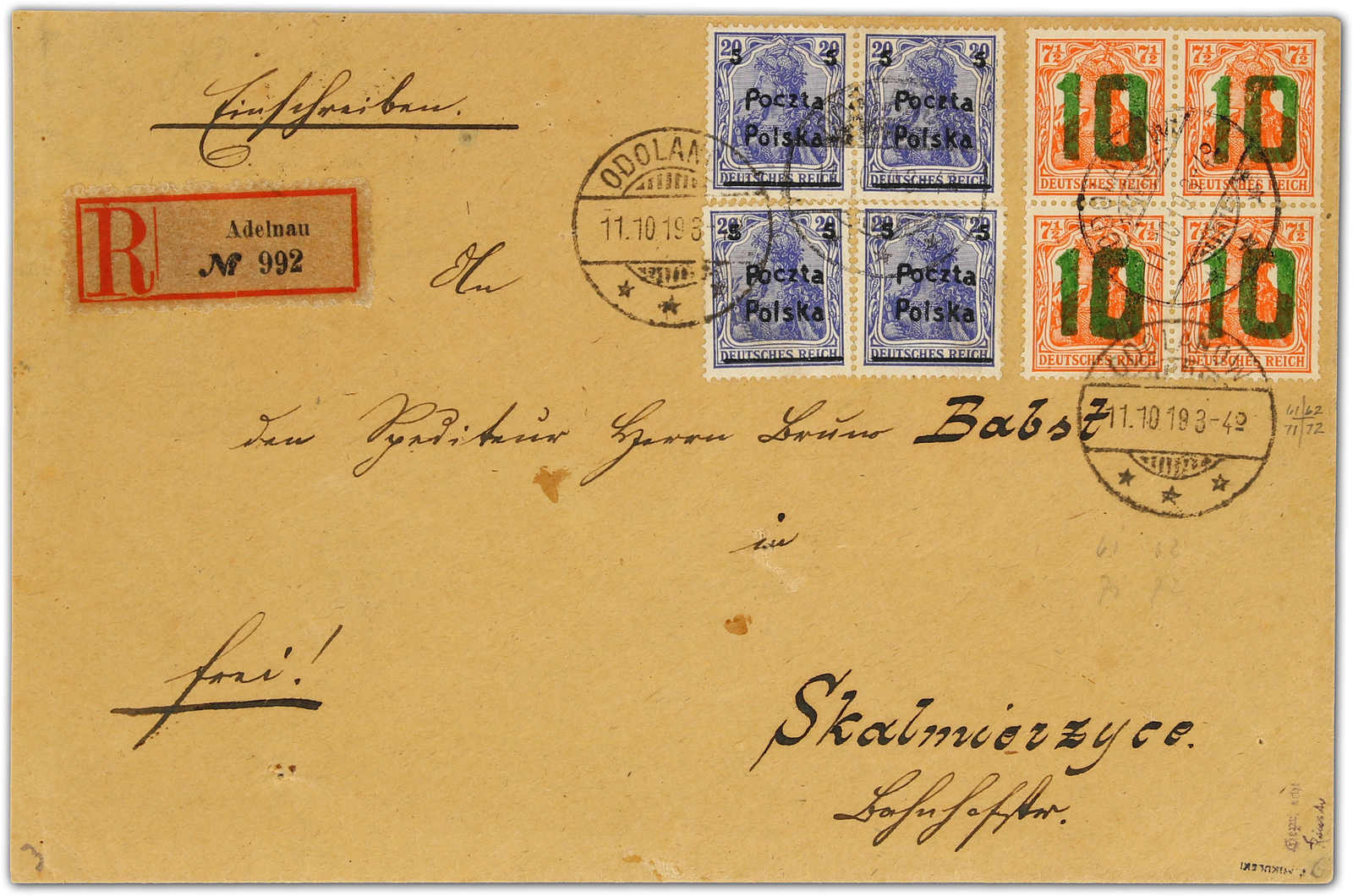 1919, Fernbrief der 2. Gewichtsstufe mit Einschreiben ( 30 + 30 R ) mit 4 X 5 auf 20 Germ. und 4 X 10 auf 7½ Pfg. Germ. - 1. und 2. Freimarkenserie für Posen - gebraucht Odolanow / Adelnau 11.10.19 nach Skalmierzyce 12.10.19 Ankunft. Die