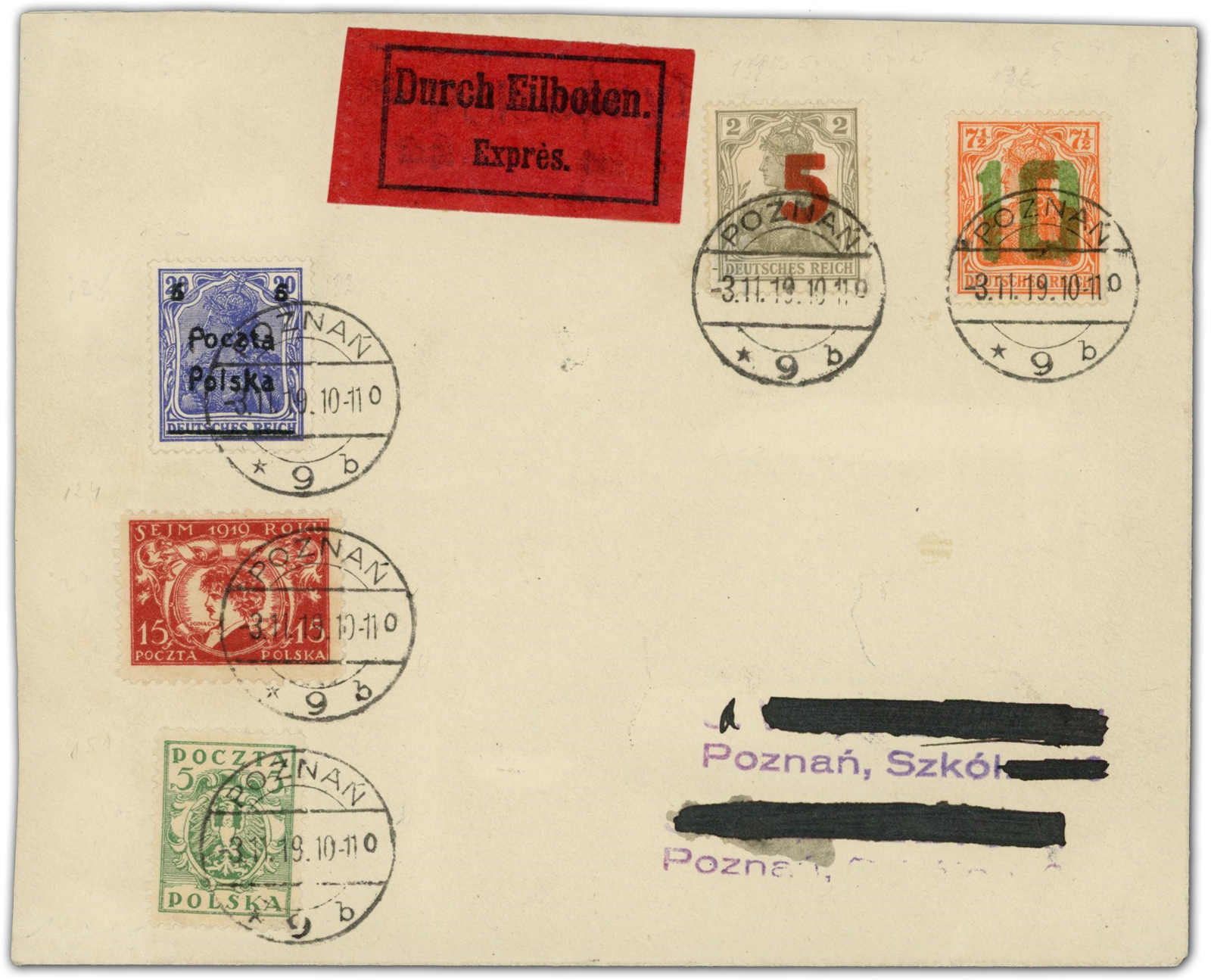 1919, Ortsbrief 15 Fen. mit den 2 Werten 2. Posener Ausgabe, dazu 25 Fen. Eilgebühr mit 5 auf 20 Pfg. Germania, 5 Fen. Adler und 15 Fen. Sondermarke ab Poznan 3.11.19. Die Anschrift teilw. geschwärzt. Die Aufdruckwerte 5 und 10 sind unten