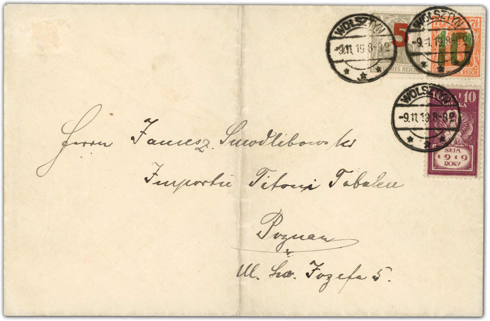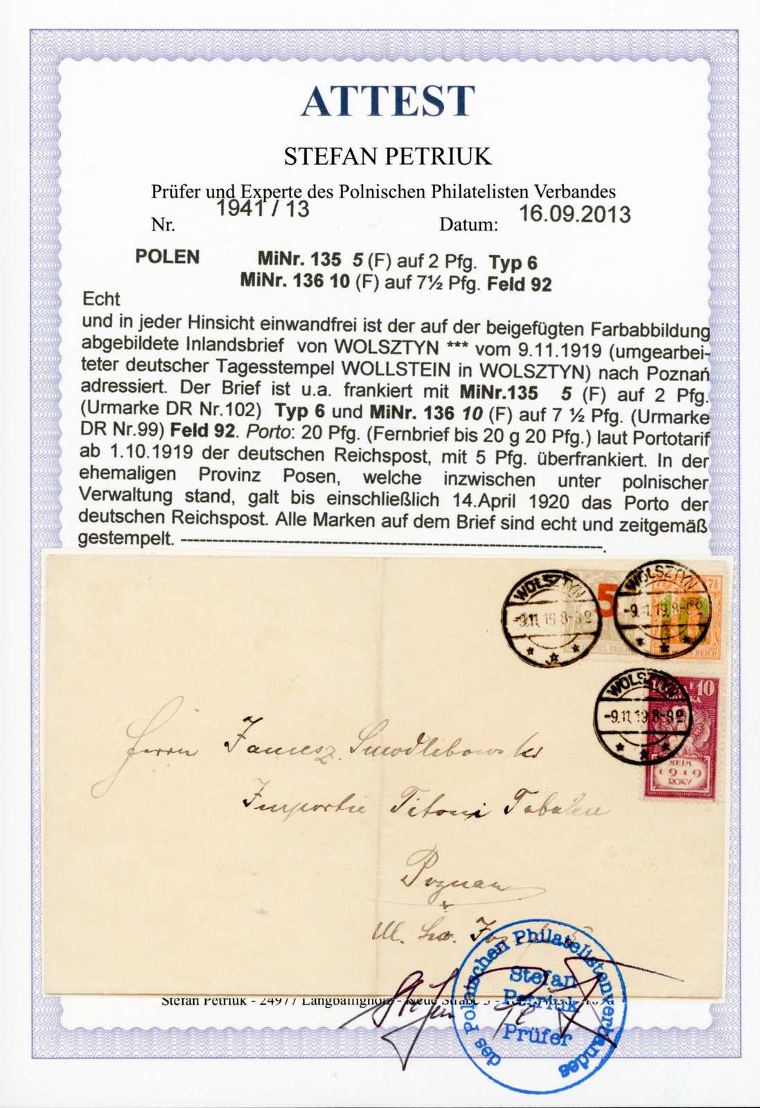 1919, Fernbrief 2. Gewichtsstufe mit 5 und 10 Fen. 2. Posener Ausgabe, dazu Sondermarke 10 Fen. ab Wolsztyn 9.11.19 nach Poznan. Umschlag senkr. stark gefaltet. Sign. und Fotoattest Petriuk. (Image) (imagea)