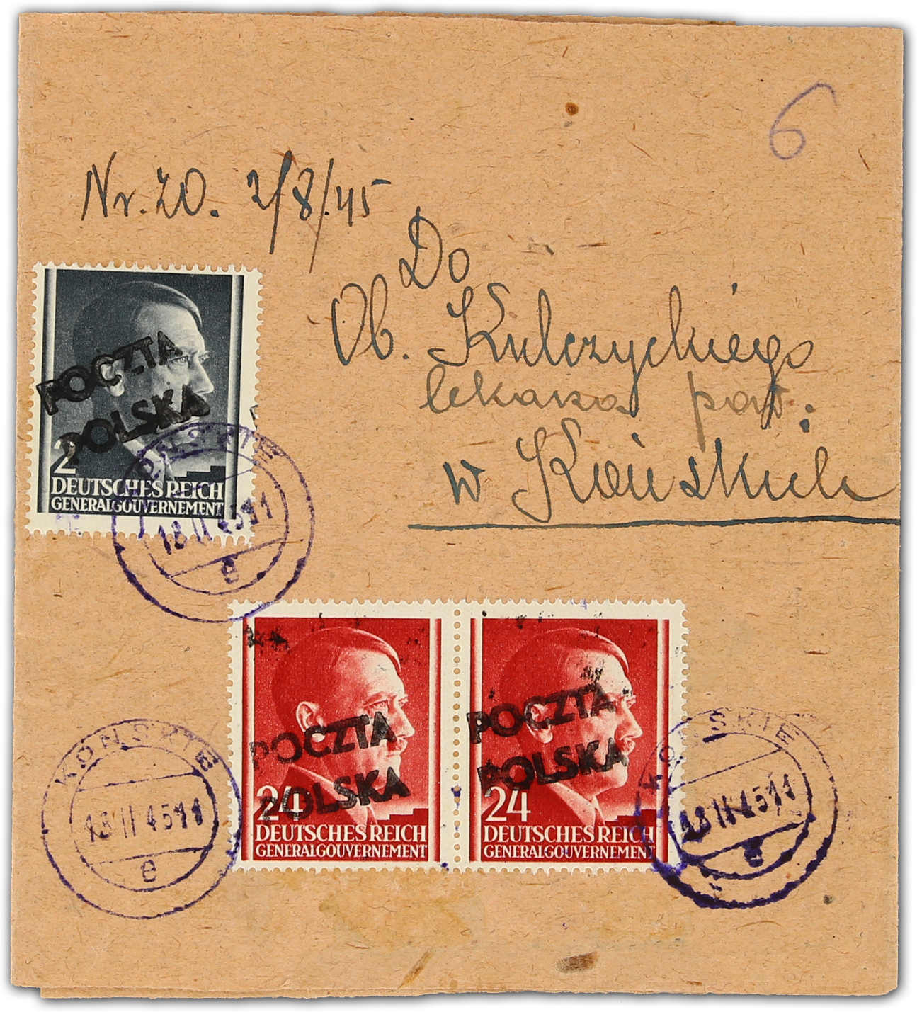 1945, 2 und 24 (2) Gr. Hitler mit zeizeiligem schwarzen Aufdruck "POCZTA/POLSKA" der Lokalausgabe von Konskie auf Streifbandsendung im Ortsverkehr befördert, aufgegeben "KONSKIE 18.II.45", rückseitig mit poln. Postzensur "707", seltener